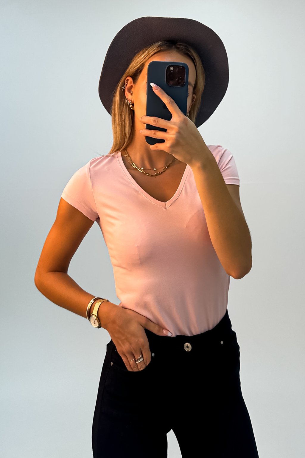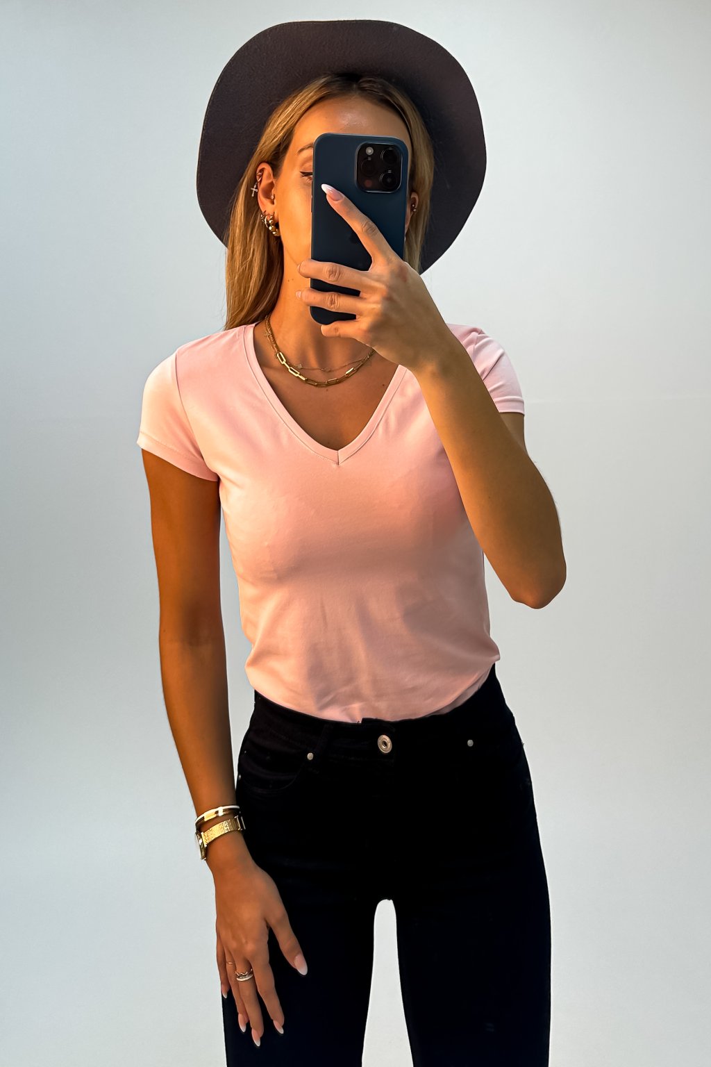 Bavlnené tričko s krátkym rukávom a V-výstrihom ružové