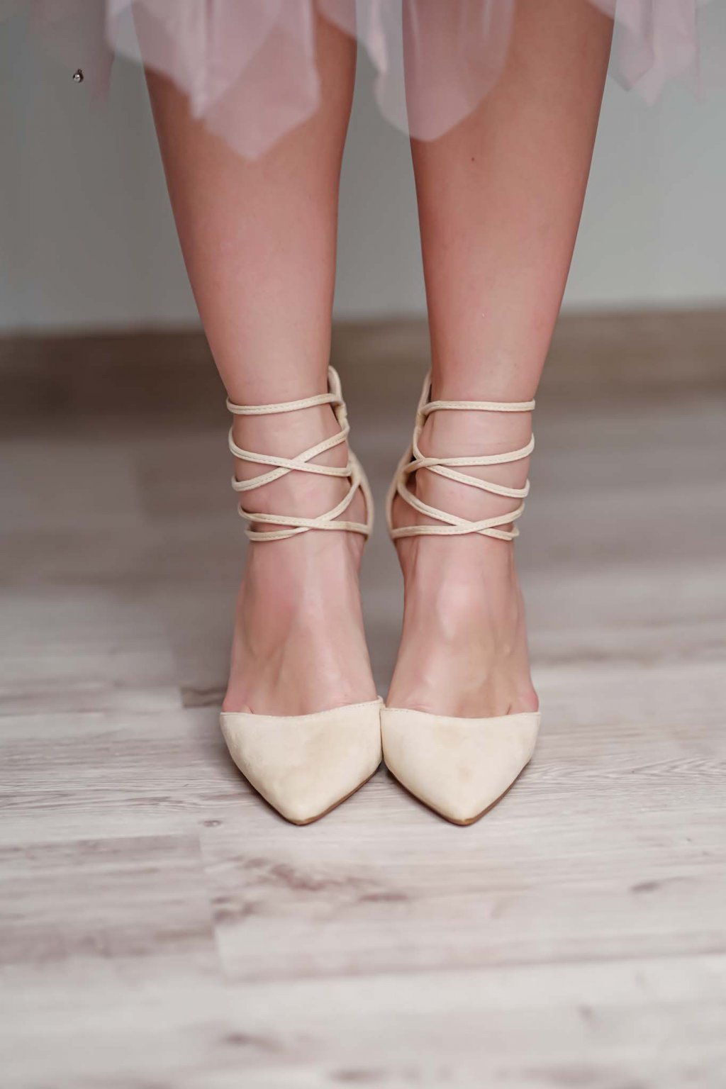 Béžové semišové lodičky s ostrou špičkou a zapínaním na zips vzadu zdobené popreplietaným lankom cez gumičky zaisťujúce pohodlie.