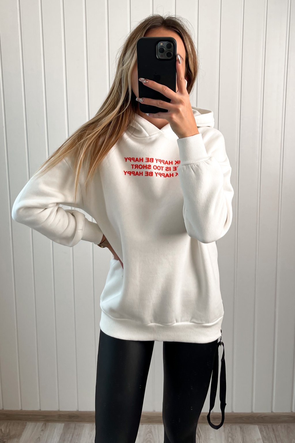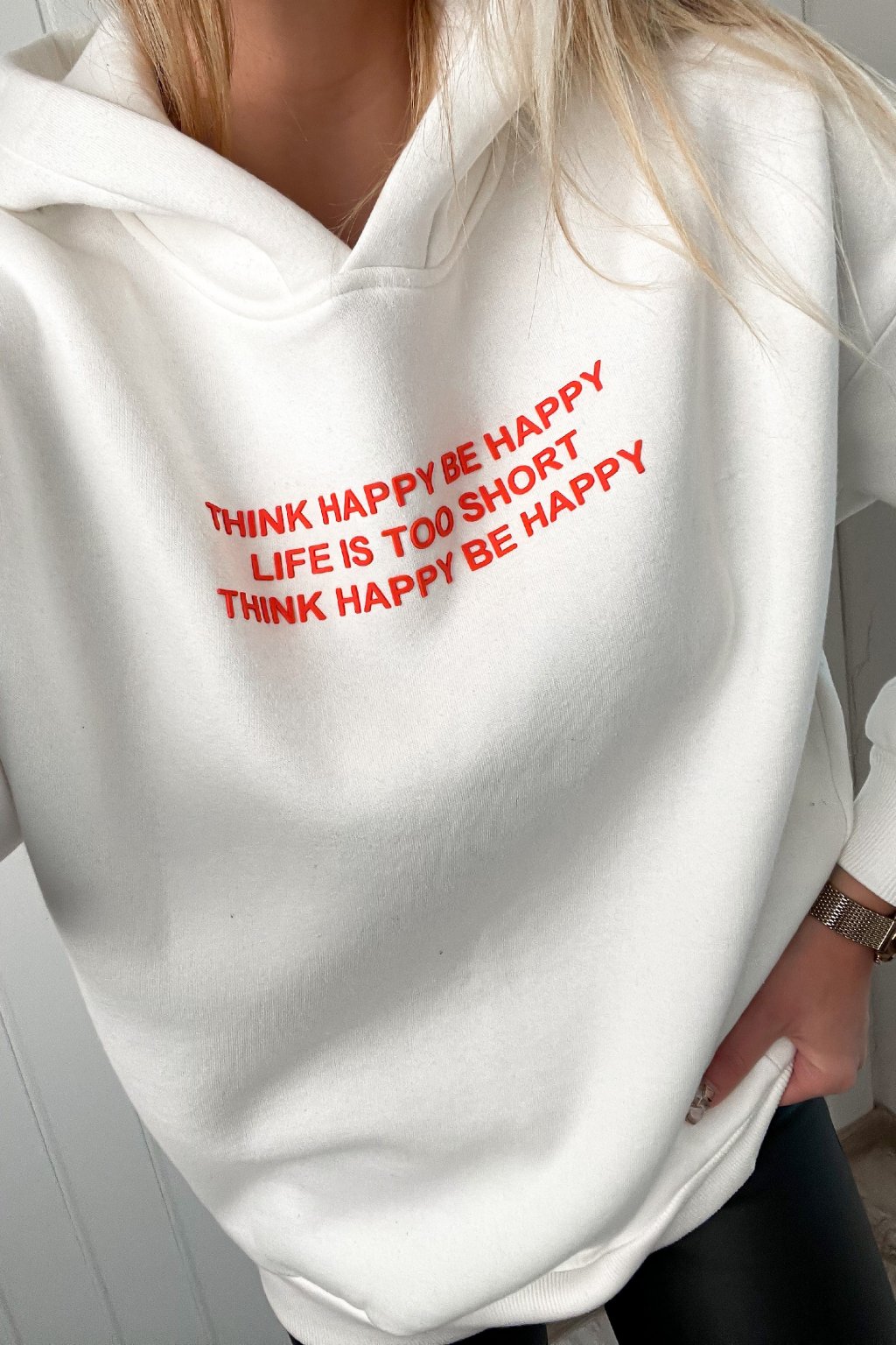 Biela mikina s kapucňou a funkčným zipsom na bočnej strane. S nápisom "think happy be happy life is too short think happy be happy"