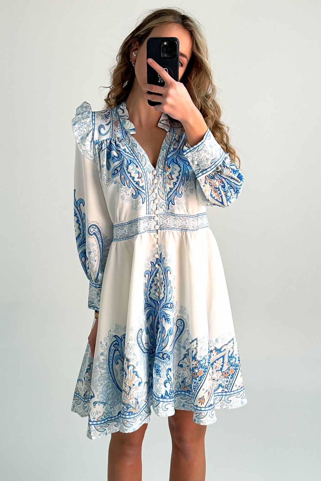 Bielo-modré spoločenské šaty v A-strihu s dlhým rukávom