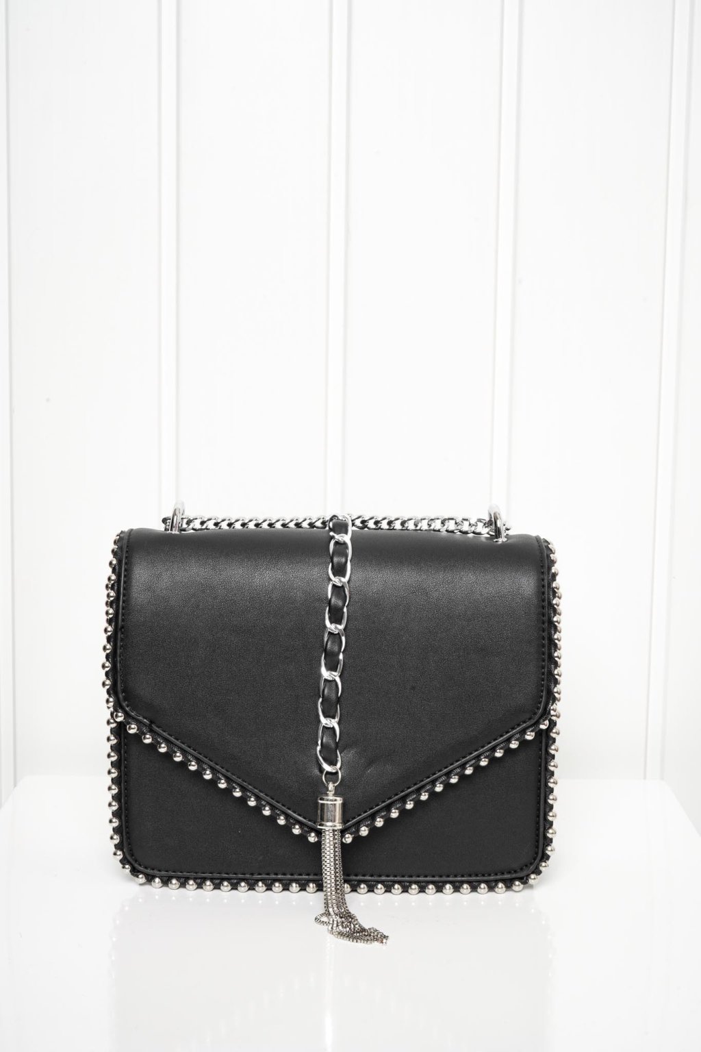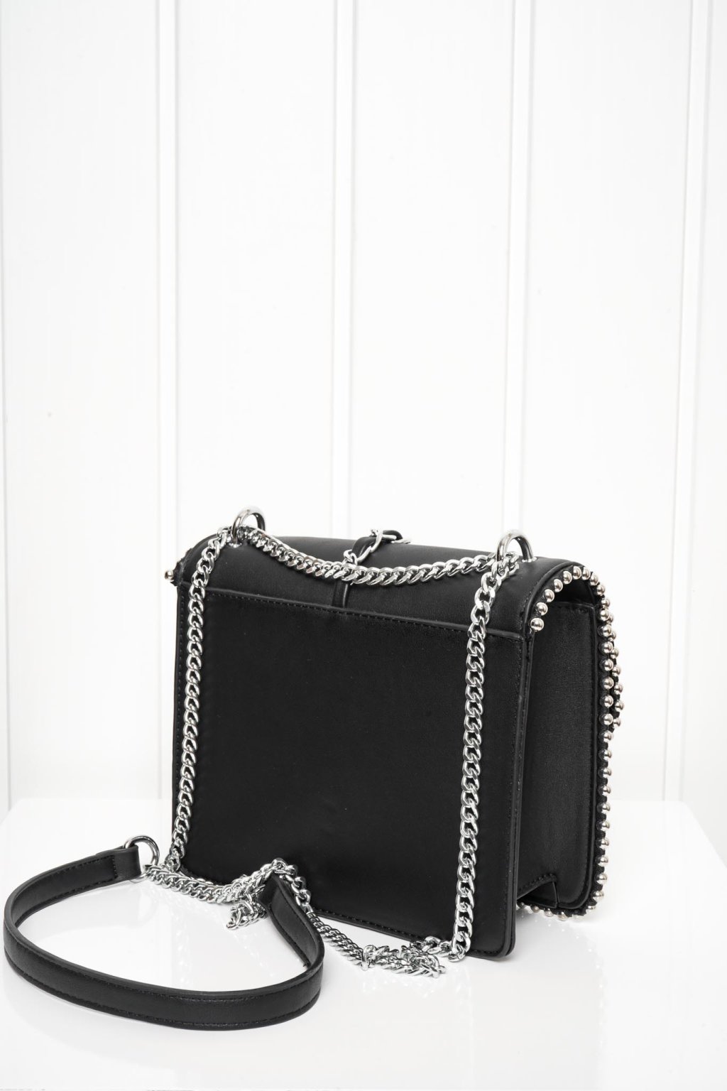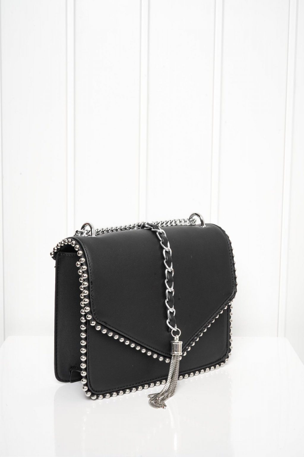 Kabelka v čiernej v kombinácii so strieborným guličkovým lemovaním, striebornými kovaniami a retiazkovou dlhou rúčkou.
