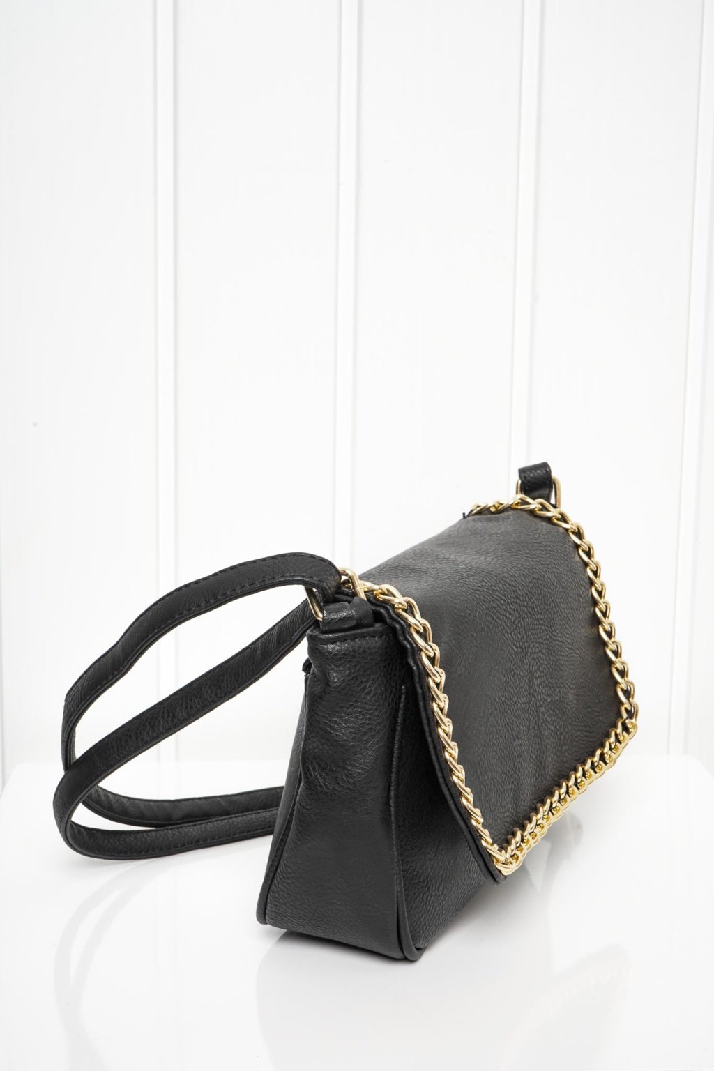 Čierna kabelka lemovaná zlatou retiazkou s nastaviteľným ramienkom a zapínaním na magnet a zips.