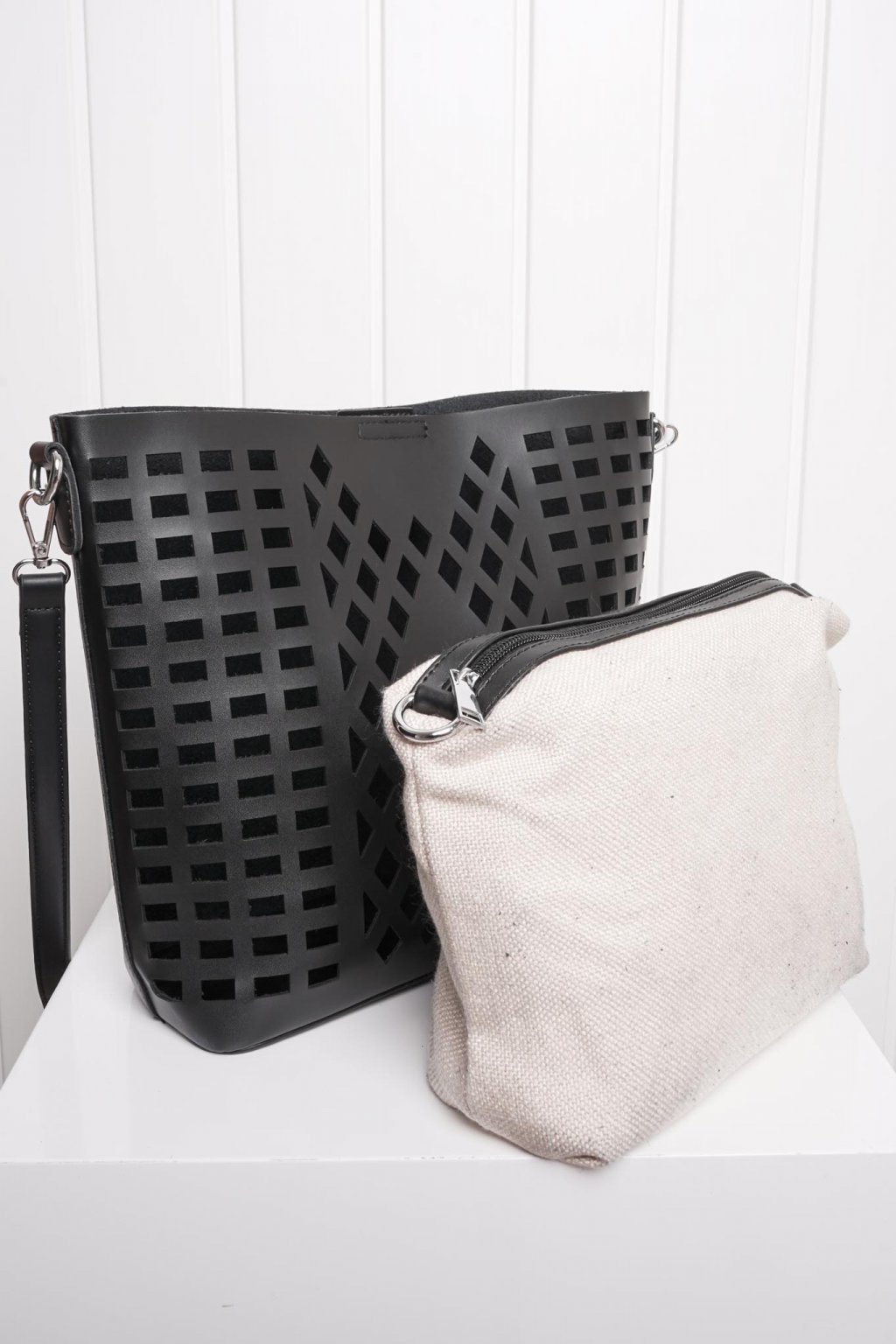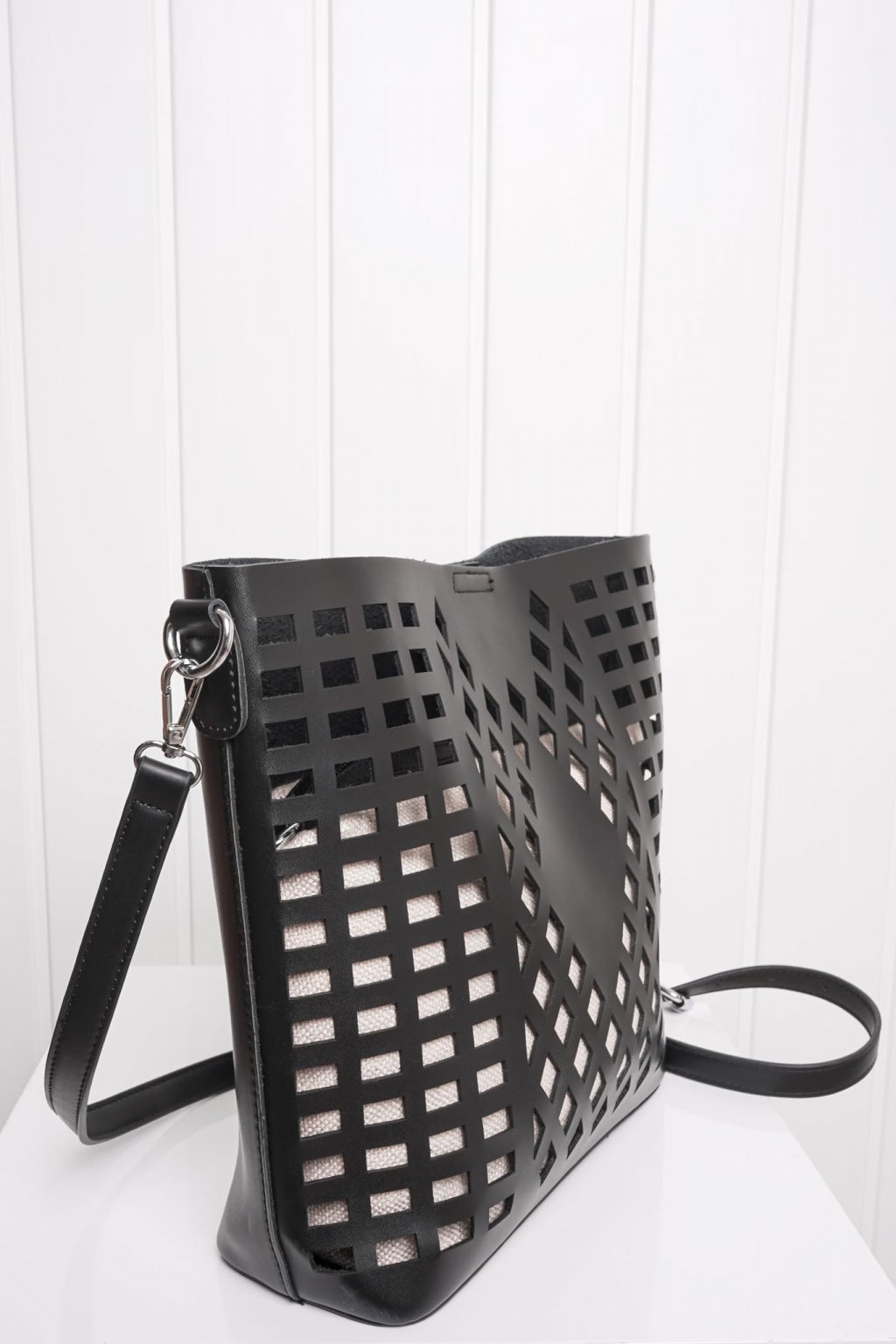 Výhodou je nastaviteľné dlhé ramienko, ktoré si môžete pripnúť aj na vnútornú kozmetickú taštičku z vrecoviny. Vyrezávaný vzor zvýrazní každý váš outfit.