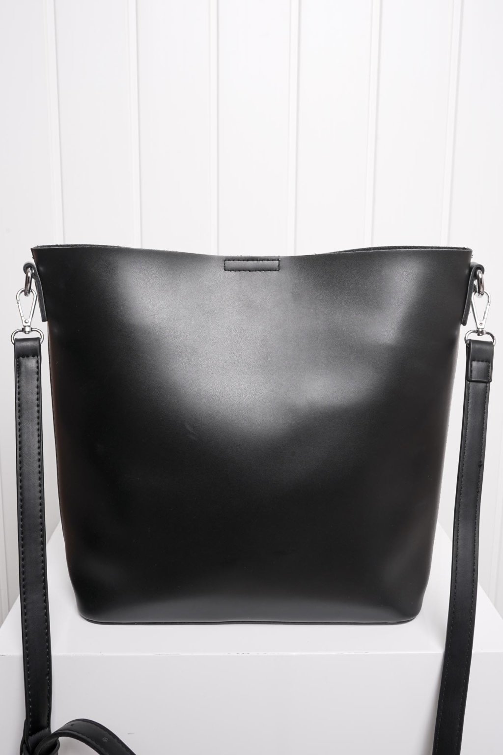 Čierna vyrezávaná crossbody kabelka s otvoreným priestorom vyplneným kozmetickou taštičkou a zapínaním na magnet.