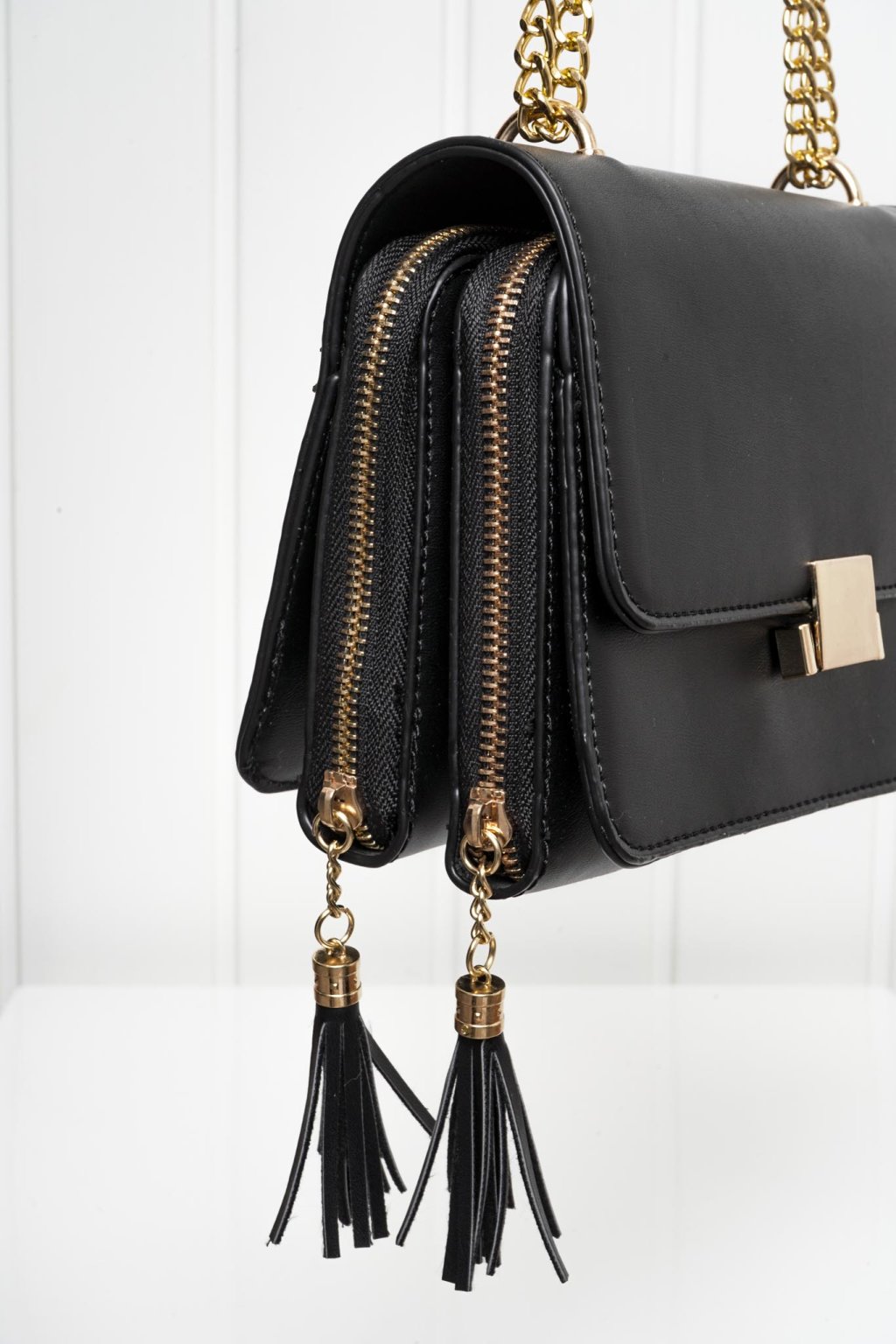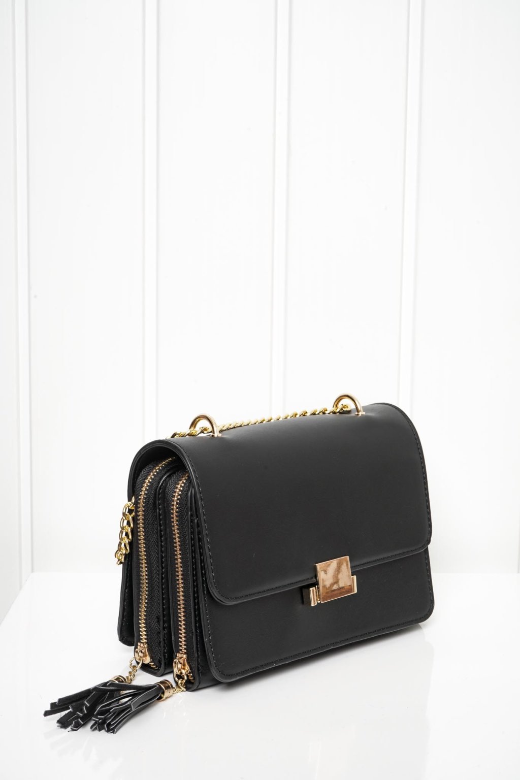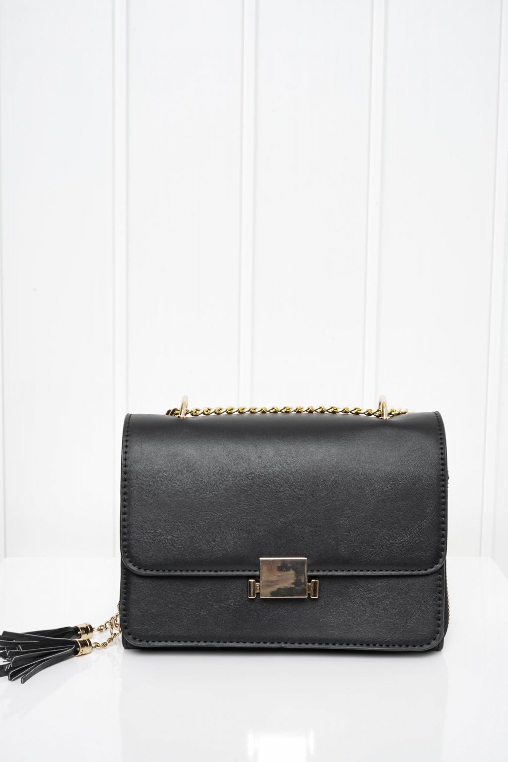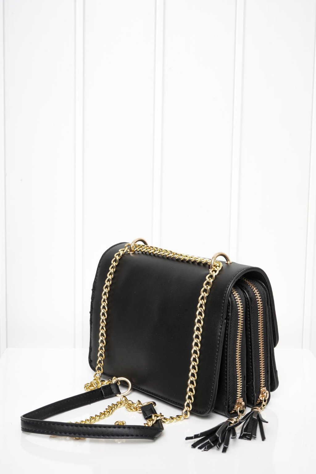 Crossbody kabelka v čiernej farbe sa zapína stlačením zlatého zapínania je zdobená čiernymi strapčekmi a zlatým kovaním.