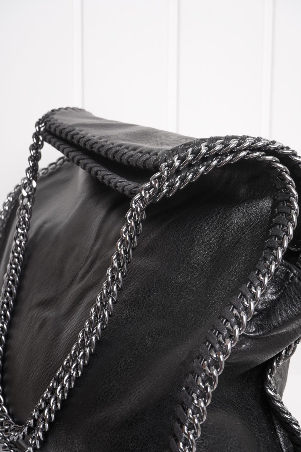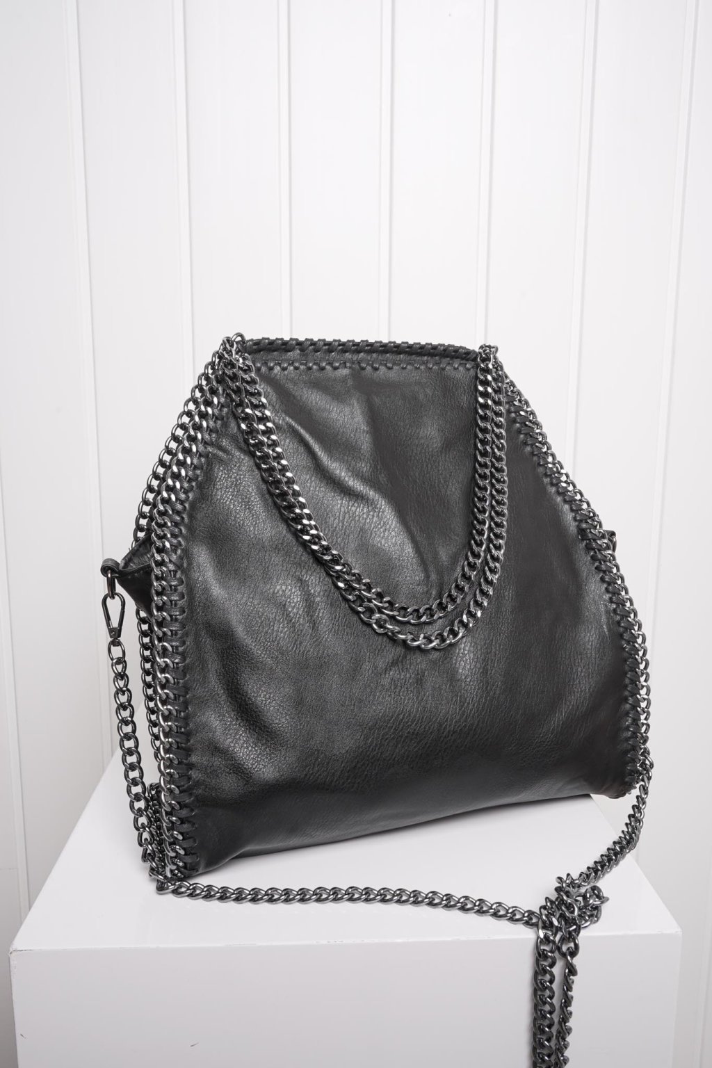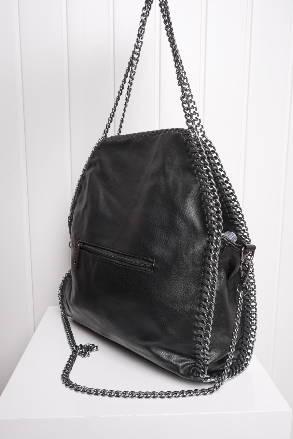 Čierna kabelka z imitácie kože lemovaná reťazou s retiazkovými rúčkami a zapínaním na zips.