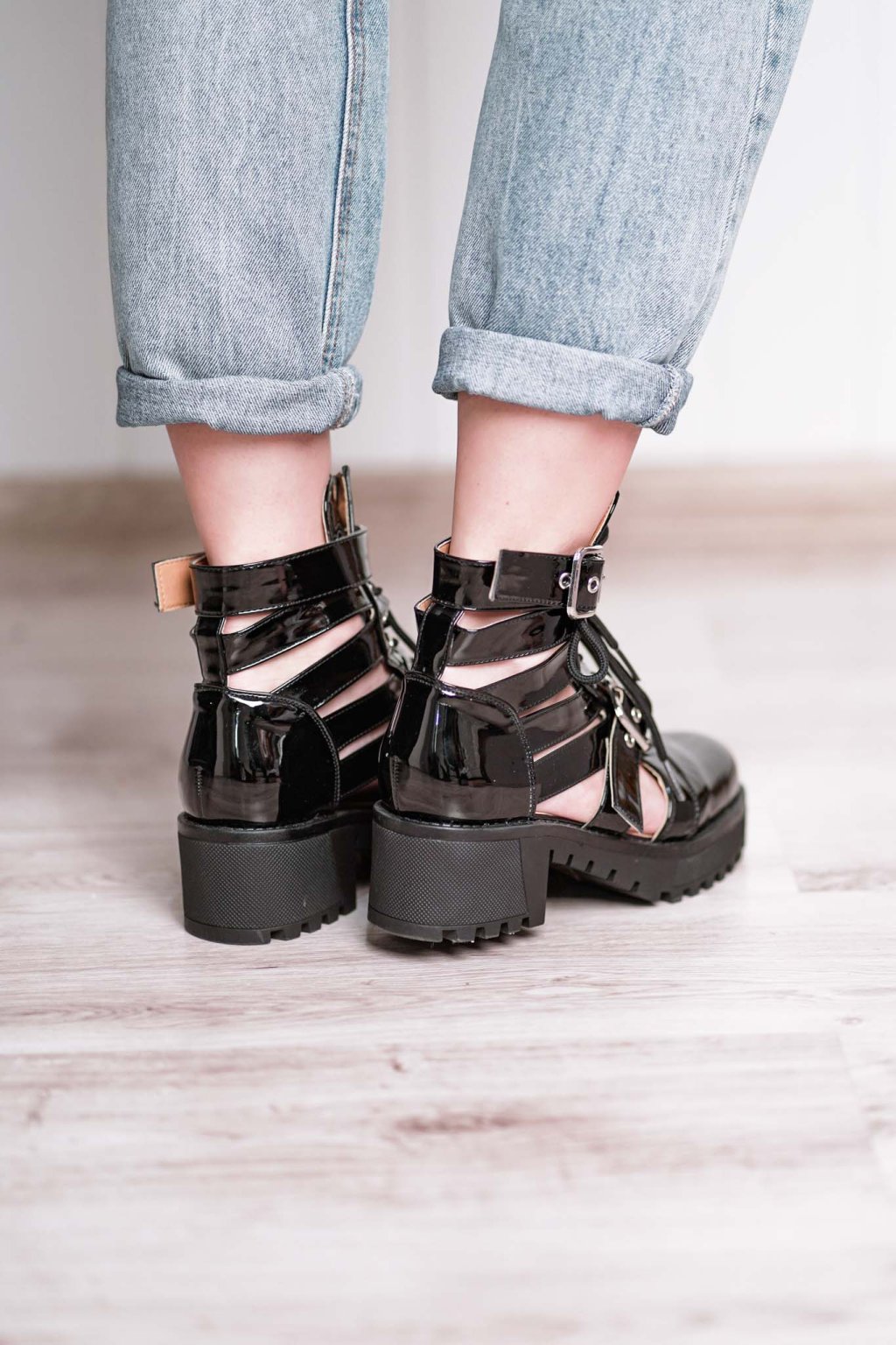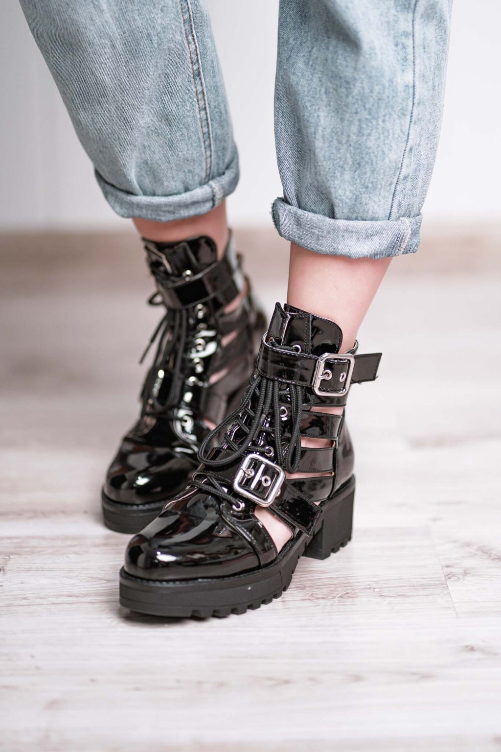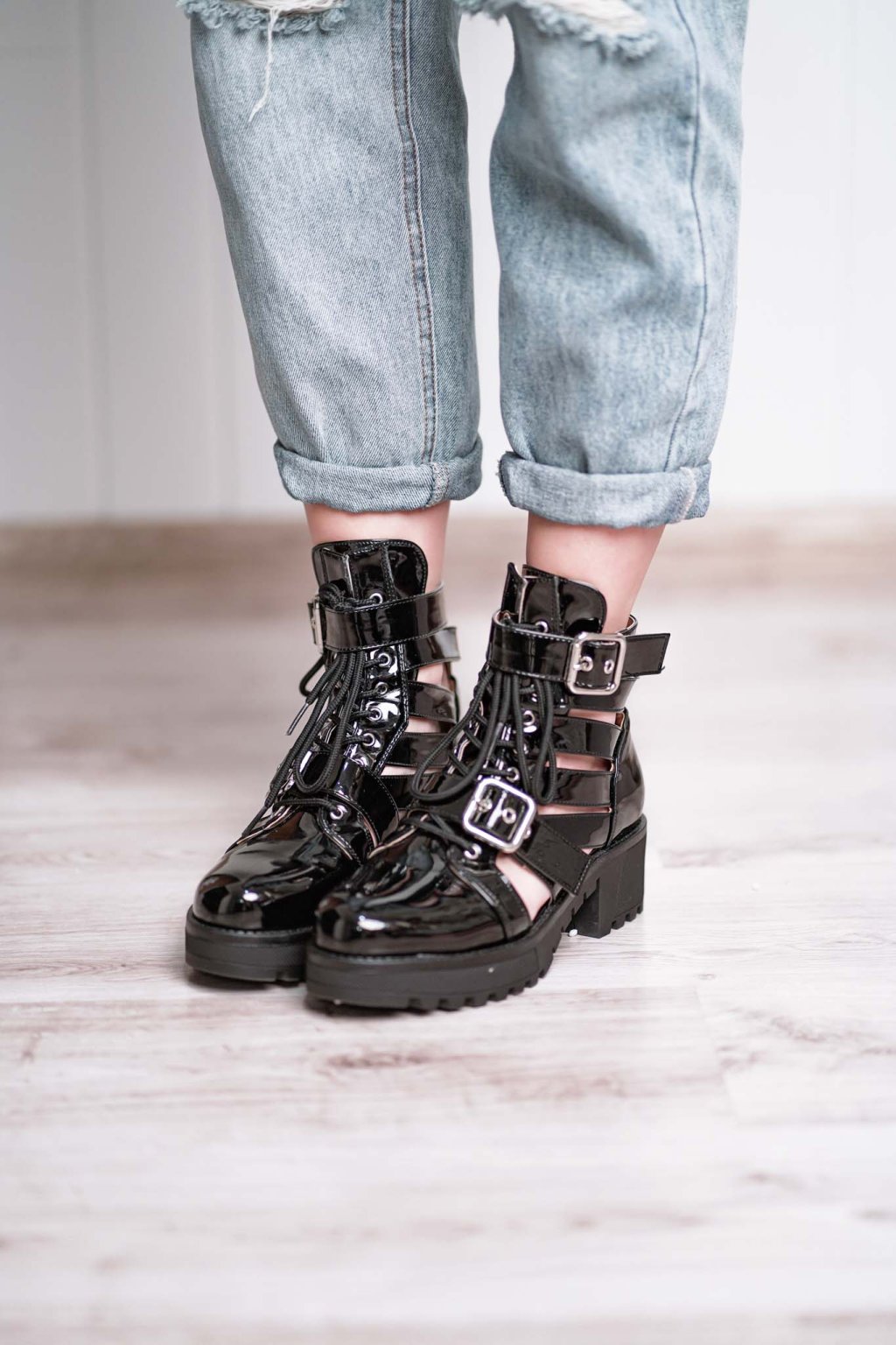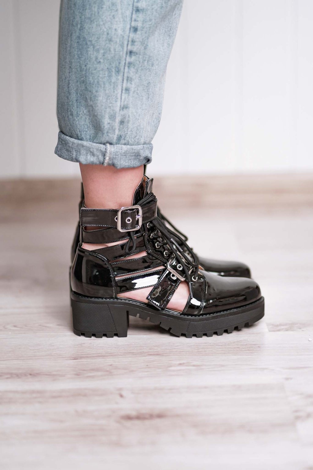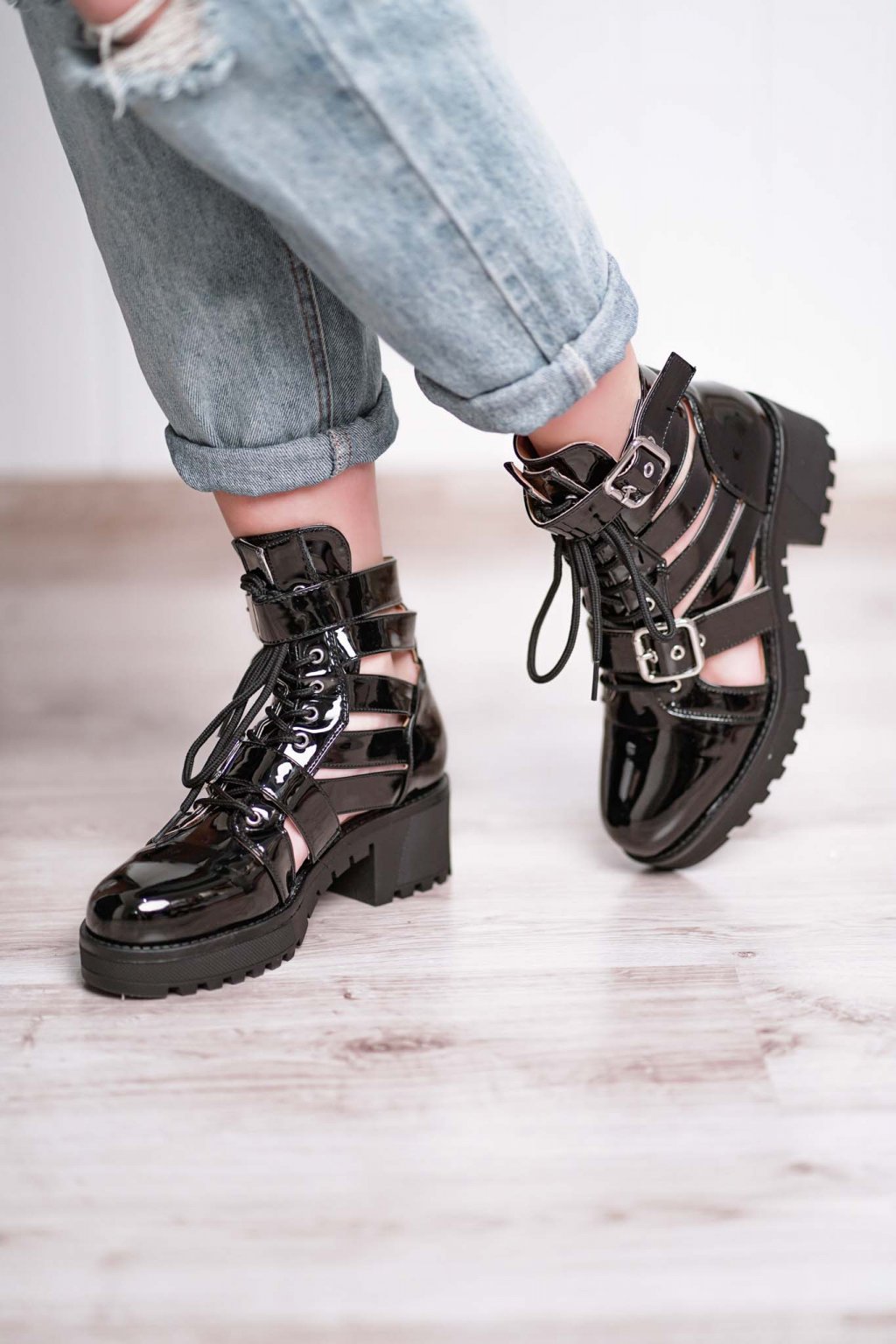 Vzdušné členkové čižmičky z lakovanej napodobeniny kože na 5 centimetrovom podpätku a platformovej podrážke so zapínaním pomocou šnurovania a nastaviteľnej pracky.