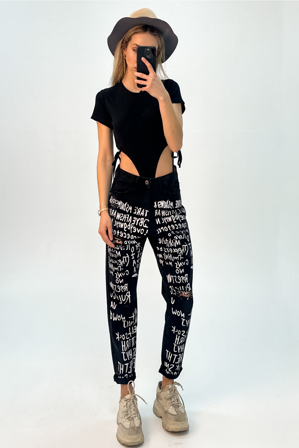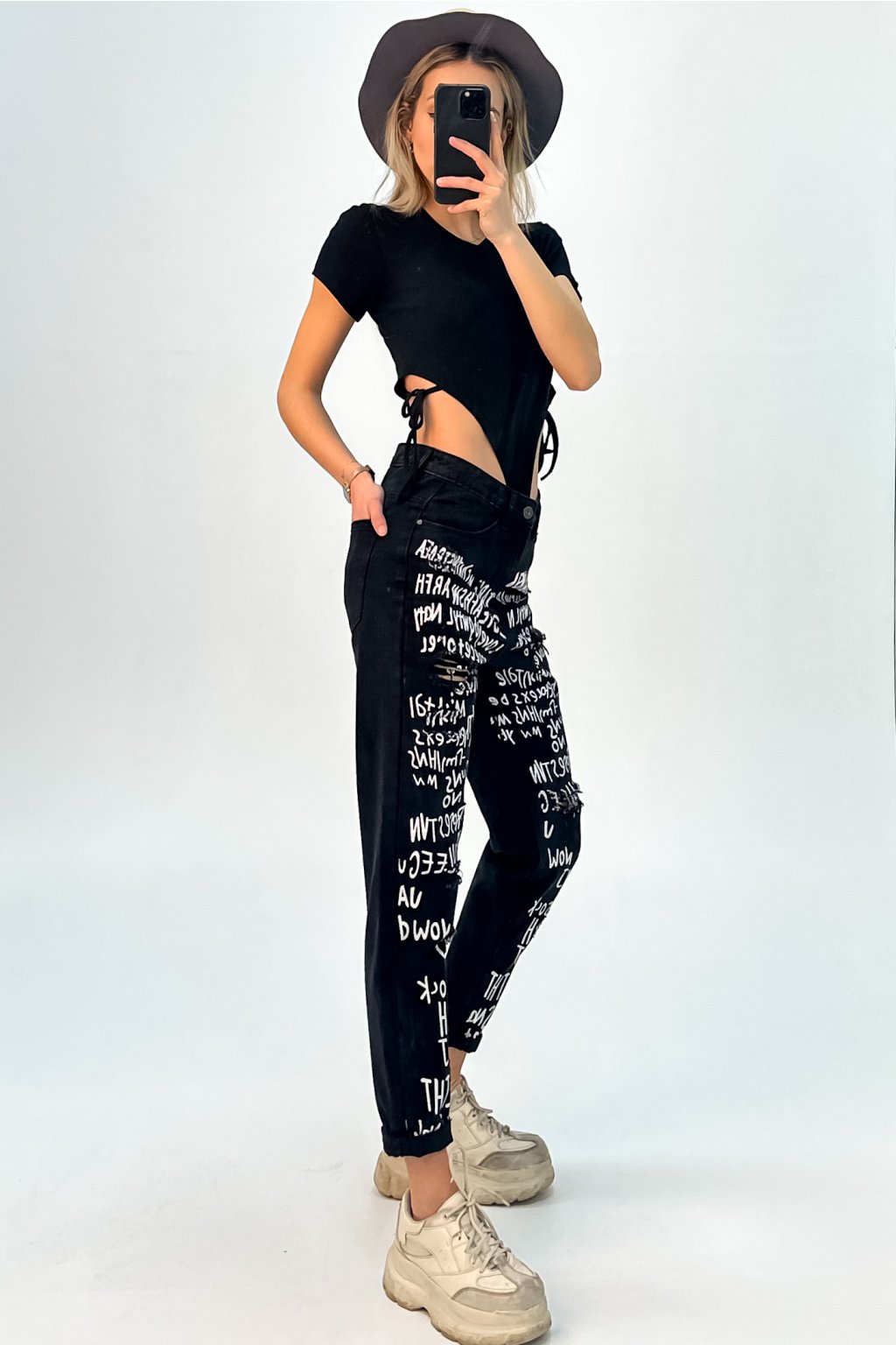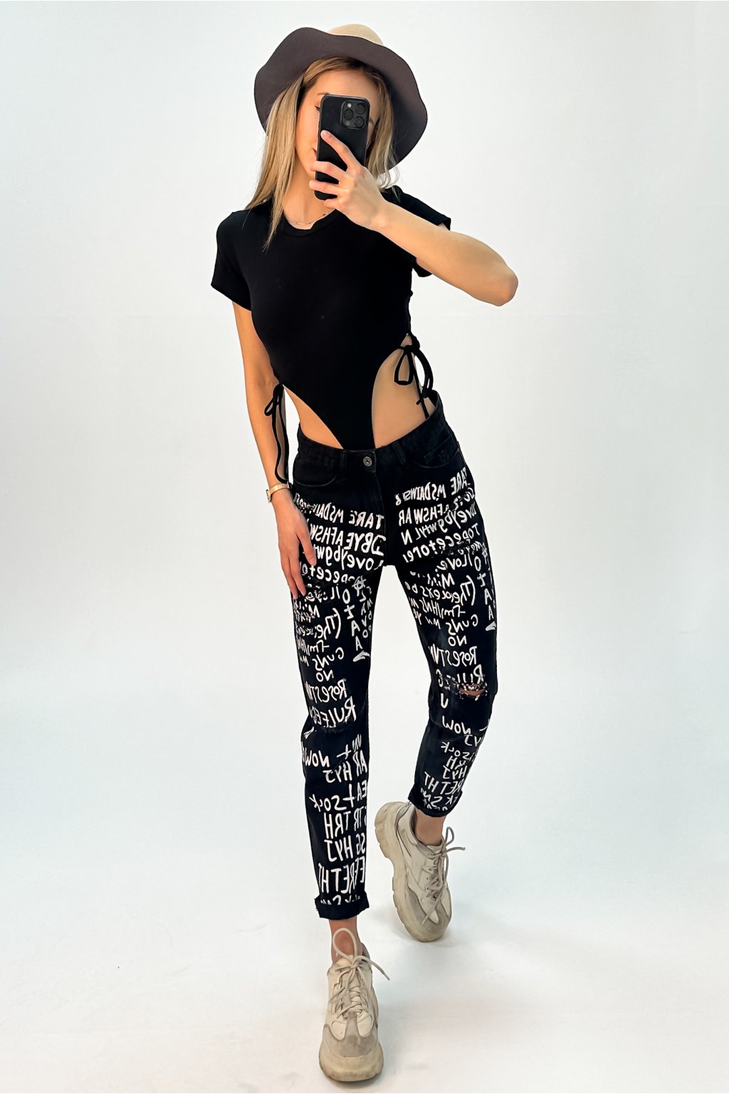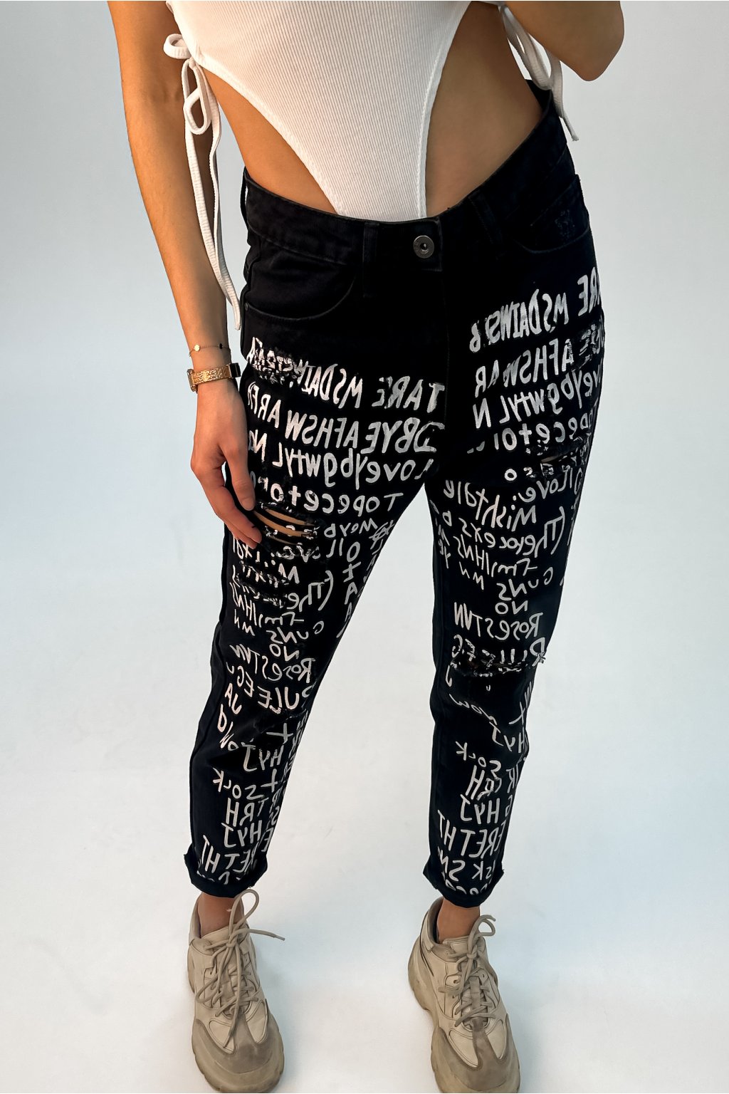 Čierne džínsy s bielym textom s dierami v strihu mom fit.