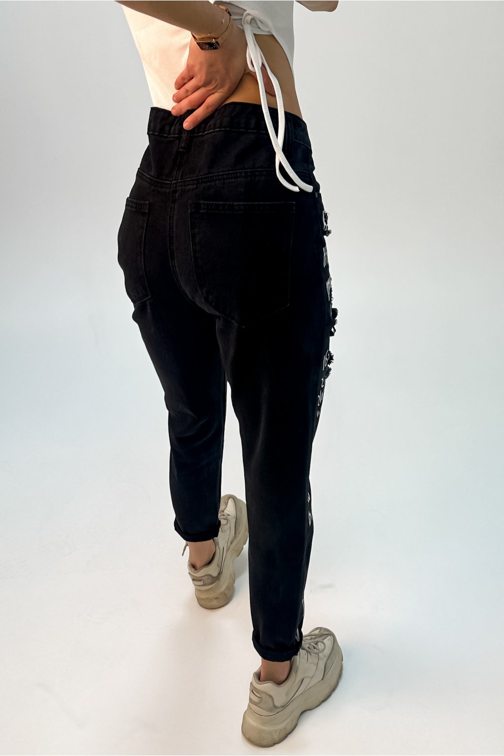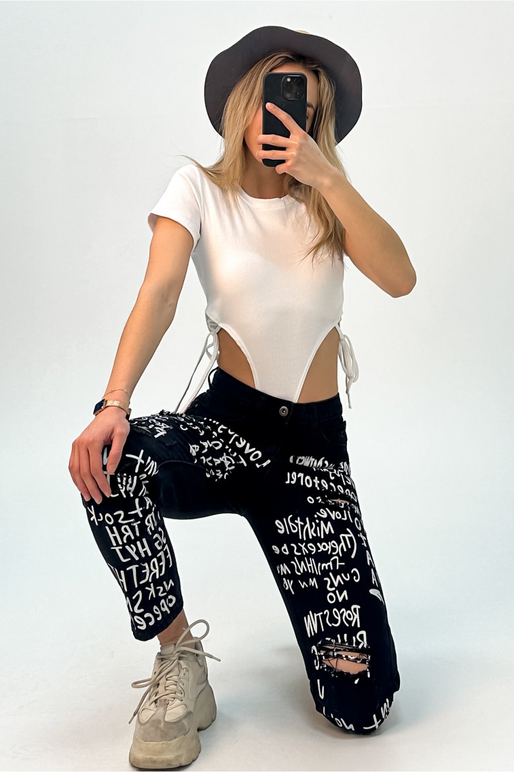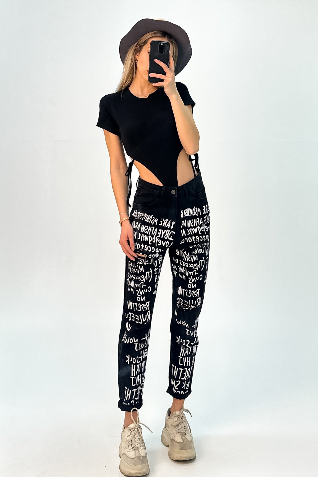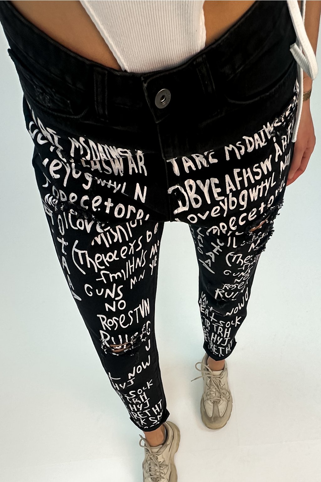 Čierne džínsy s bielym textom s dierami v strihu mom fit.