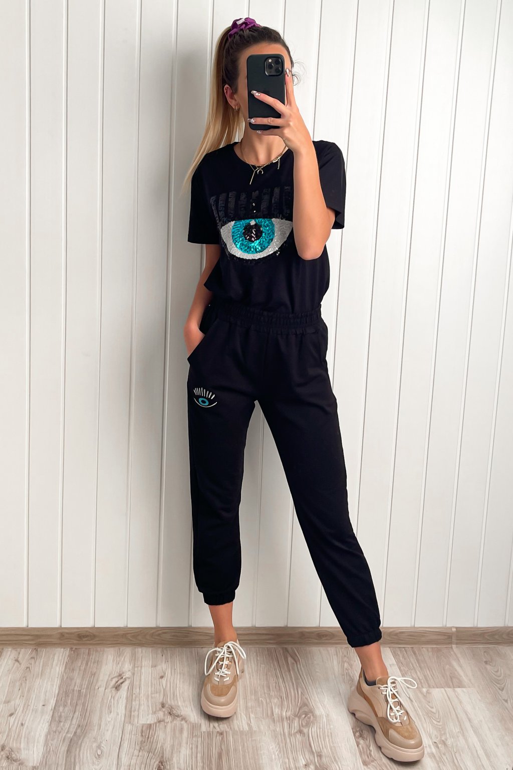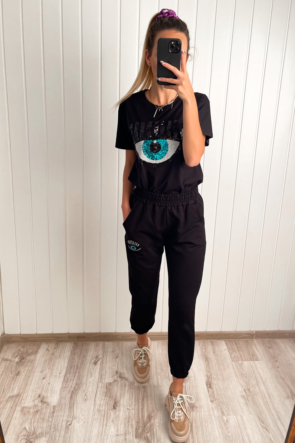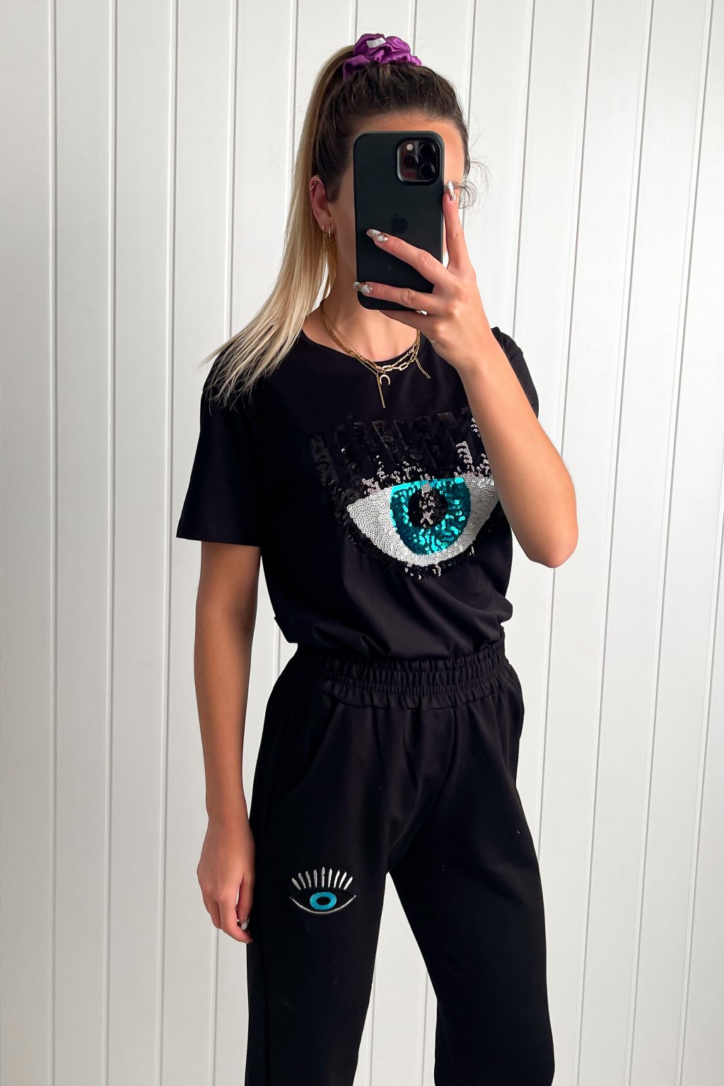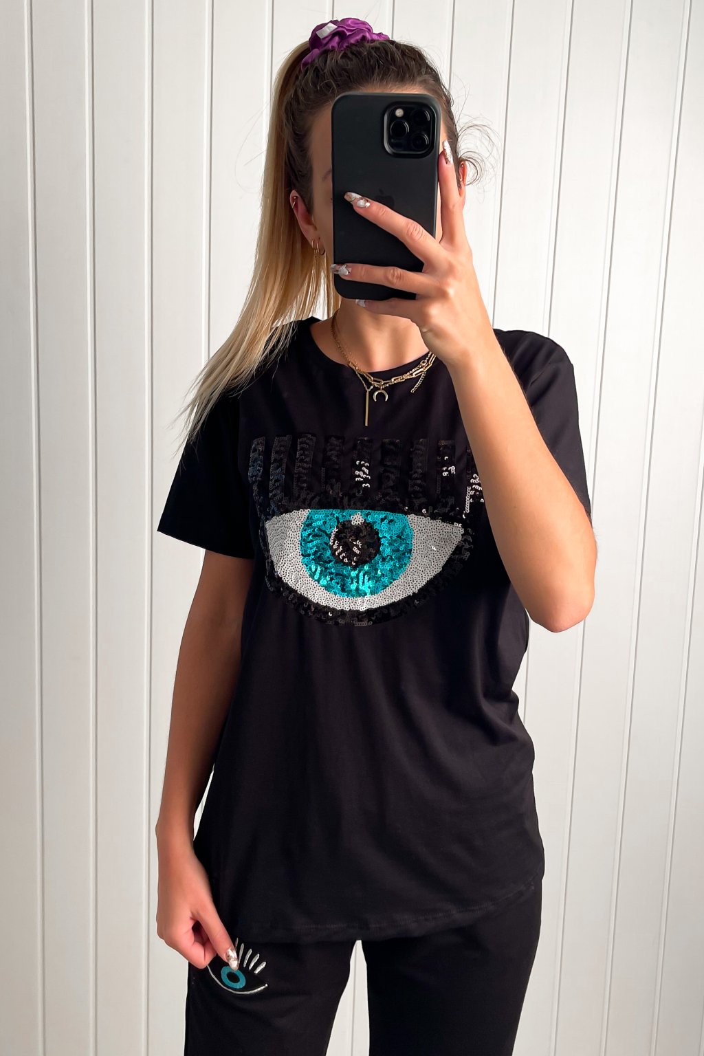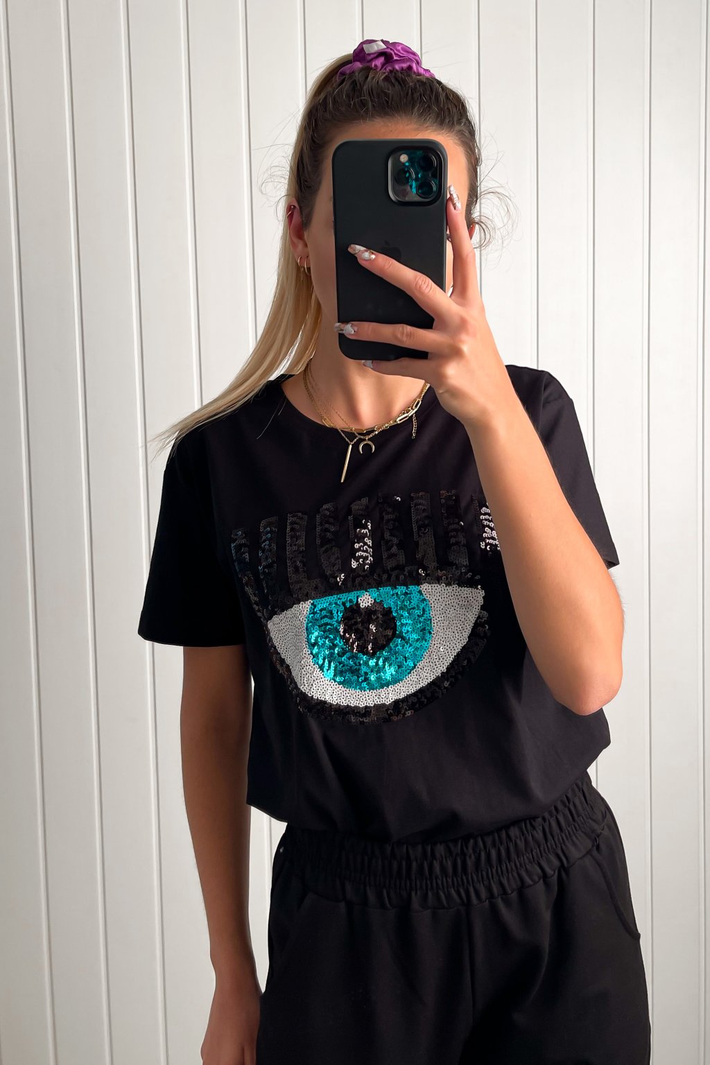 Čierne bavlnené tričko s farebným dizajnom zdobeným prišívanými flitrami.