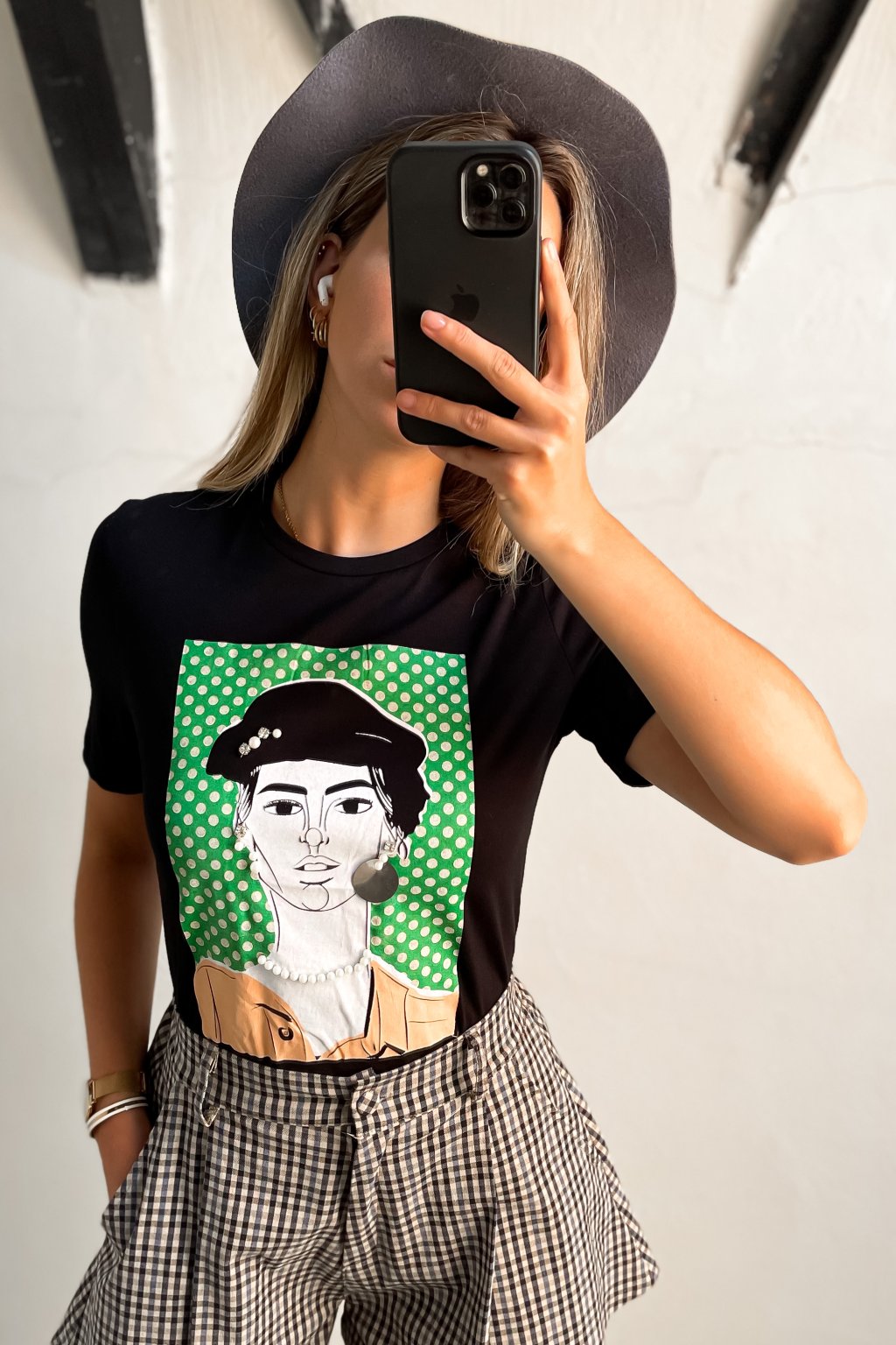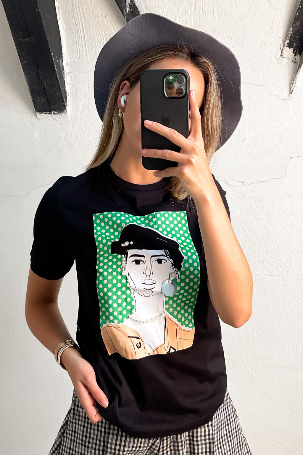 Čierne bavlnené tričko s potlačou a nabitými aplikáciami.