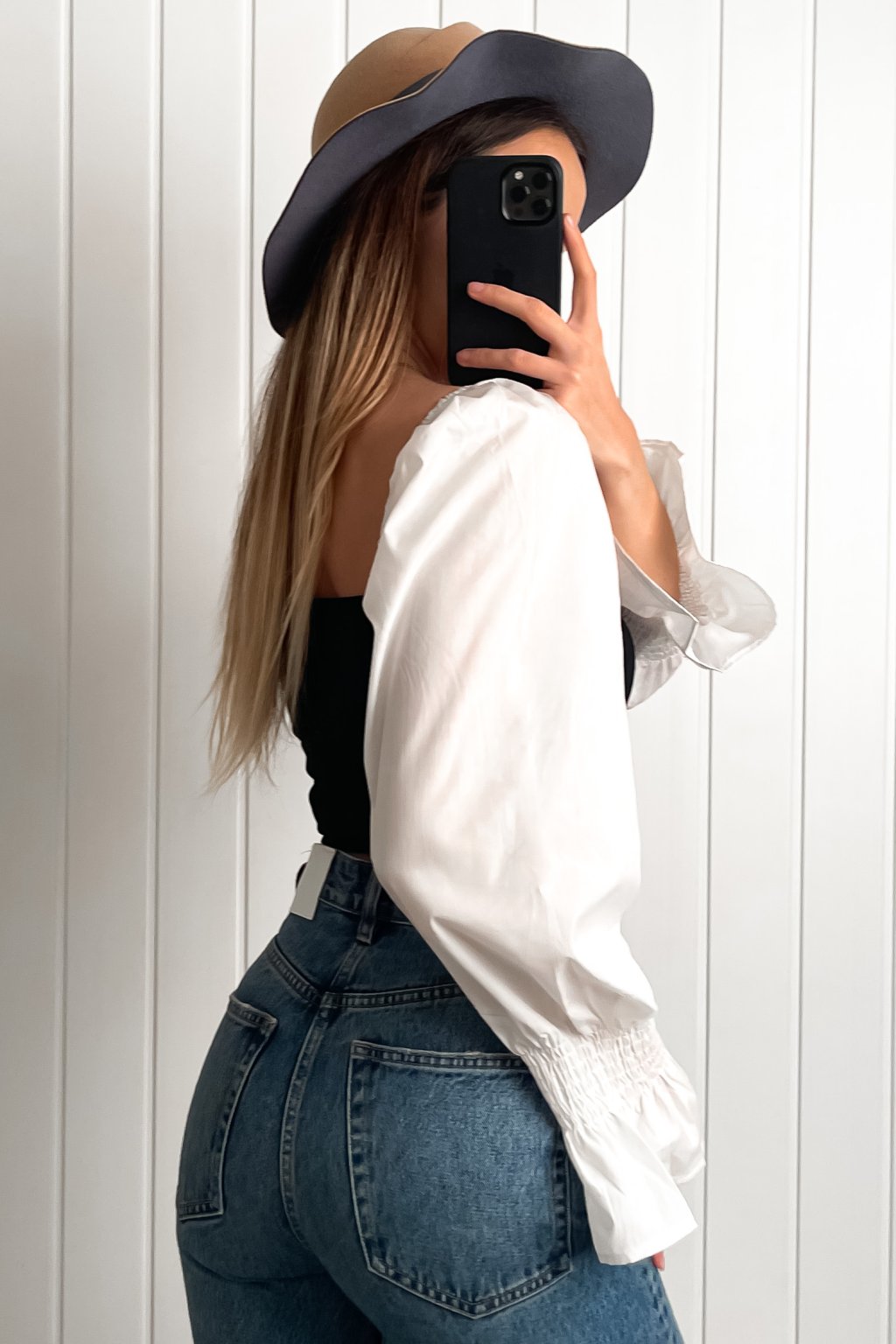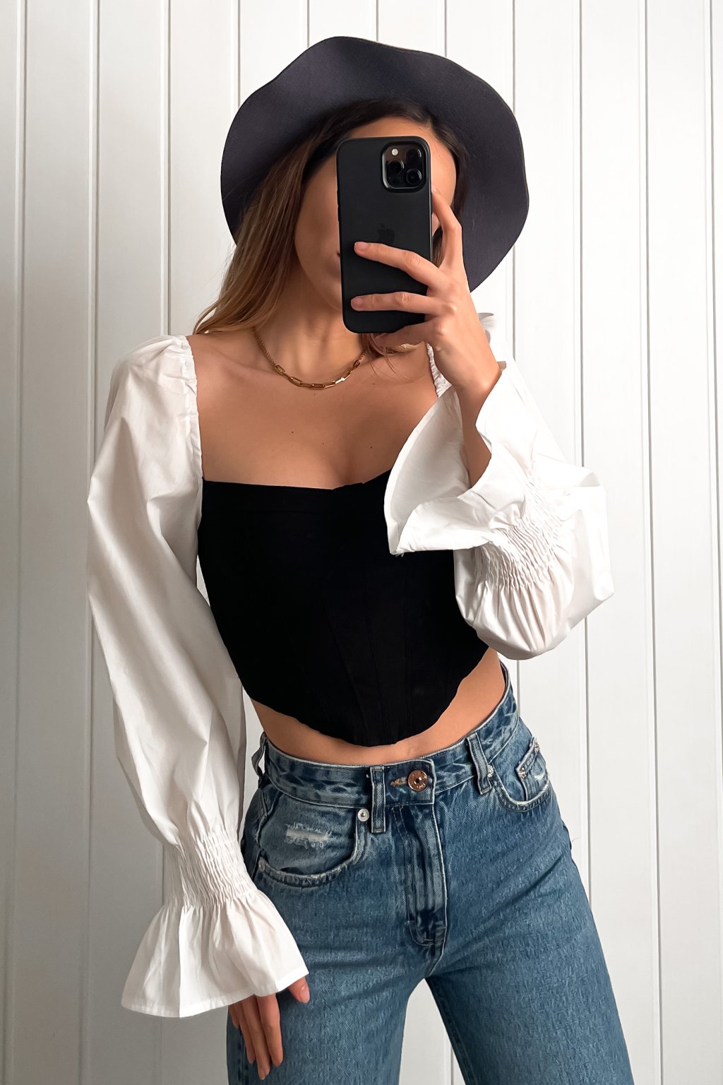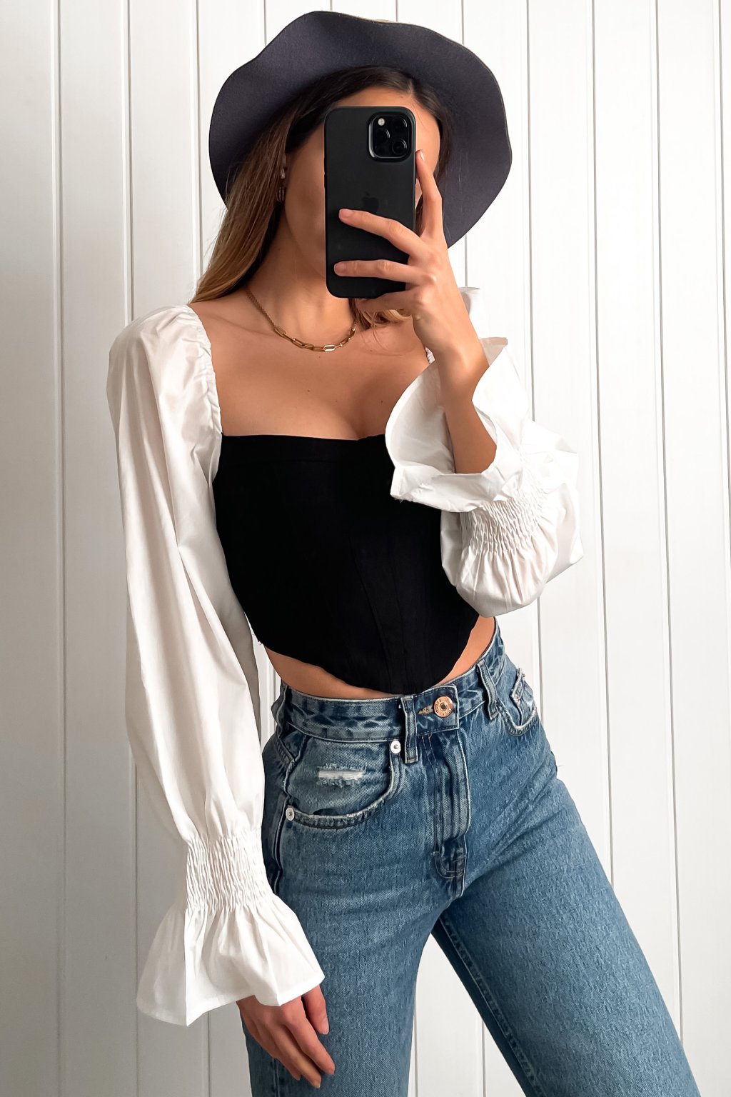 Čierno-biely crop-top s puff rukávmi