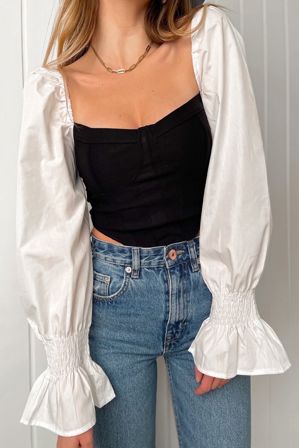 Biely crop-top v korzetovom štýe z elastického materiálu s puff rukávmi ukončenými volánom.