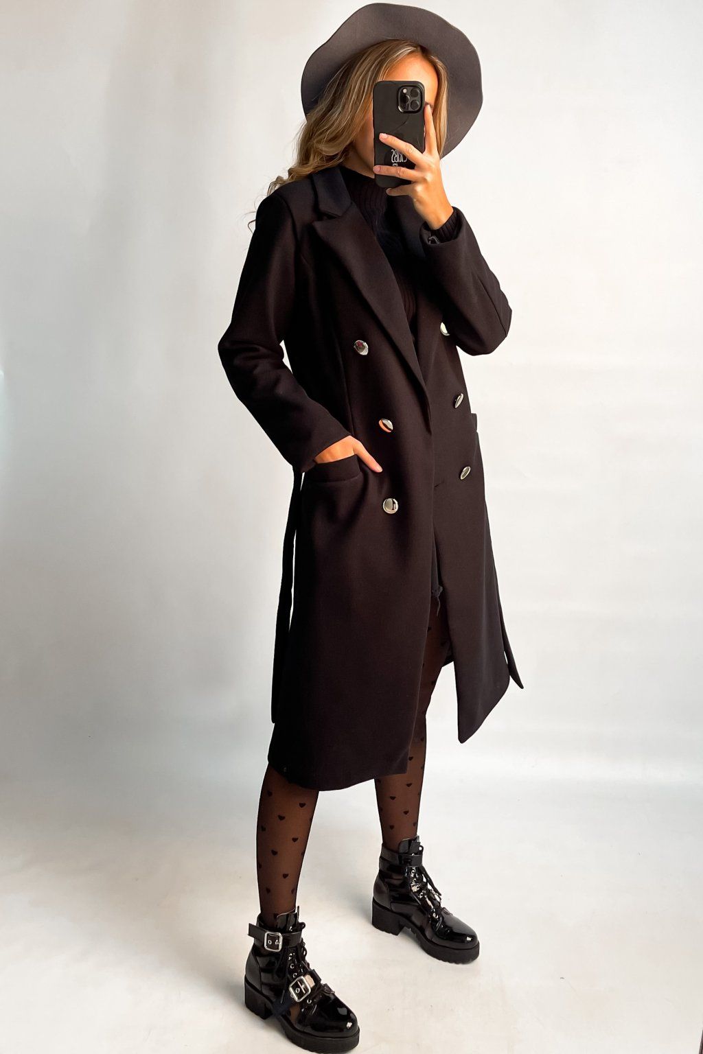 Čierny kabát s viazaním čierny