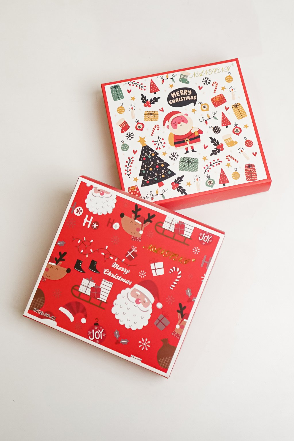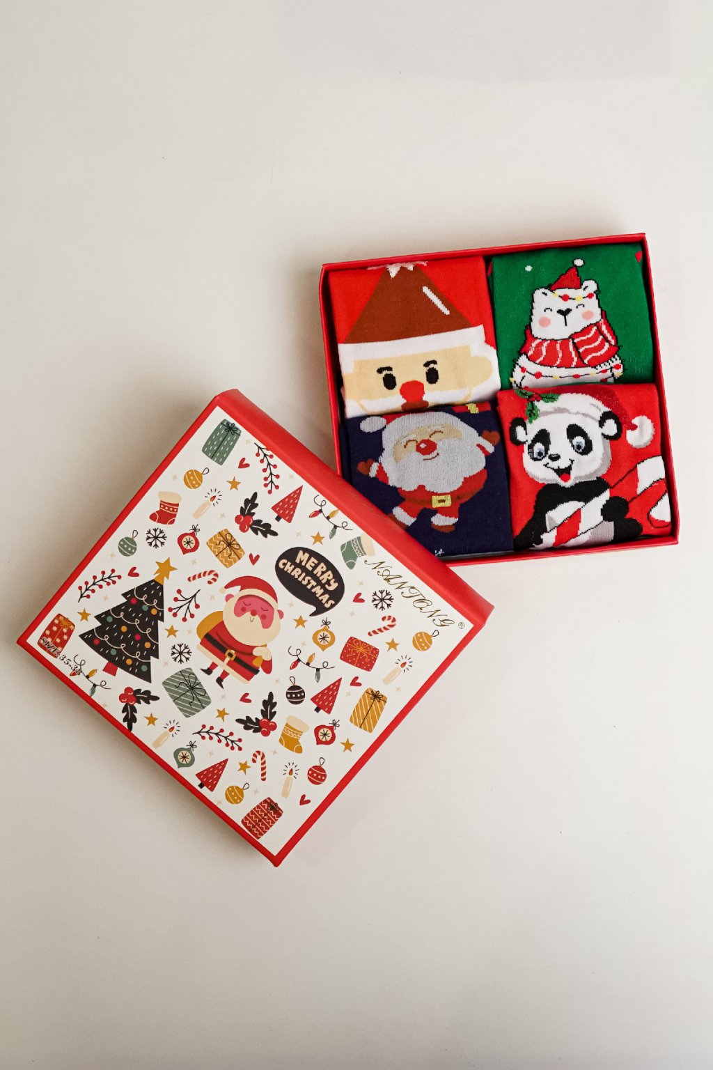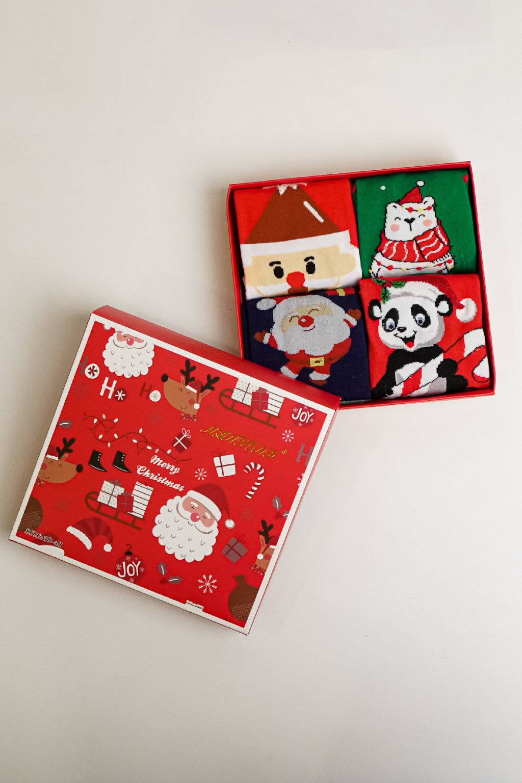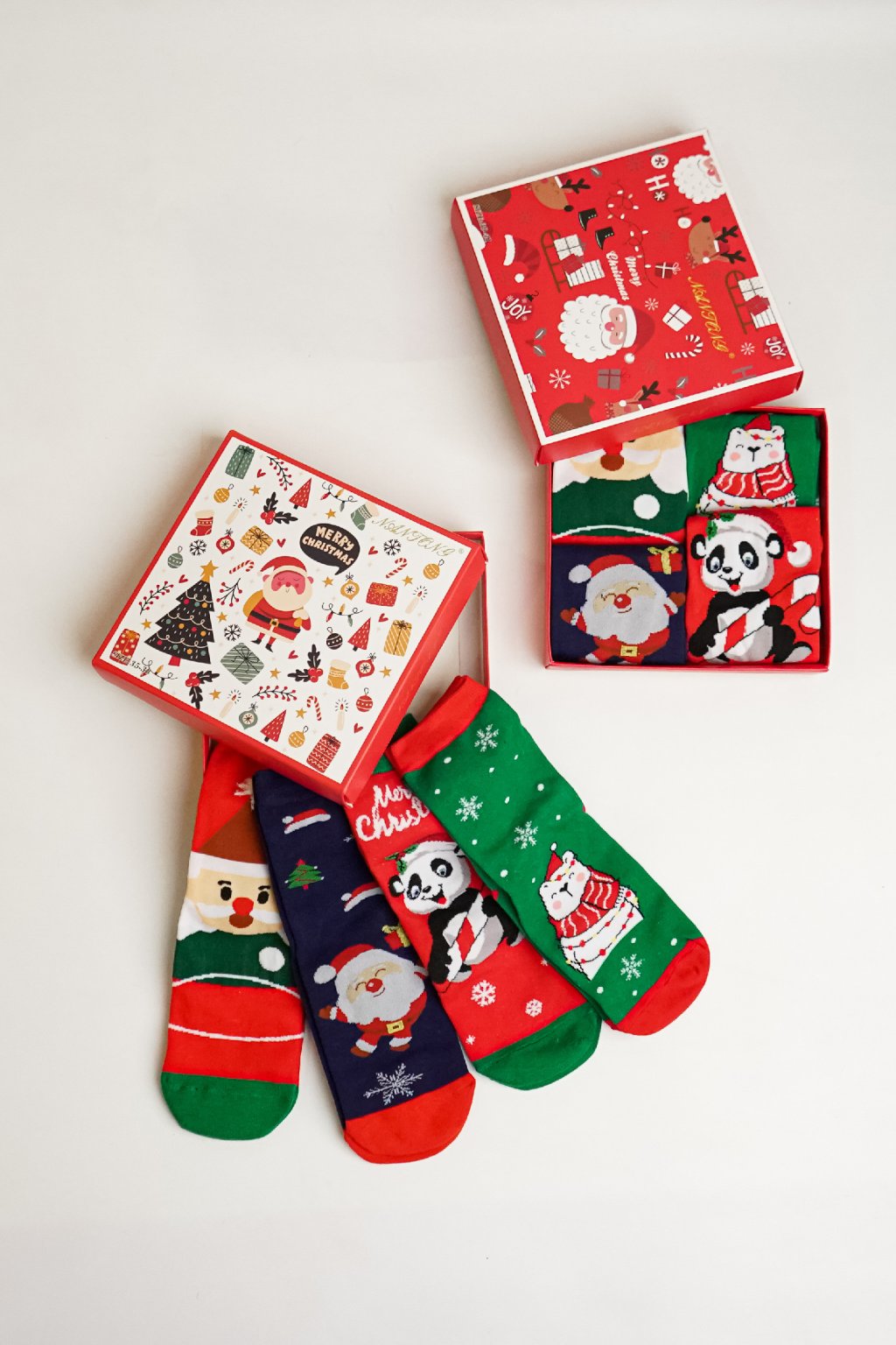 Vianočná darčeková krabička so štyrimi pármi dámskych ponožiek. Objednajte si. menšiu veľkosť v bielej krabičke a väčšiu v červenej.
