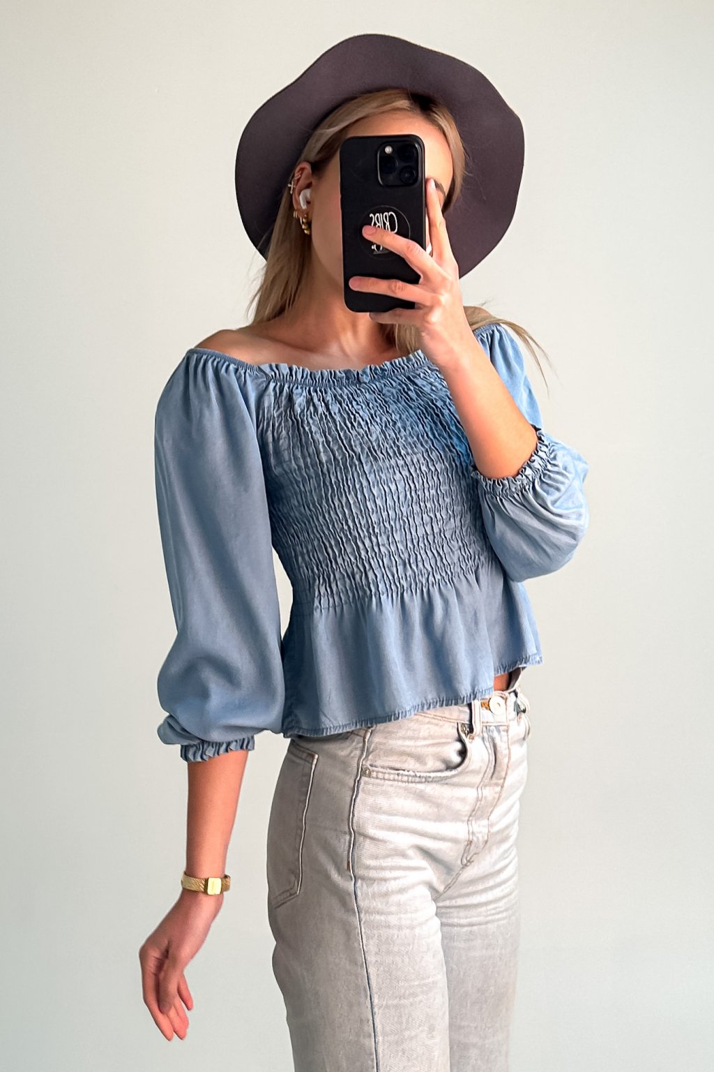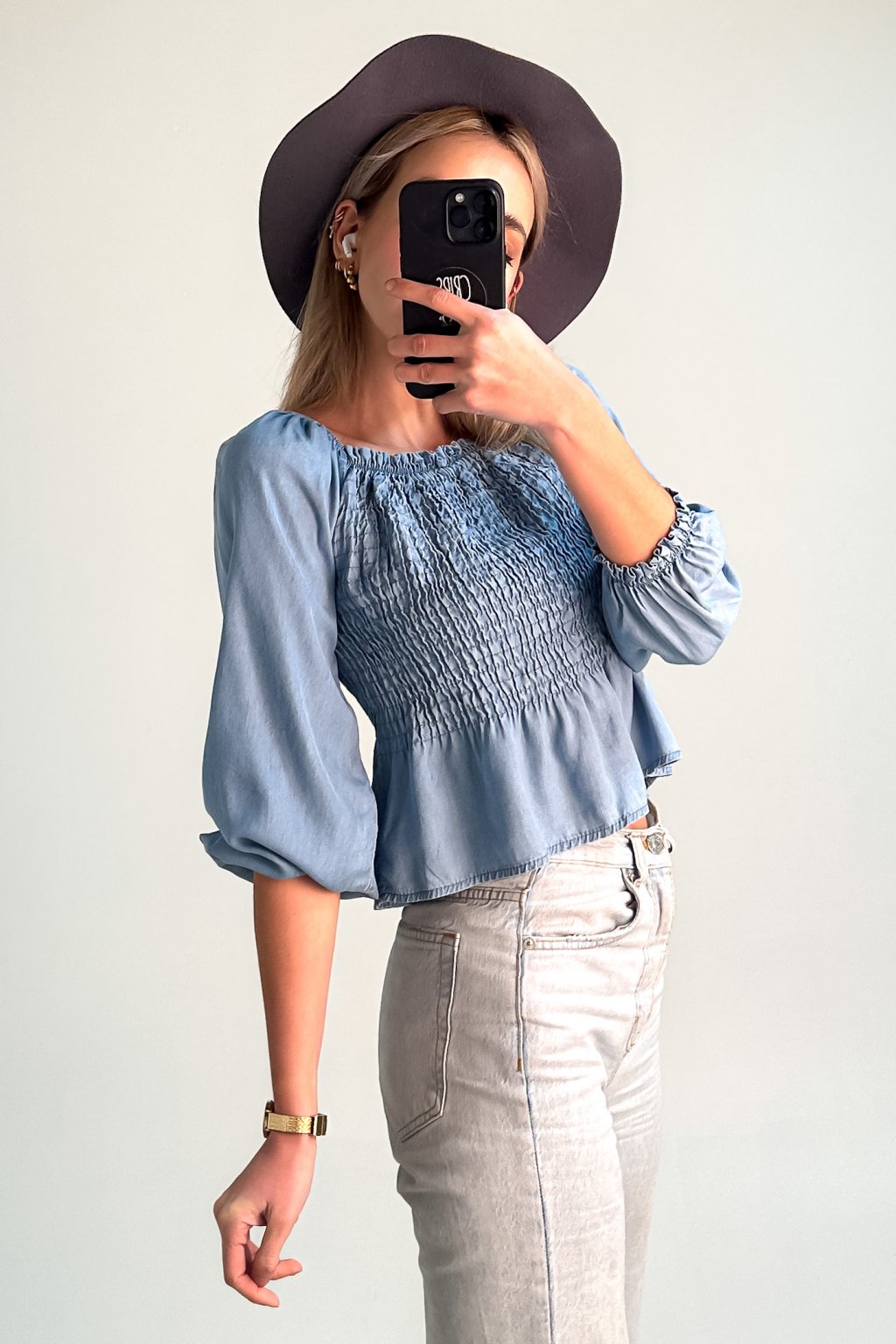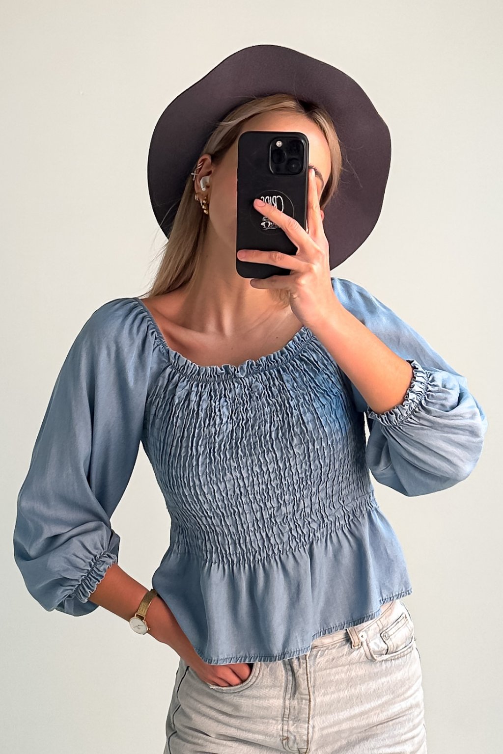 Denimový skrátený top v modrej farbe s puff rukávmi ukončenými gumičkou a gumou cez prsia pre maximálne pohodlie. Top je vyrobený zo 100% lyocel -tento materiál je známy pre svoju vysokú pevnosť, mäkkosť a absorpčné vlastnosti. Výroba lyocelu zahŕňa použitie bezpečných látok, ktoré sa následne recyklujú, čo robí lyocel priateľským k životnému prostrediu.