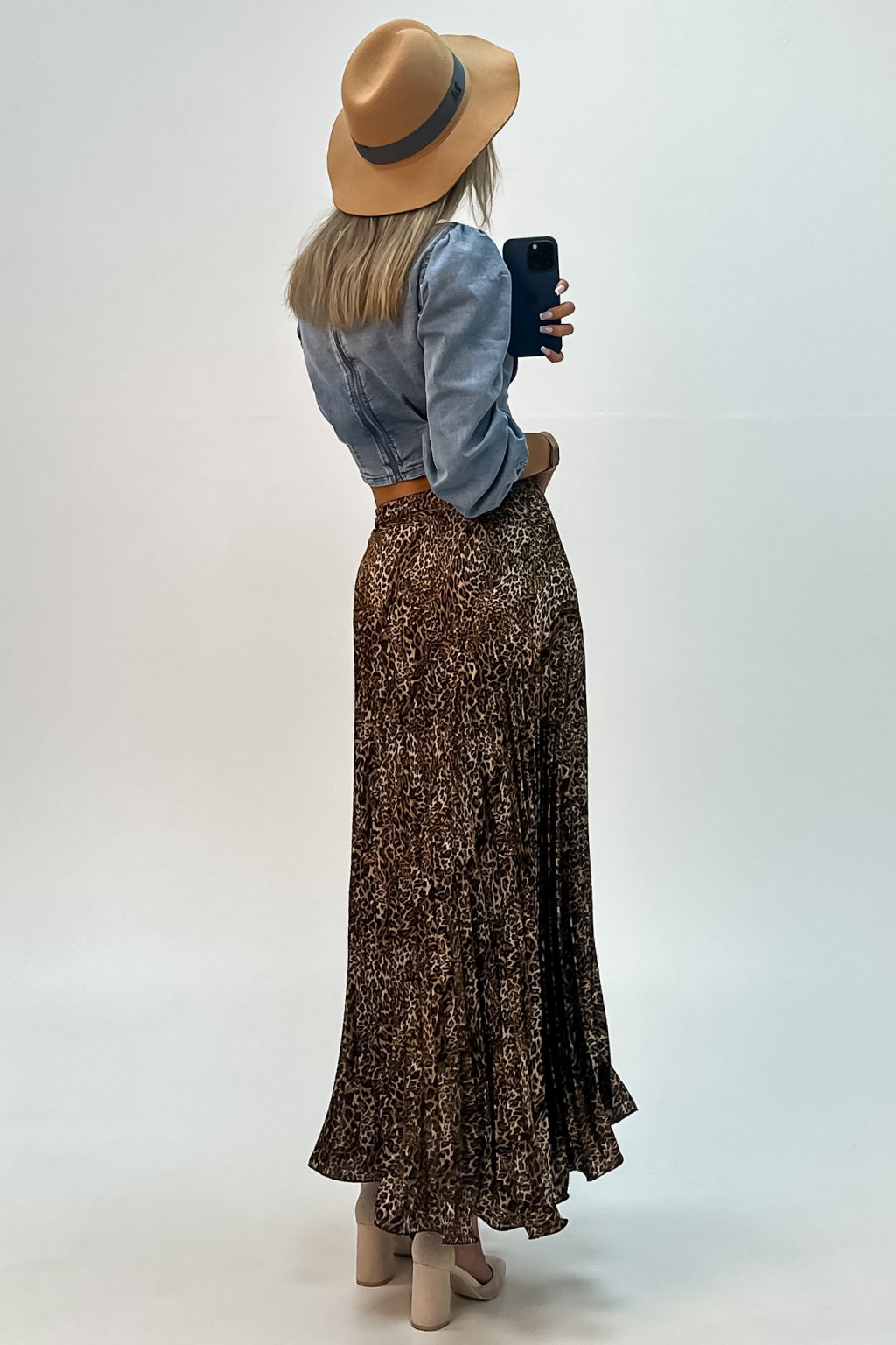 Denimový skrátený top s nariasenými puff rukávmi ukončenými guičkou a so zipsom po celej dĺžke na zadnej strane.