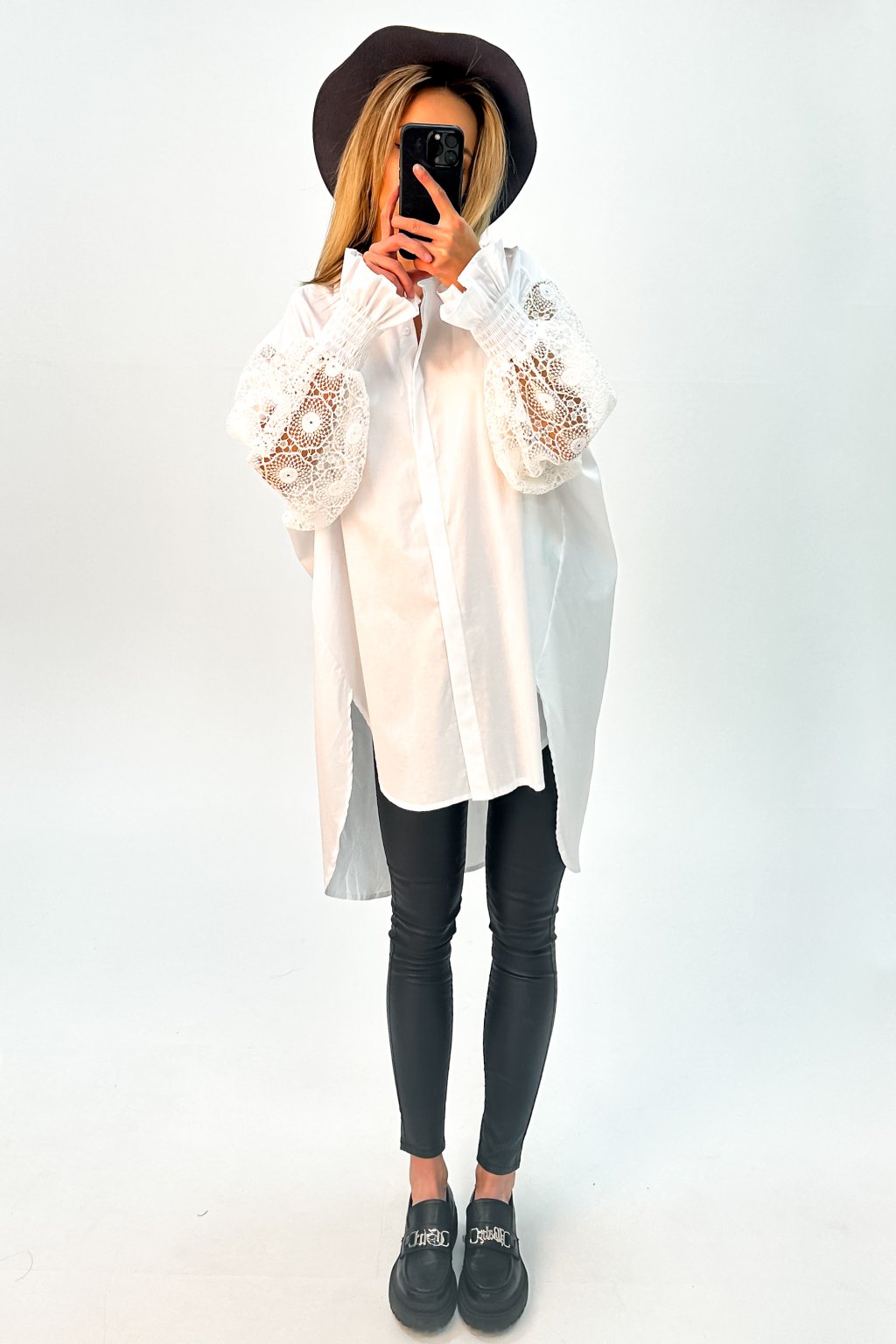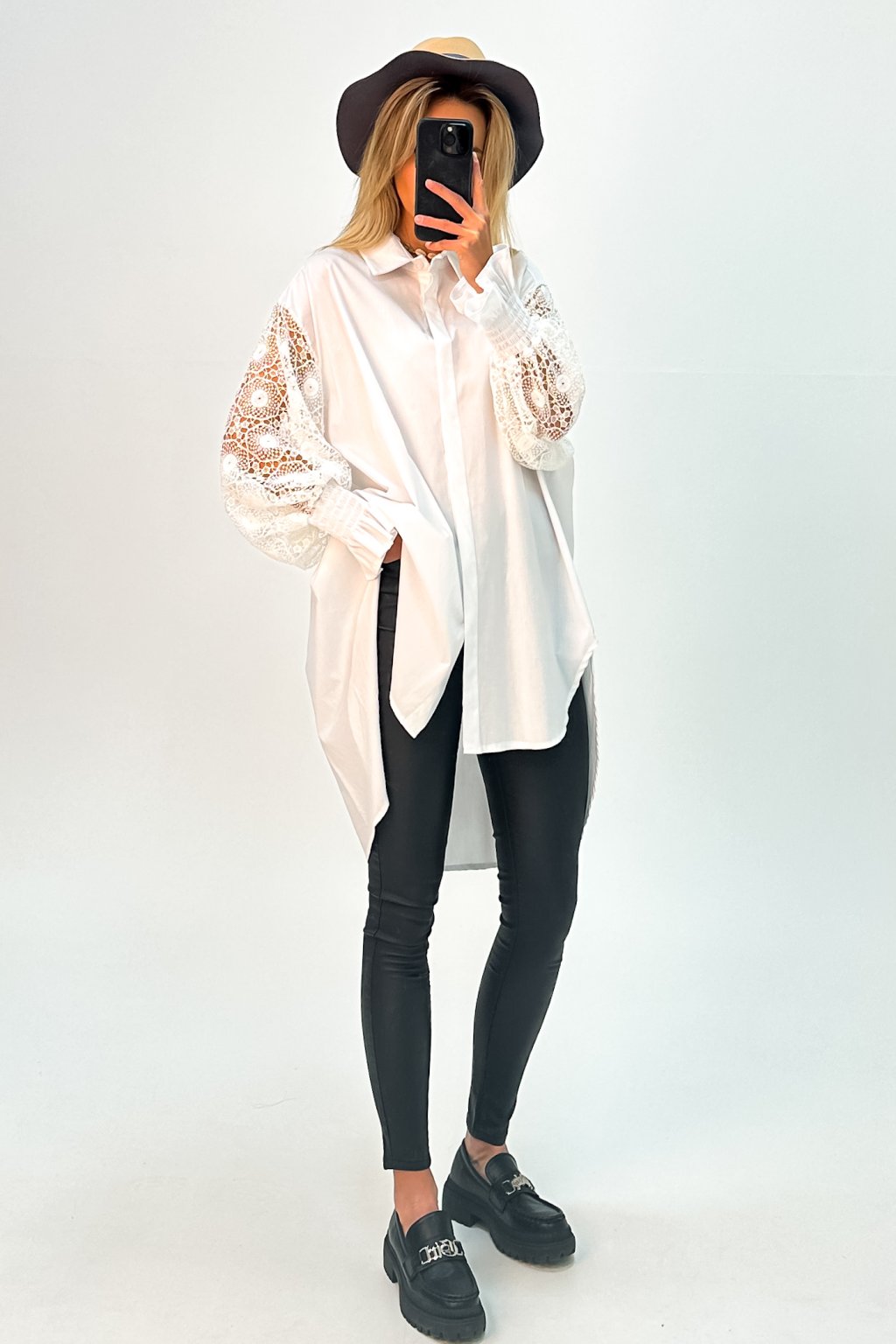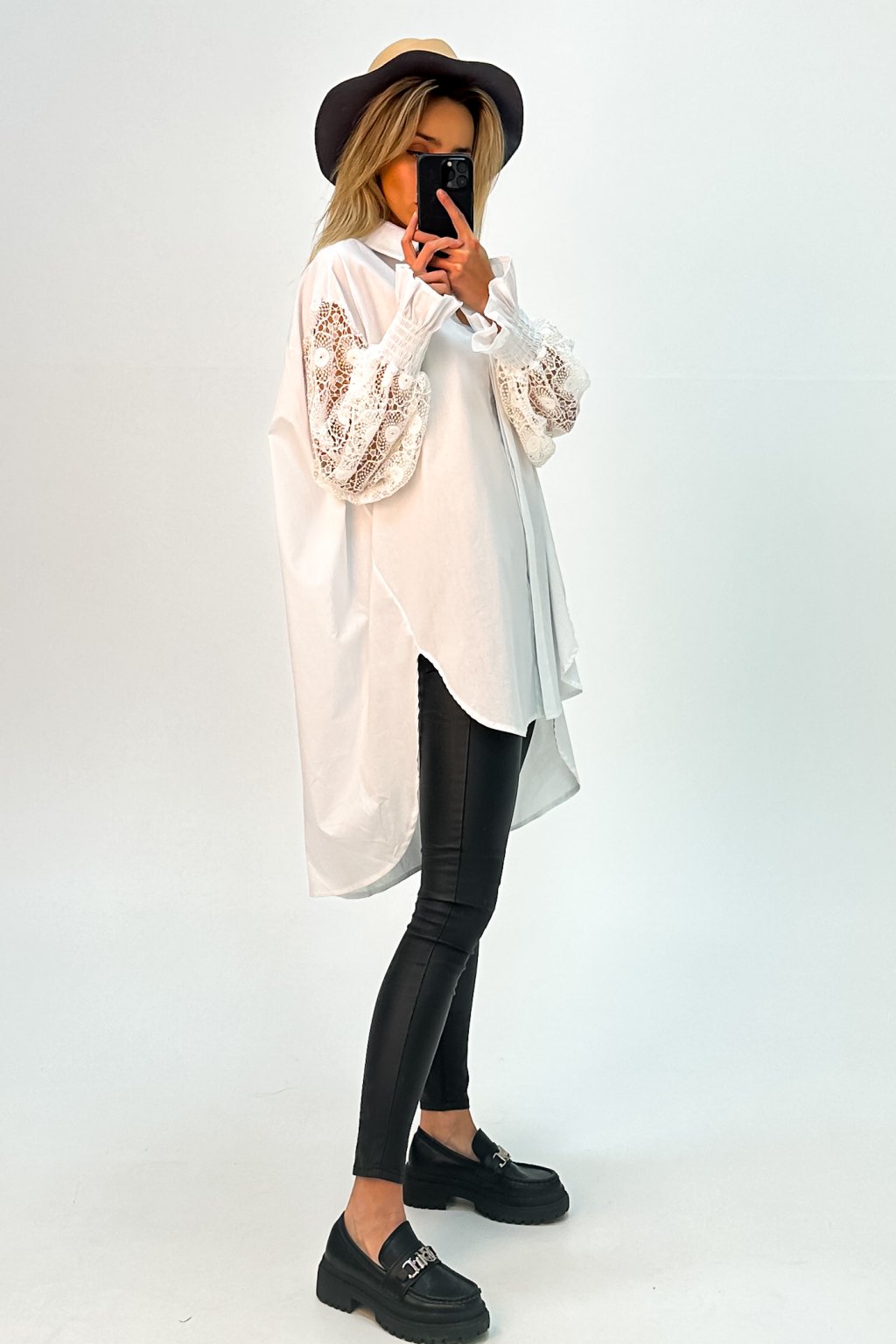 Dlhá oversize biela bavlnená košeľa s puff rukávmi z krajky