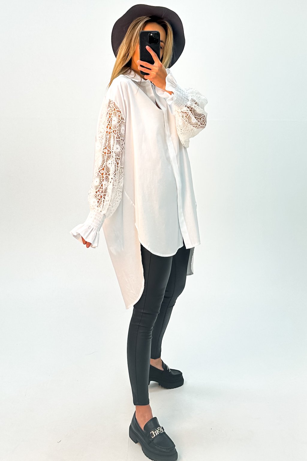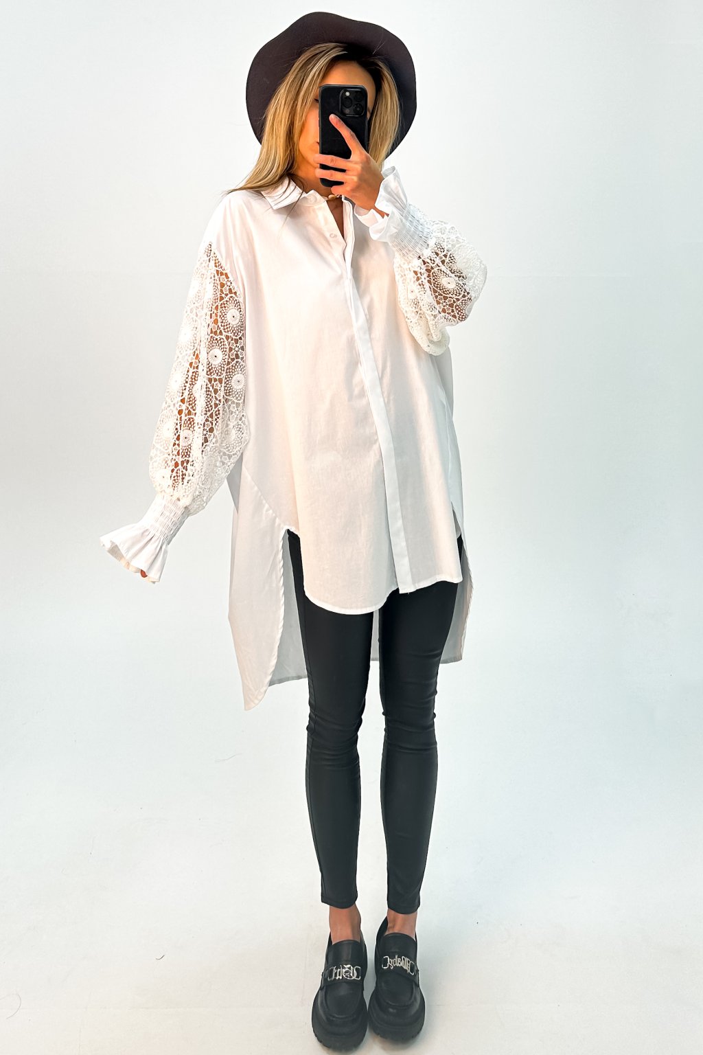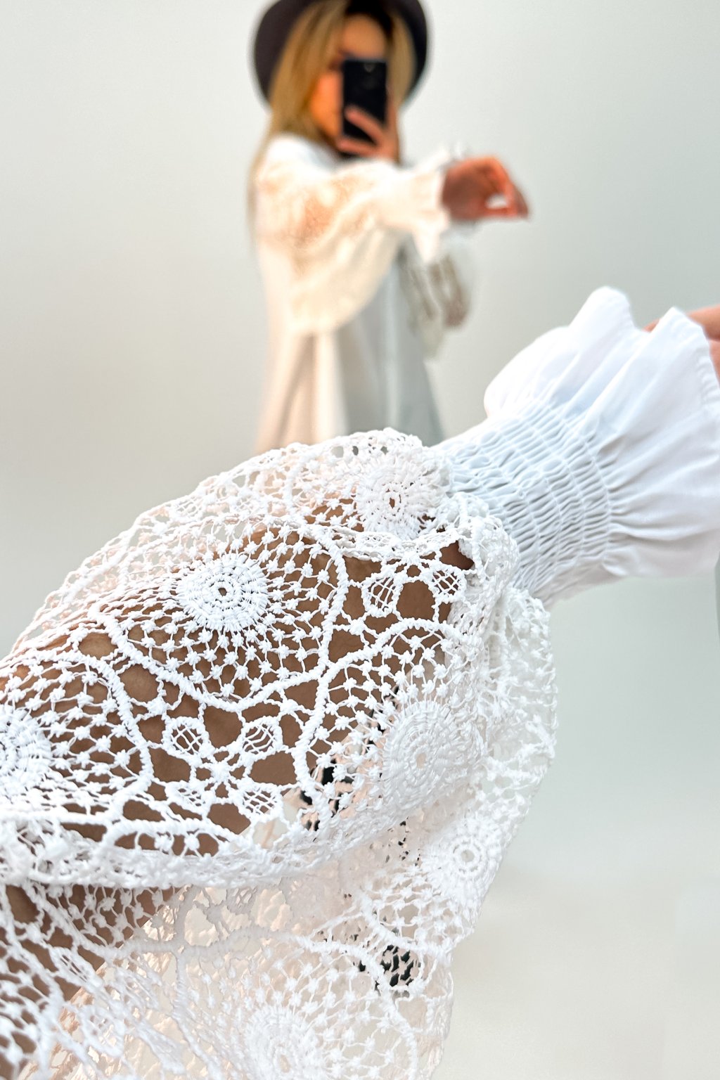 Dlhá oversize biela bavlnená košeľa s puff rukávmi z krajky