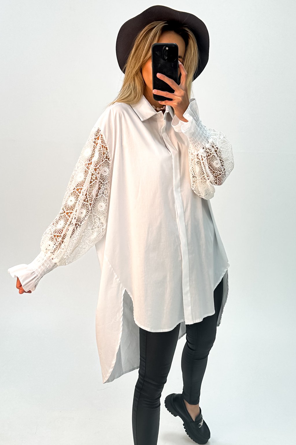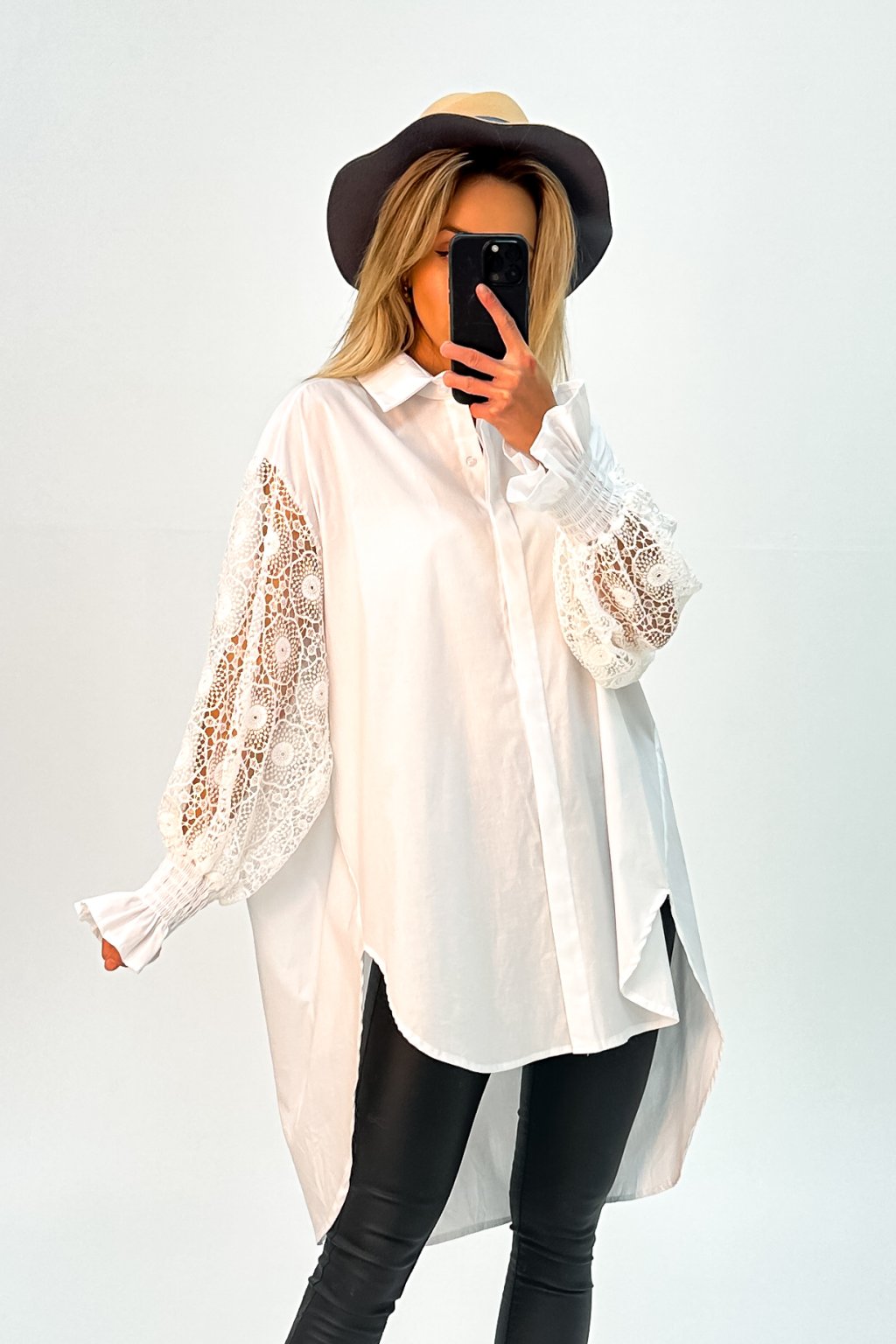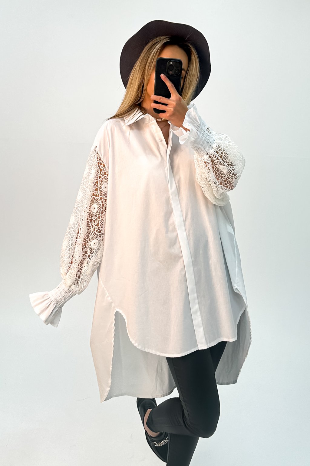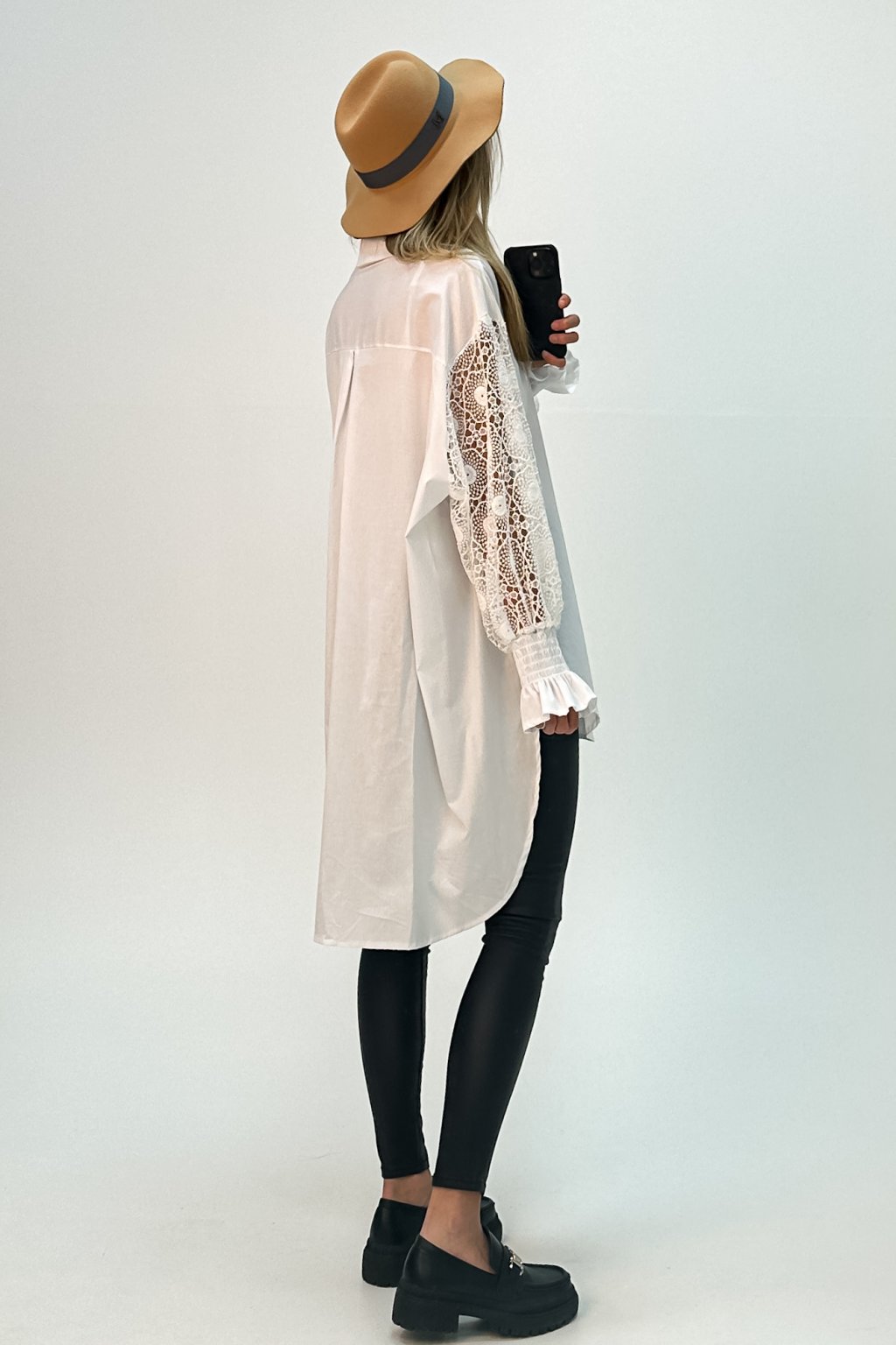 Košeľa v oversize strihu zo 100%nej bavlny na gombíky s predĺženou zadnou stranou a s puff rukávmi z krajky ukončenými gumičkou.