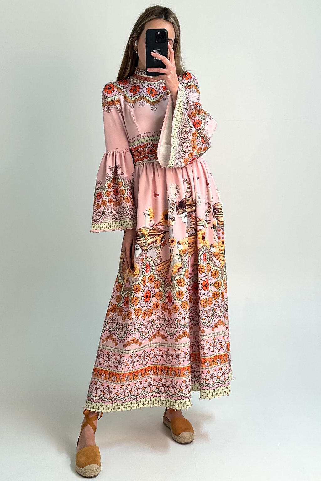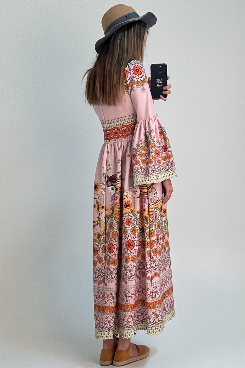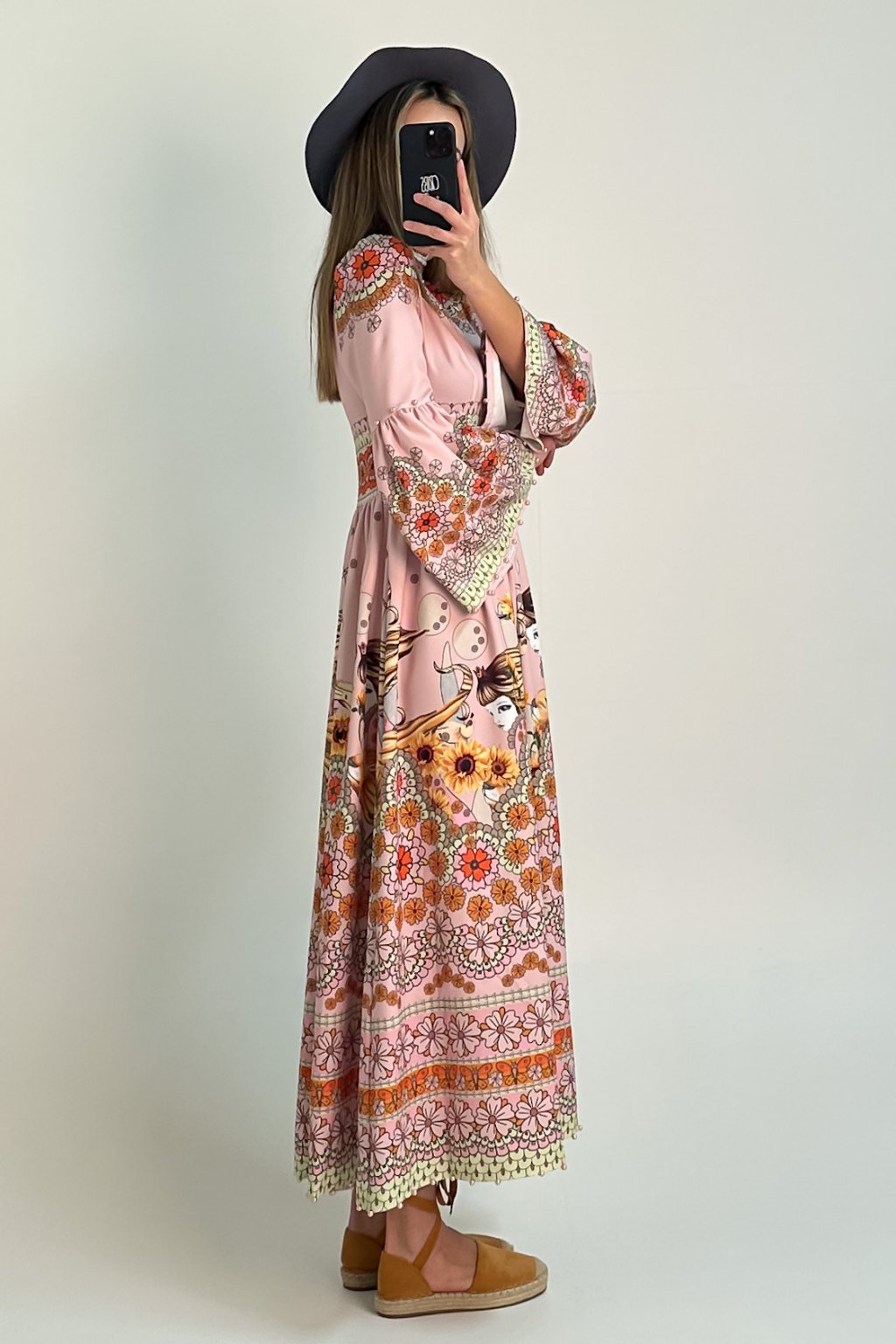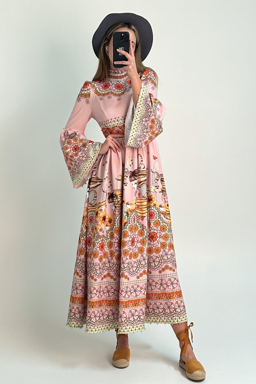 Dlhé kvetinové spoločenské šaty ukončené perličkami ružové