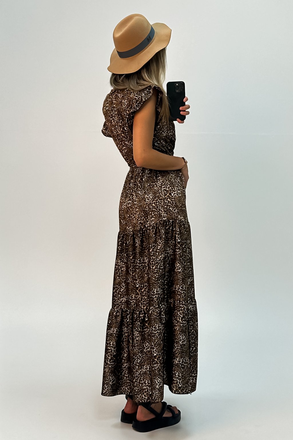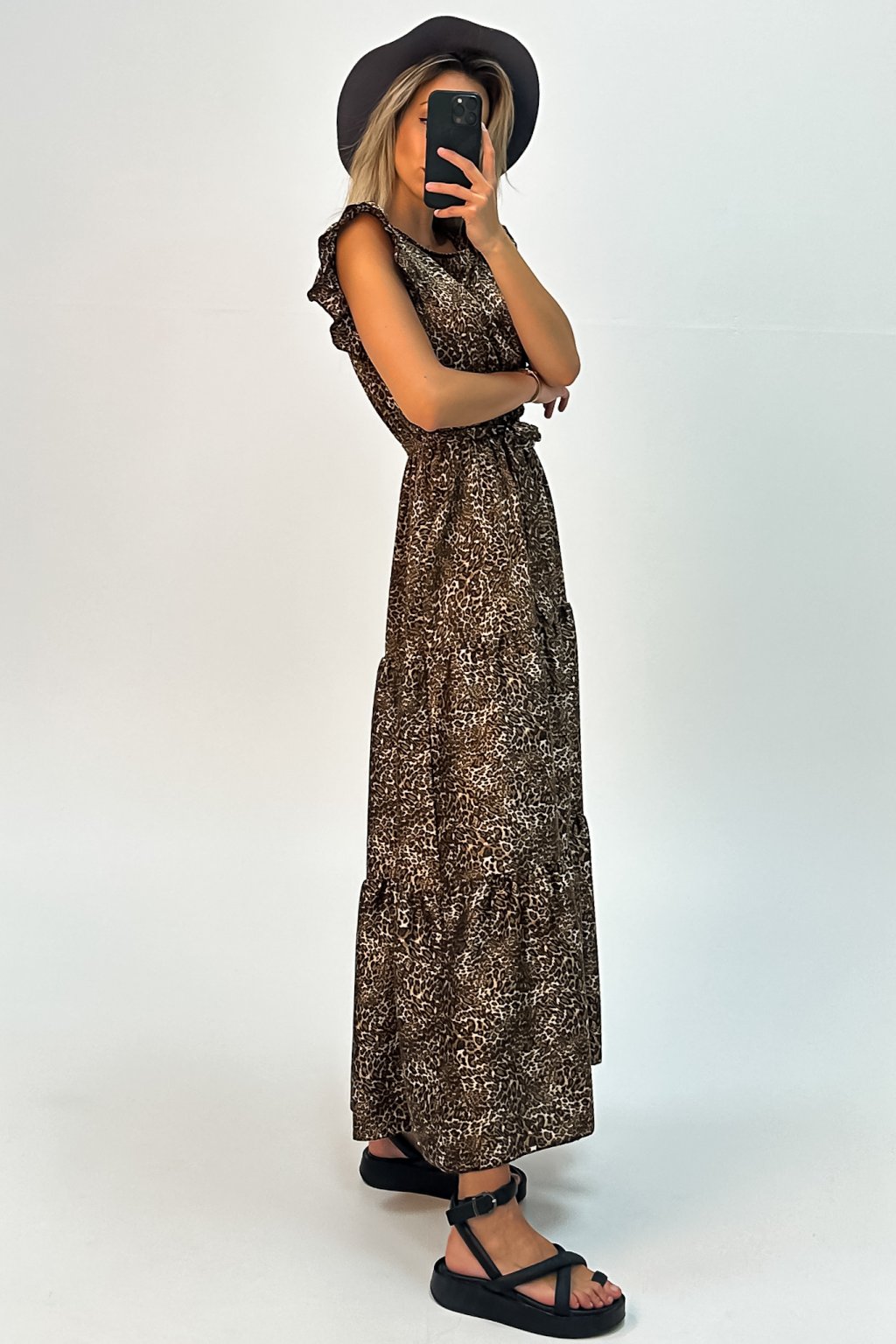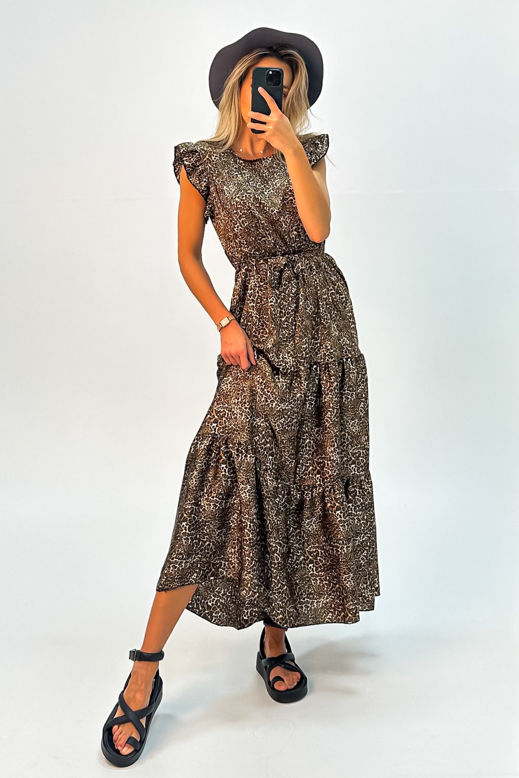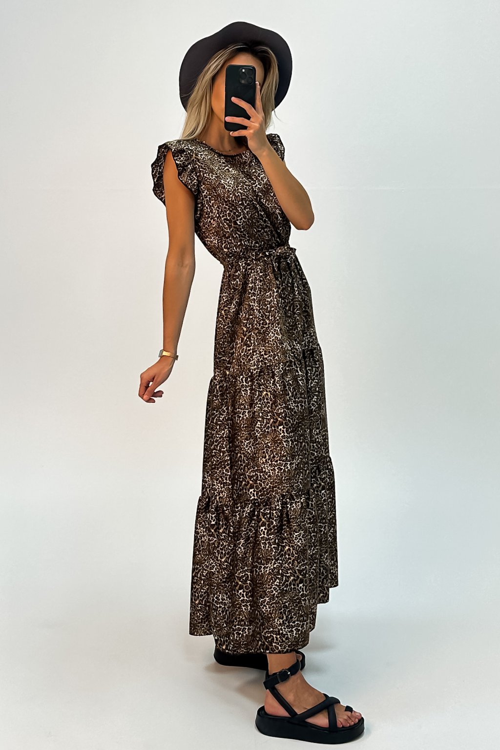 Dlhé vzorované šaty s volánovými rukávmi gumou v páse a opaskom z rovnakého materiálu.