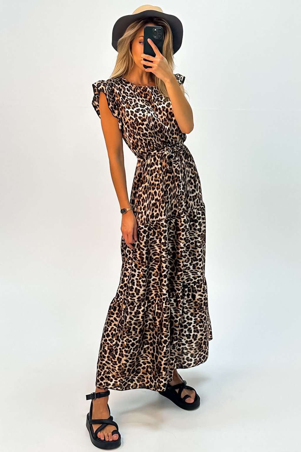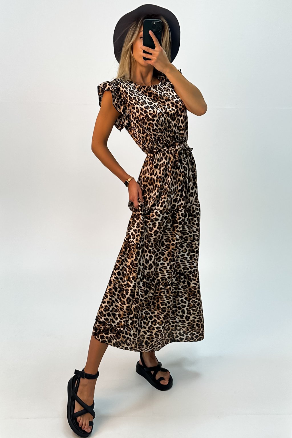 Dlhé vzorované šaty s volánovými rukávmi gumou v páse a opaskom z rovnakého materiálu.