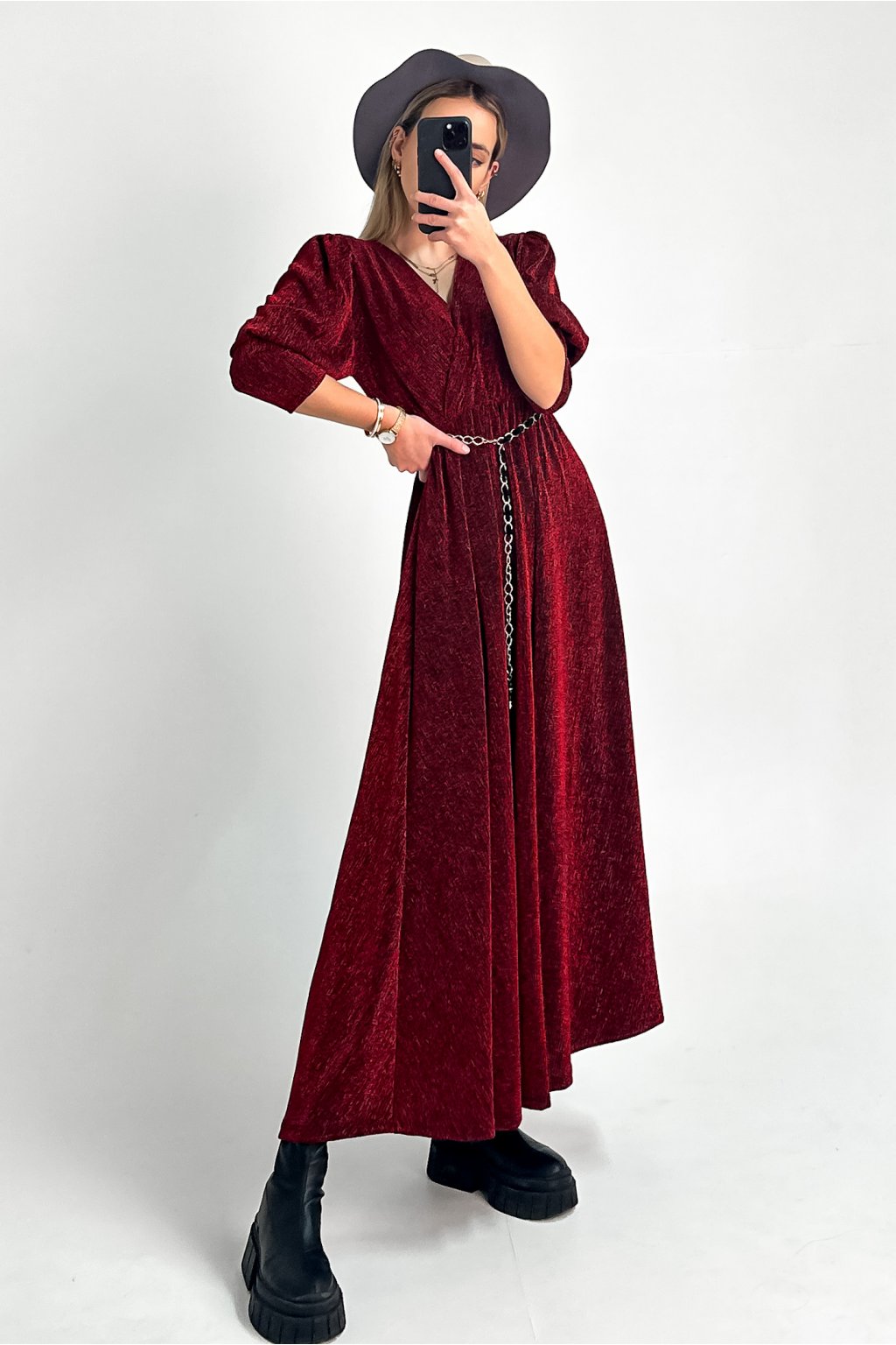 Dlhé trblietavé šaty s puff rukávmi bordo