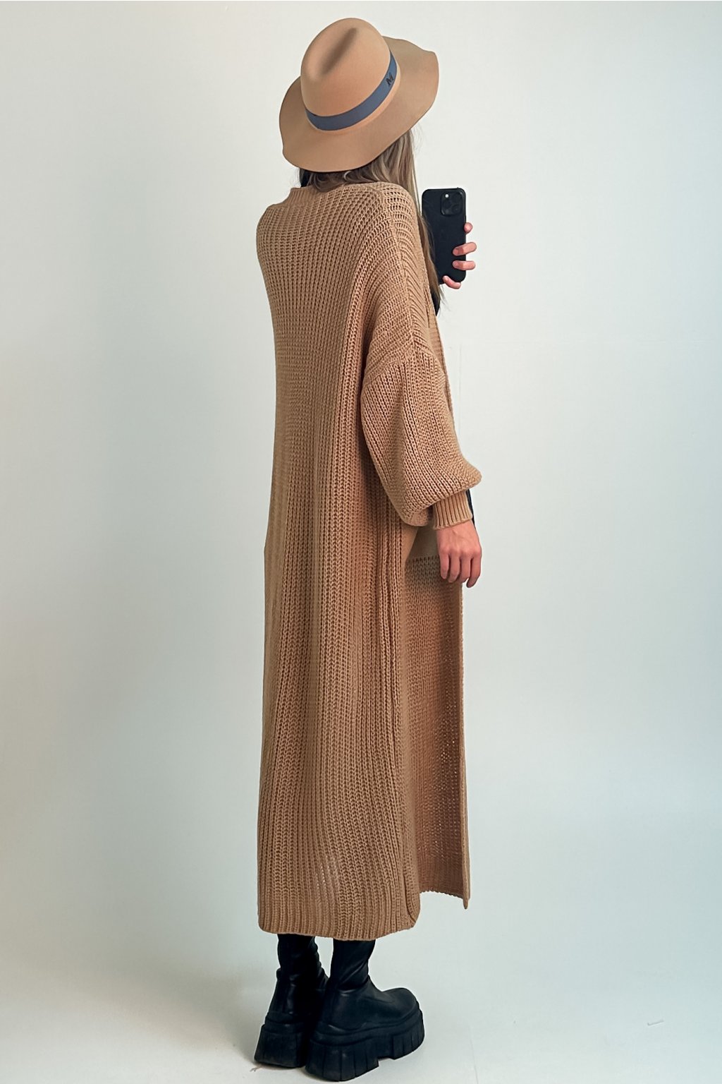 Dlhý kardigán s puff rukávmi hnedý