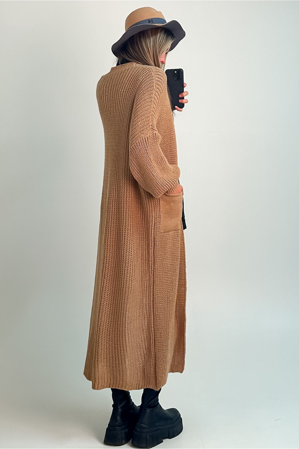 Dlhý kardigán z úpletu s puff rukávmi a vreckami.