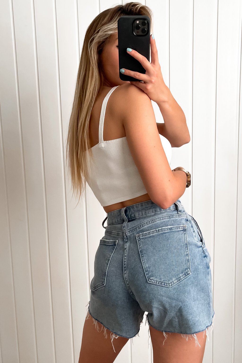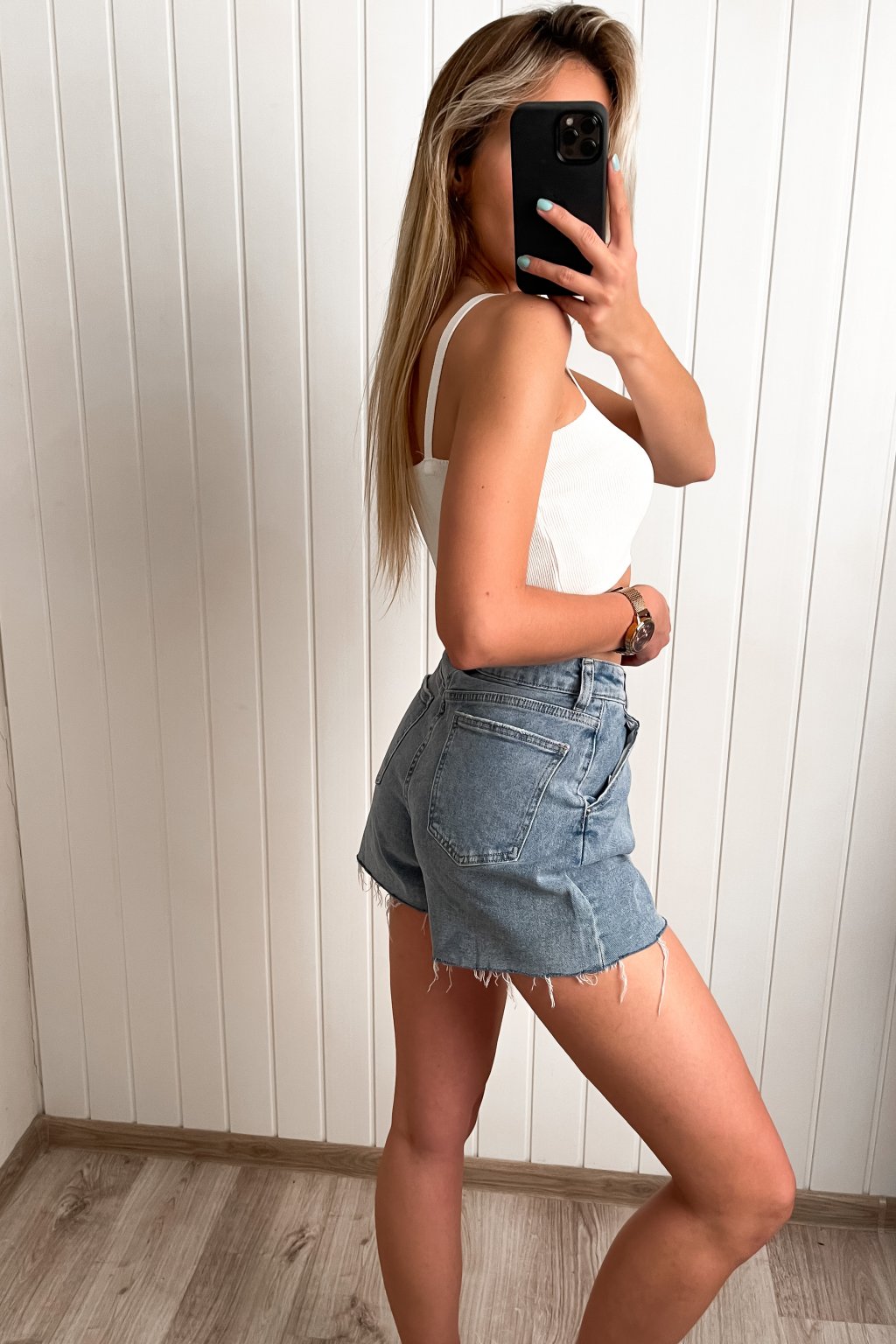 Modré denimové ačkové šórtky s vysokým pásom a s vreckami s odopínateľnou retiazkou prevlečenou cez vrecko šórtiek.