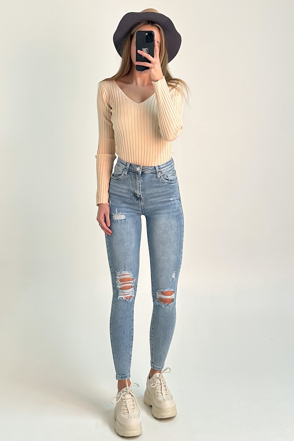 Svetlo modré elastické rifle s vysokým pásom a s roztrhaným efektom s vreckami a zapínaním na zips a gombík.