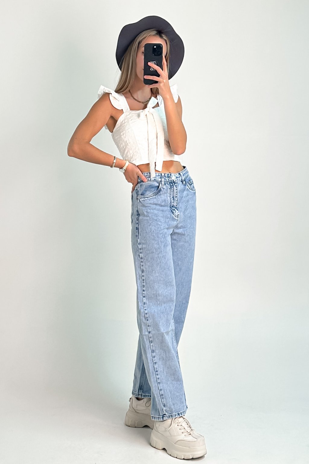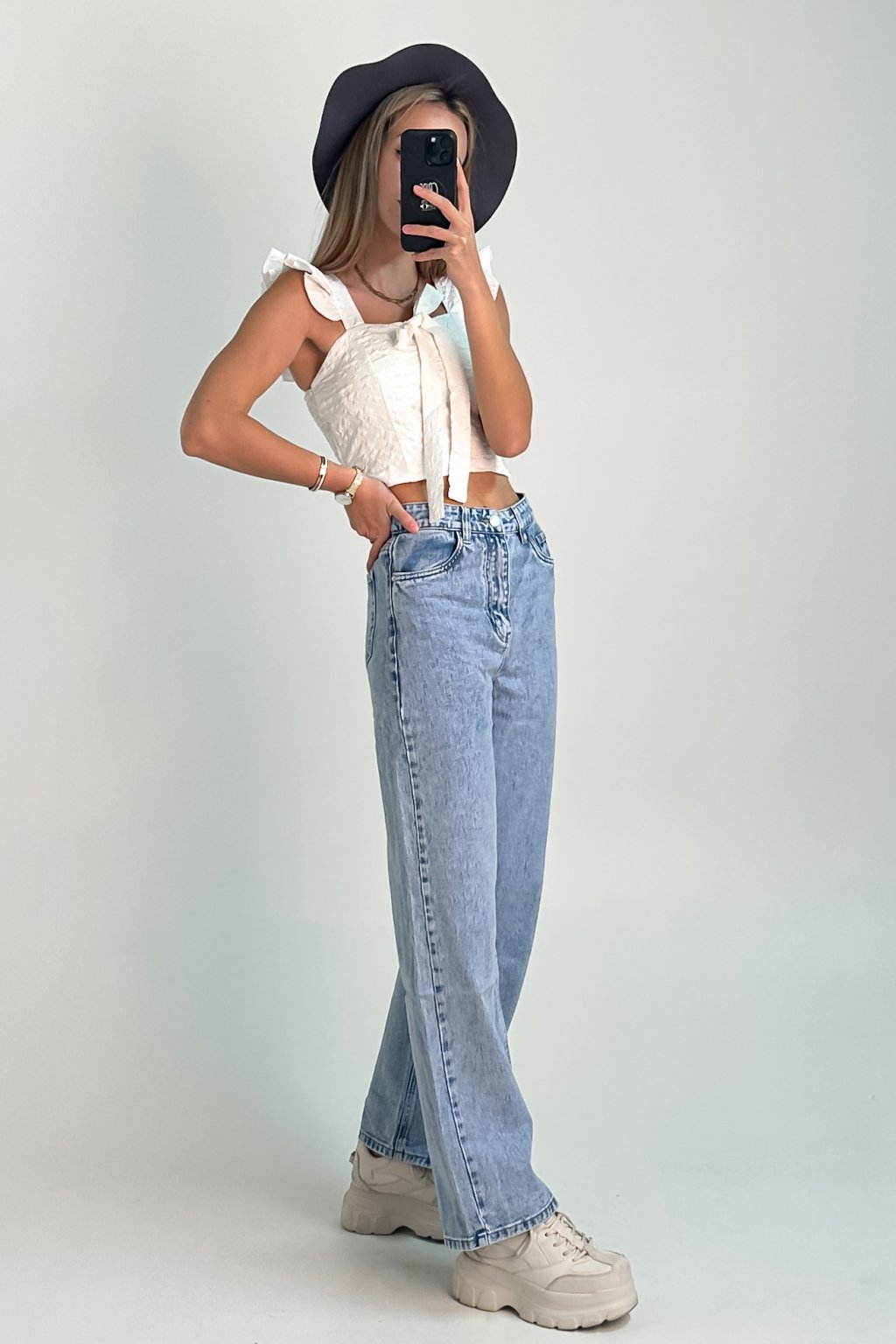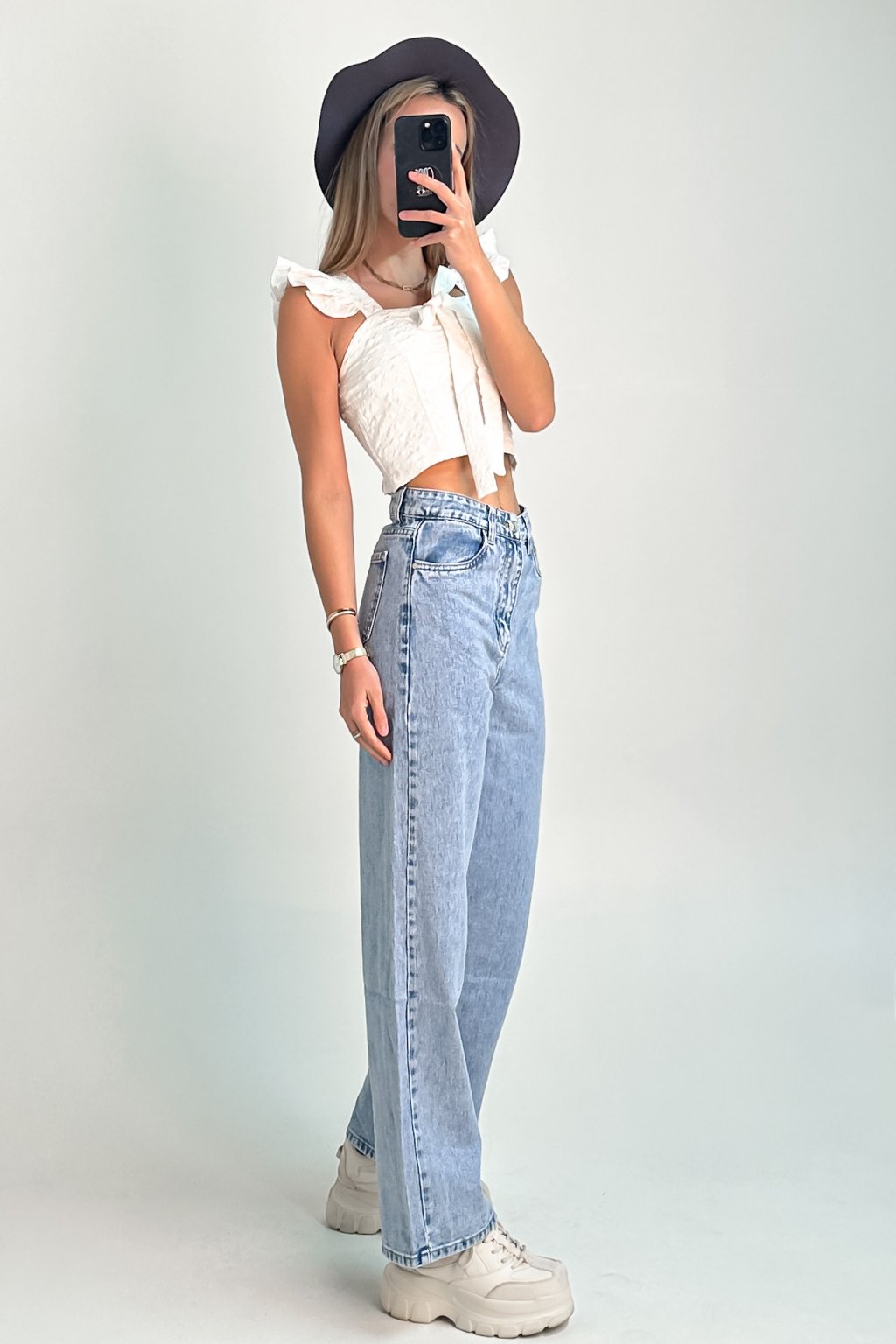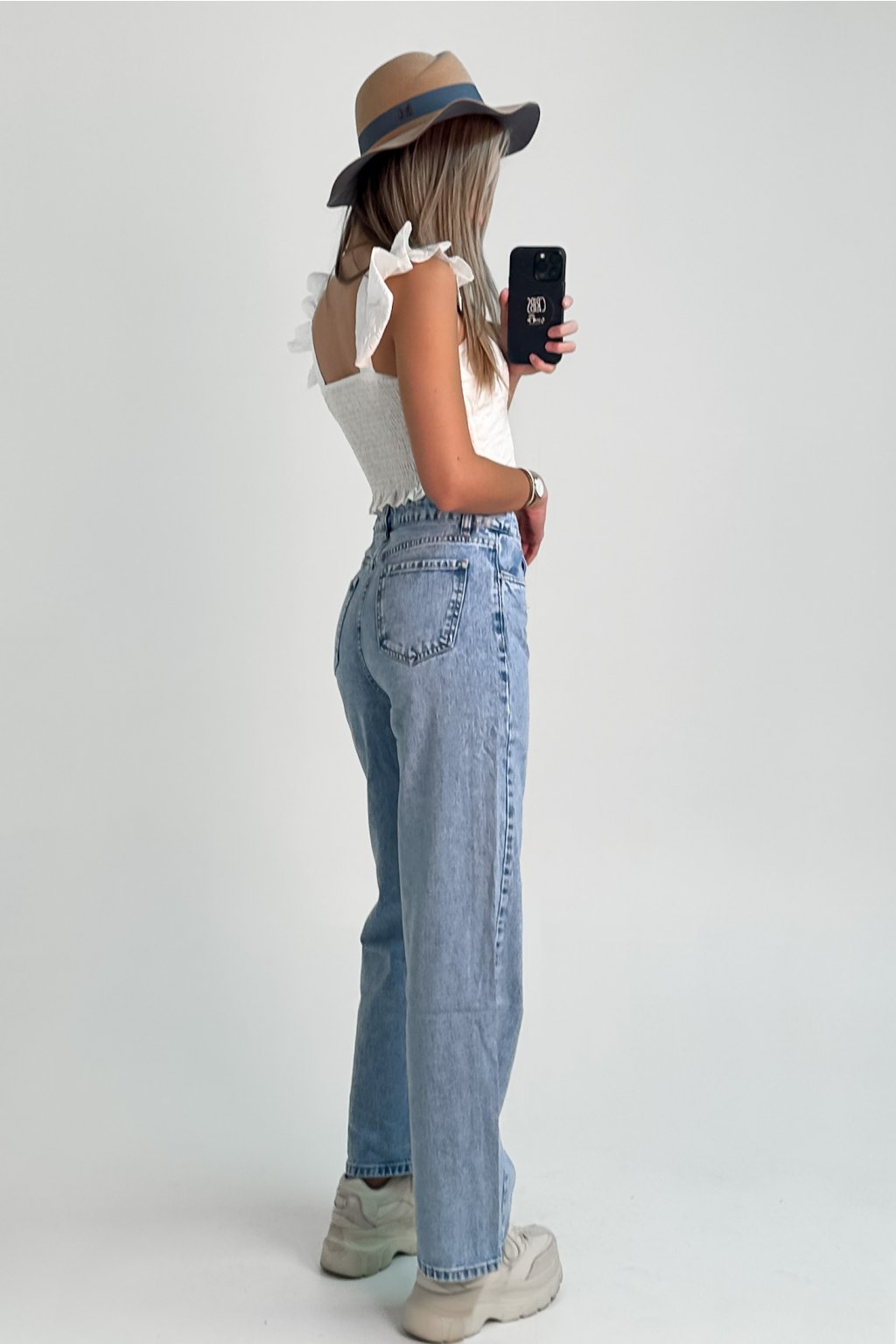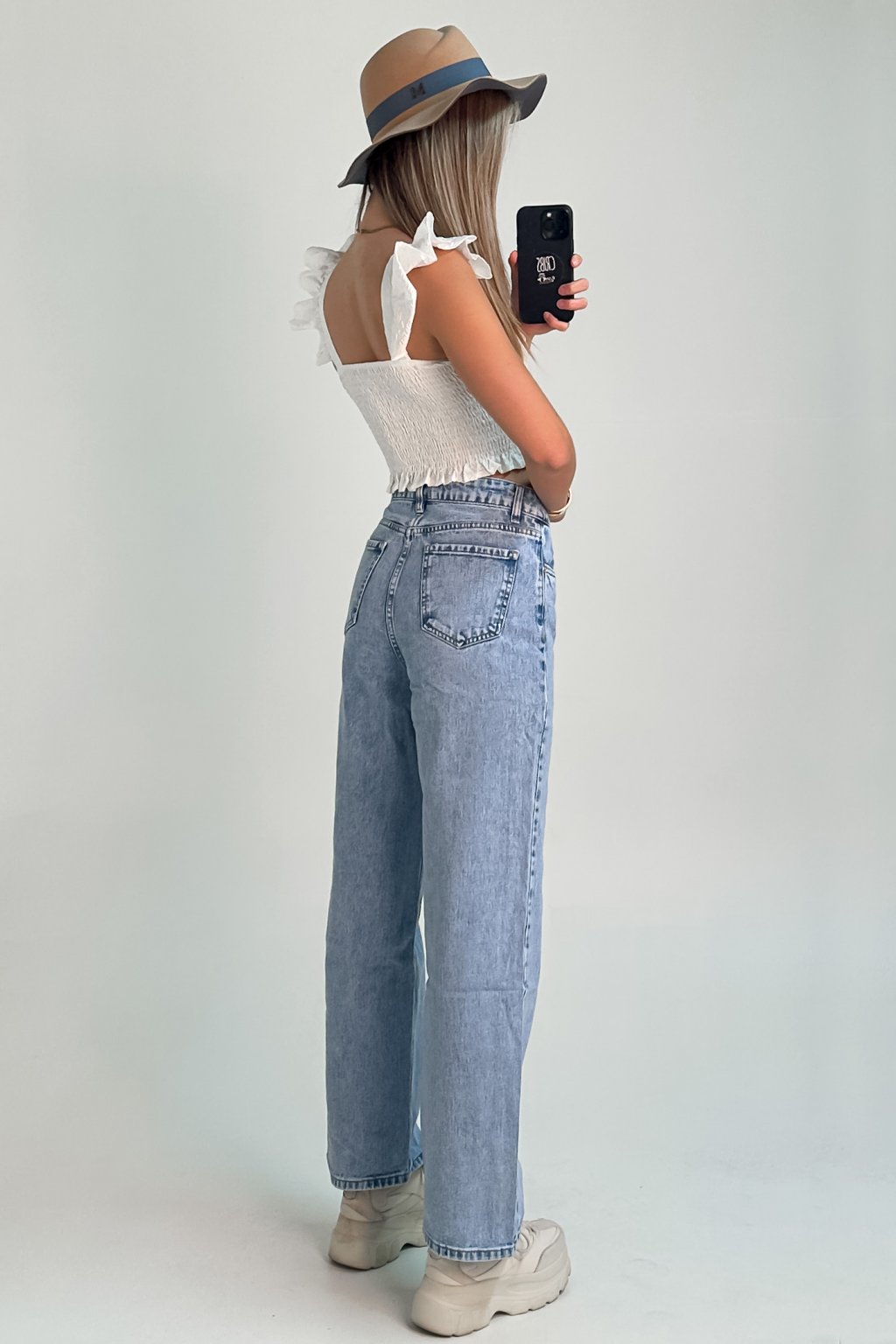 Trendy pohodlné rifle v rovnom strihu s vysokým pásom v svetlej džínsovine.