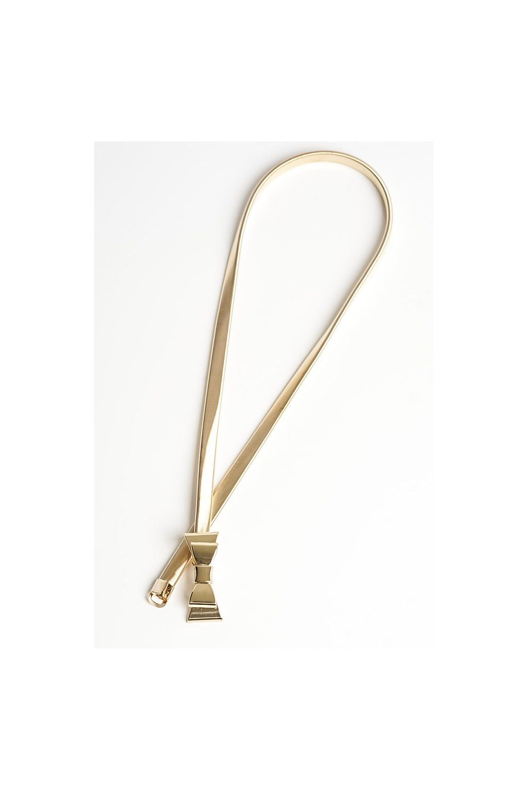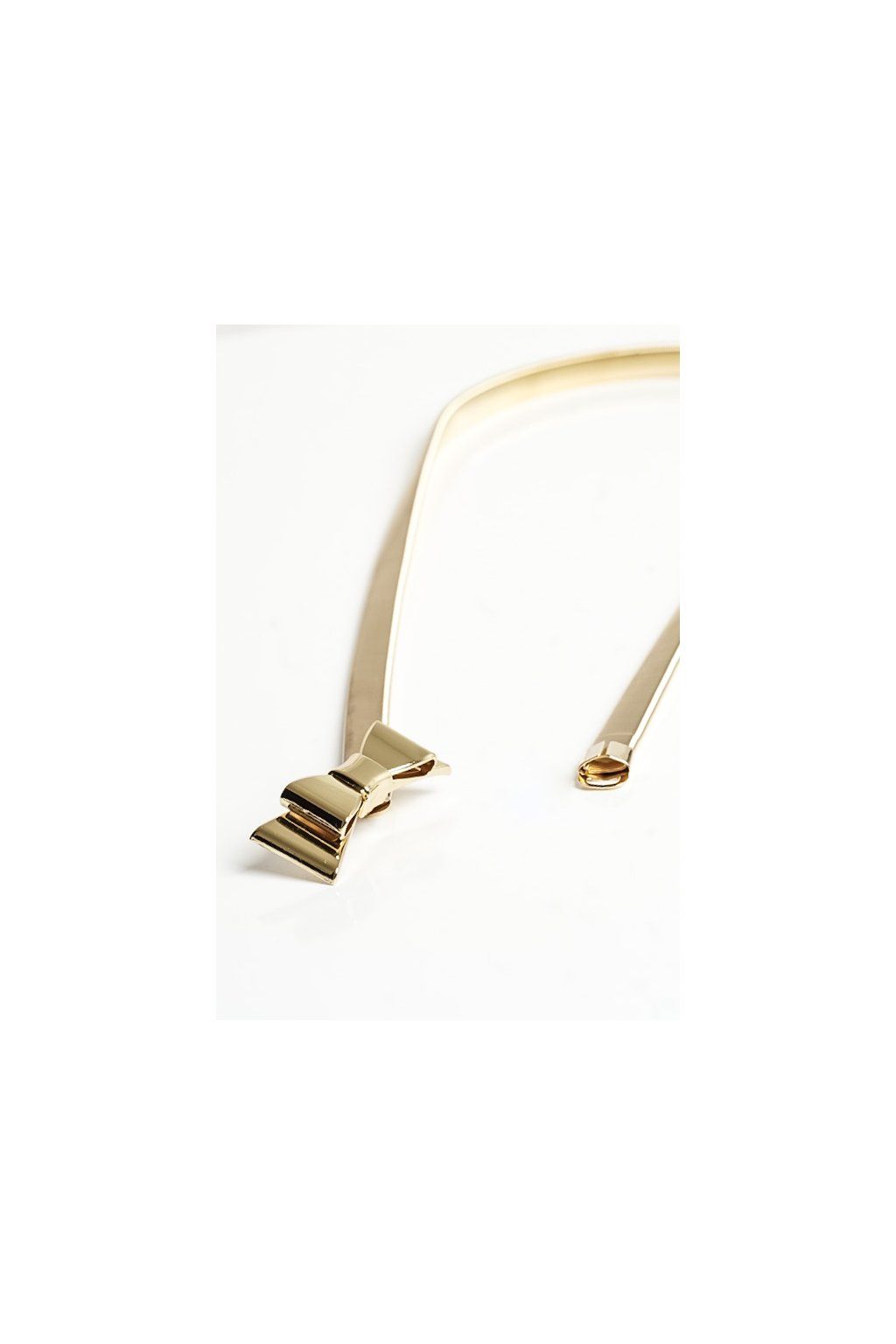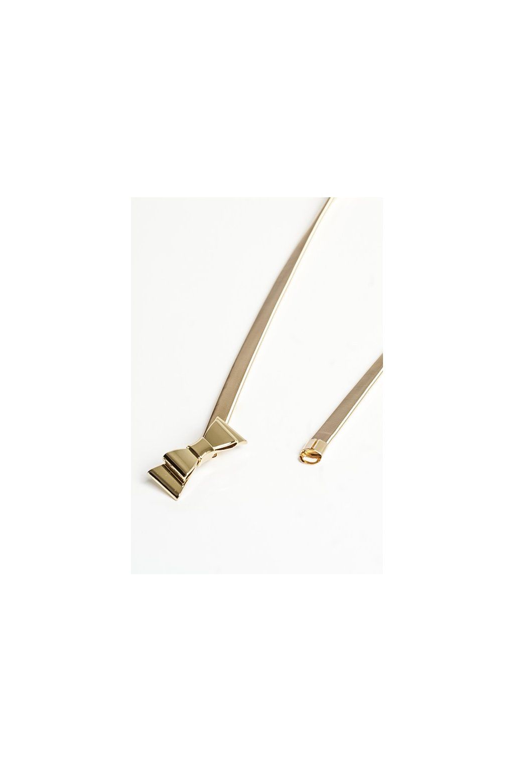 Zlatý kovový opasok zdobený mašličkou, ktorý môžete natiahnuť na ľubovoľný obvod pásu a zapnúť háčikom.
