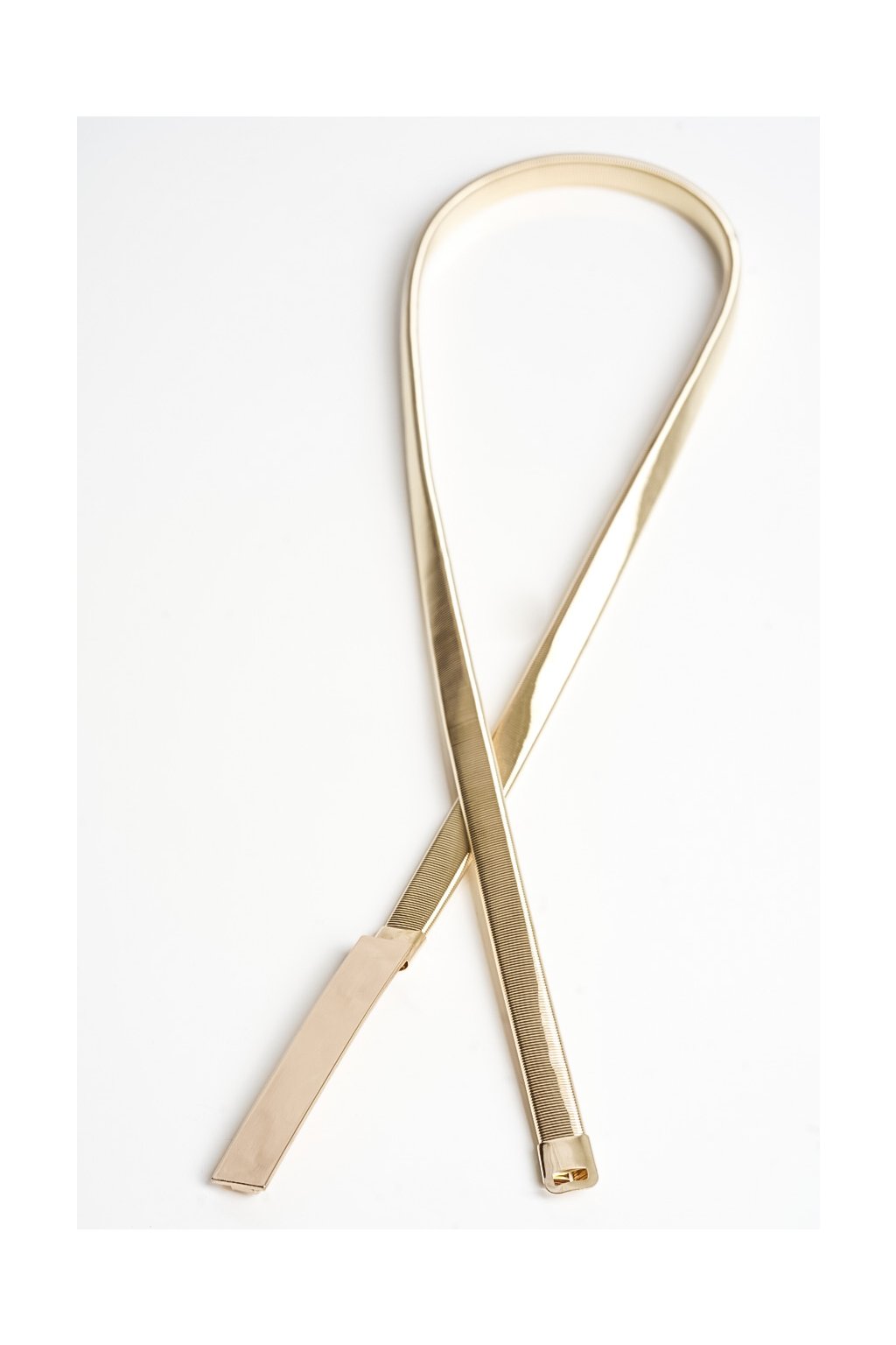 Zlatý kovový s prackou v podobe lesklého pliešku, ktorý môžete natiahnuť na ľubovoľný obvod pásu a zapnúť háčikom.