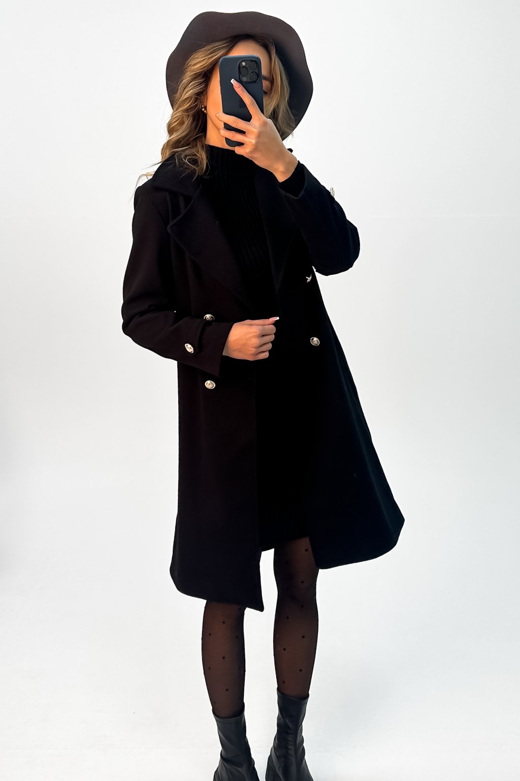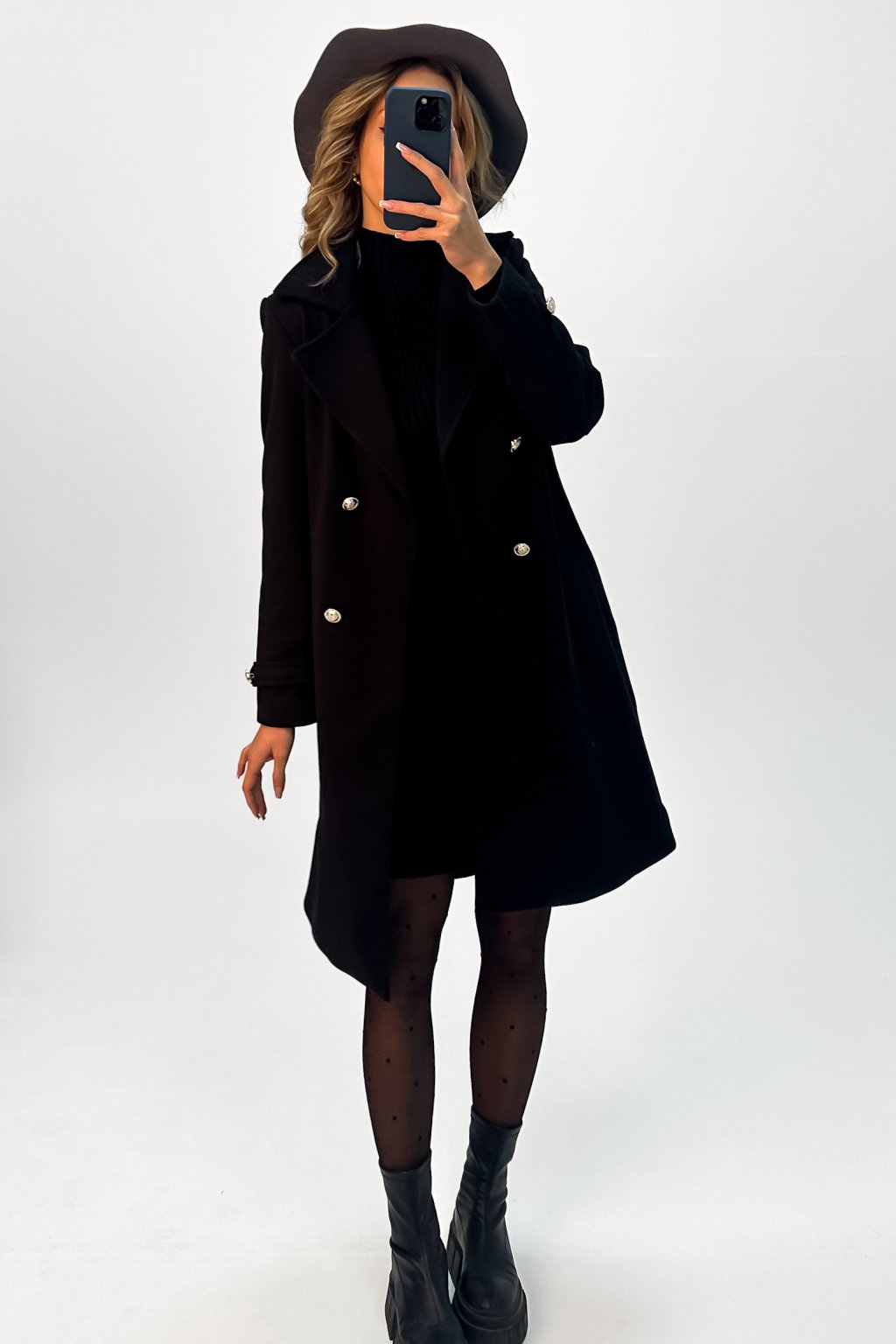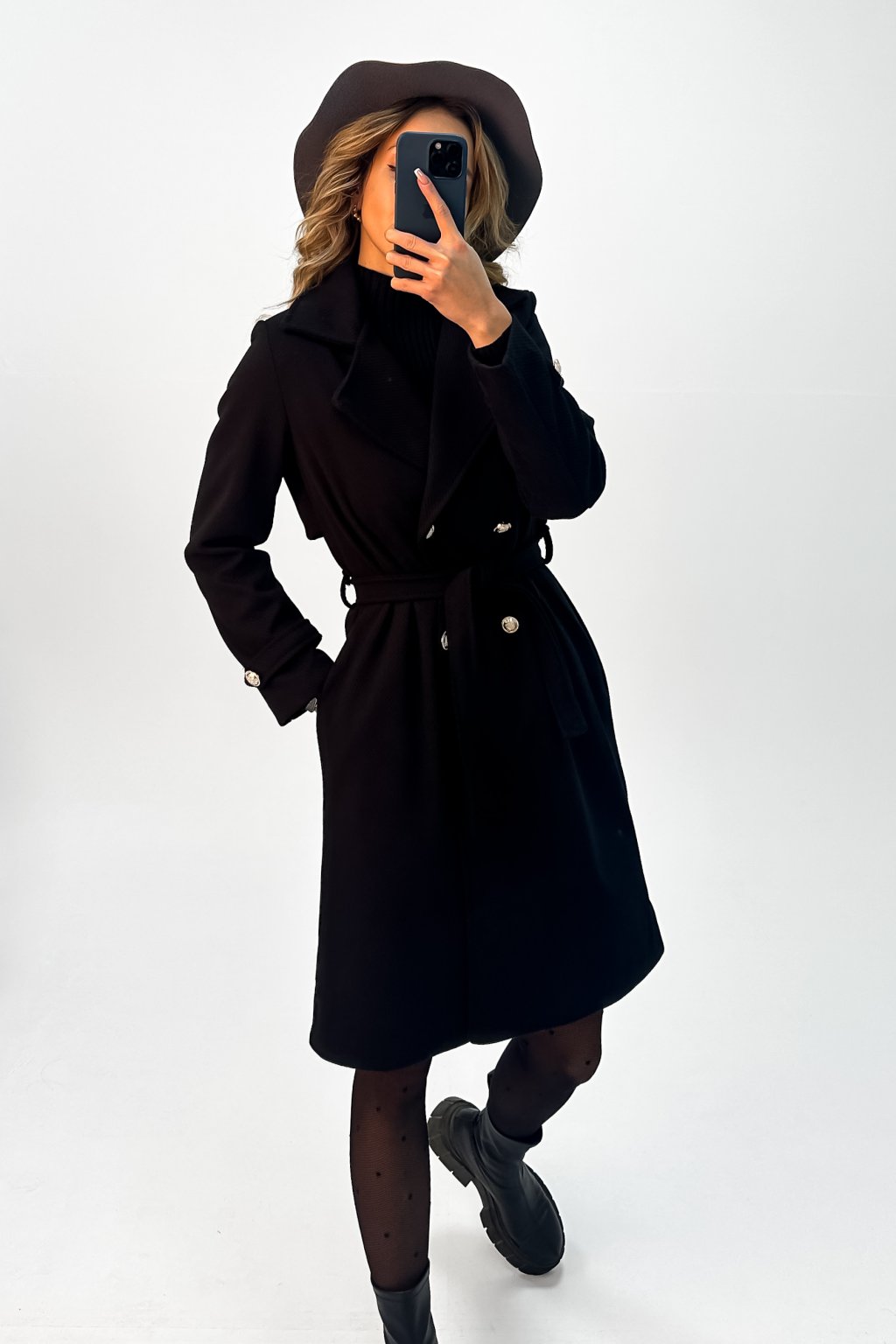 Elegantný čierny kabát so zapínaním na gombíky a pásom na zaväzovanie, klasický dizajn s jemným vzorom a podšívkou.