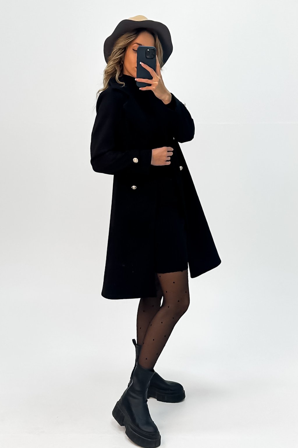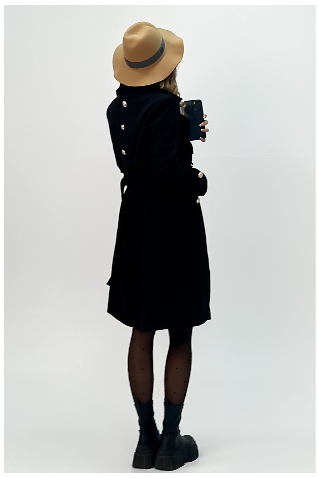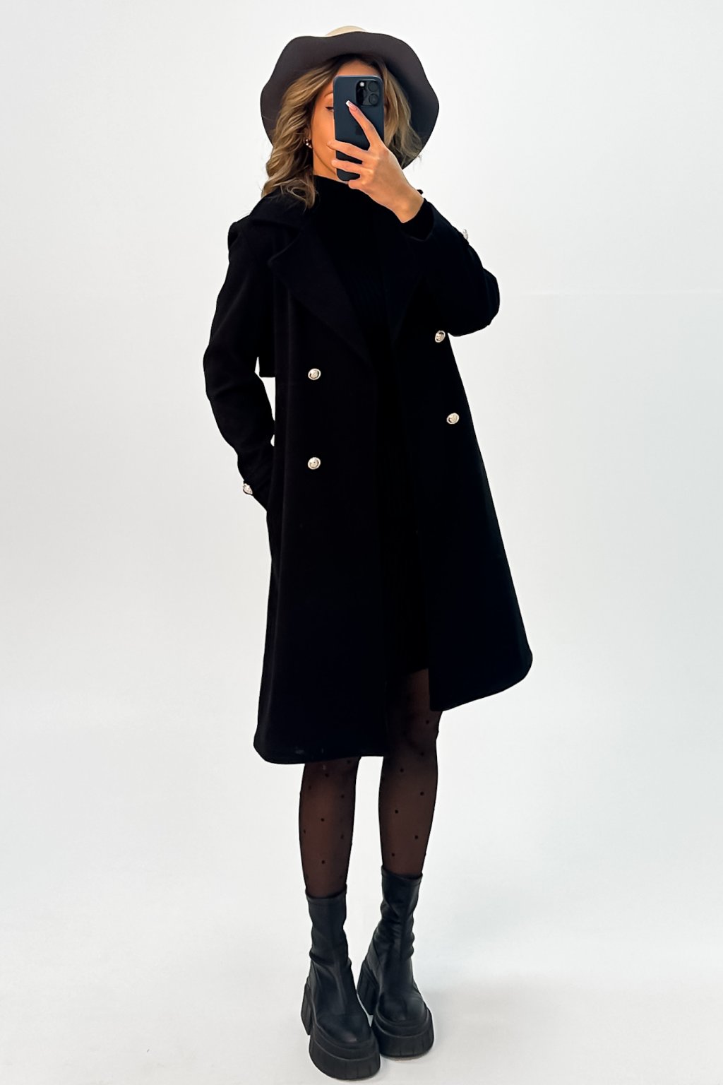 Elegantný čierny kabát so zapínaním na gombíky a pásom na zaväzovanie, klasický dizajn s jemným vzorom a podšívkou.
