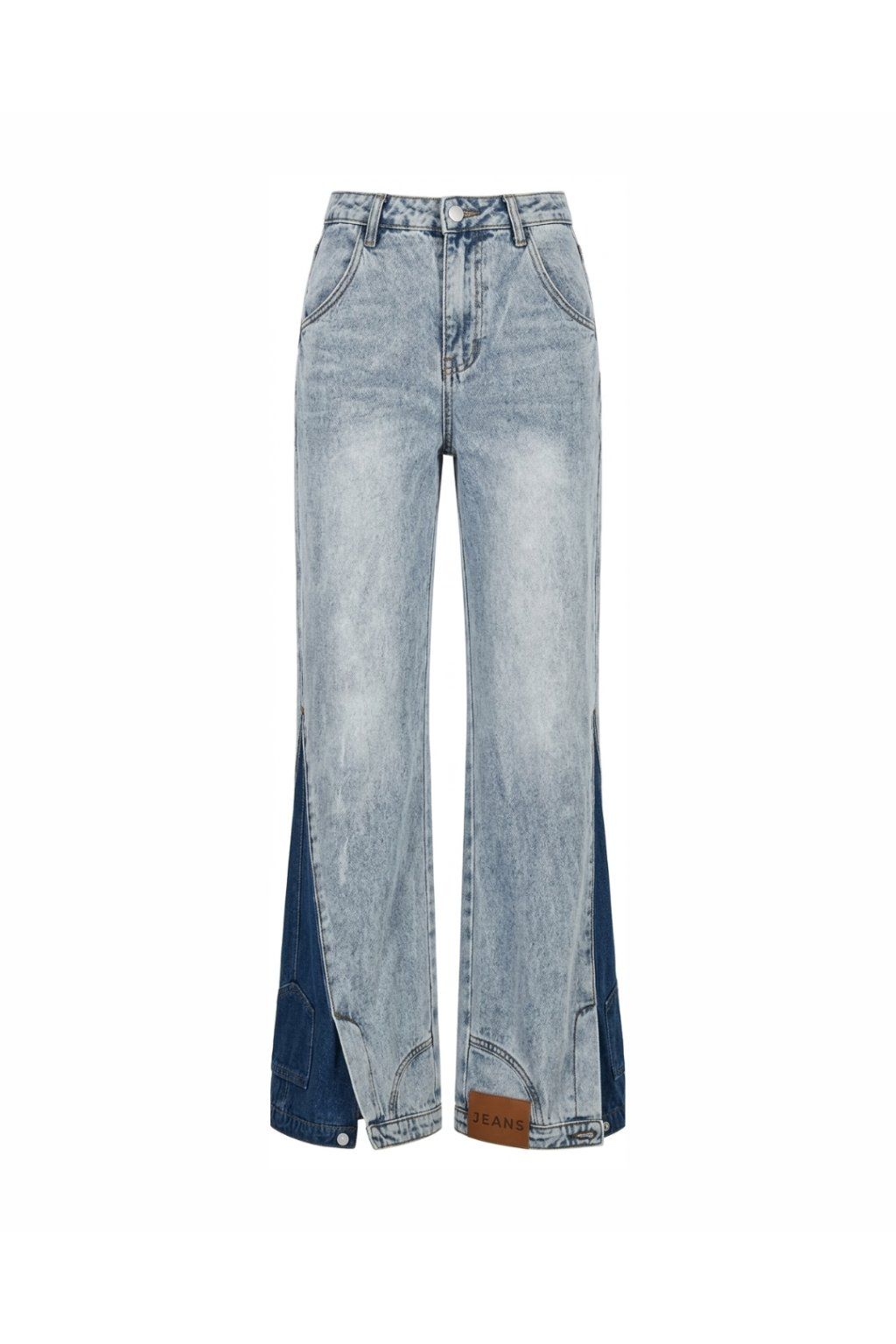 Džínsy s vysokým pásom spojeným s vyčnievajúcou časťou s efektom spodnej bielizne. Džínsy ukončene vo flare strihu v kombinácii s ďalšími džínsami.