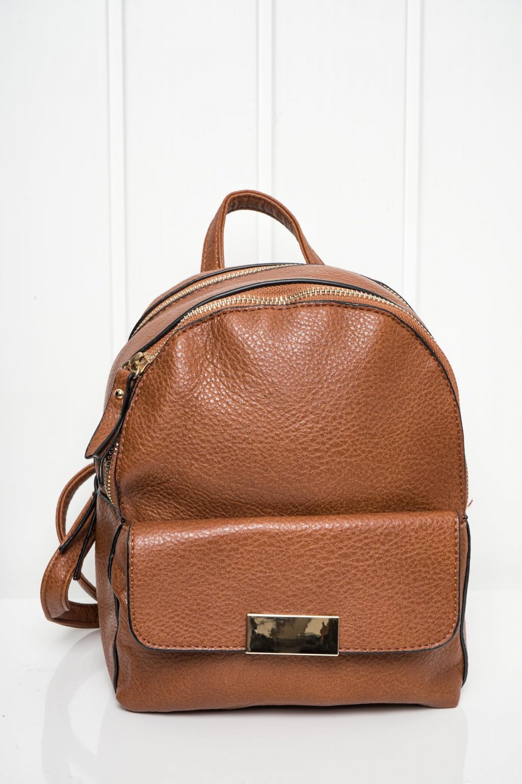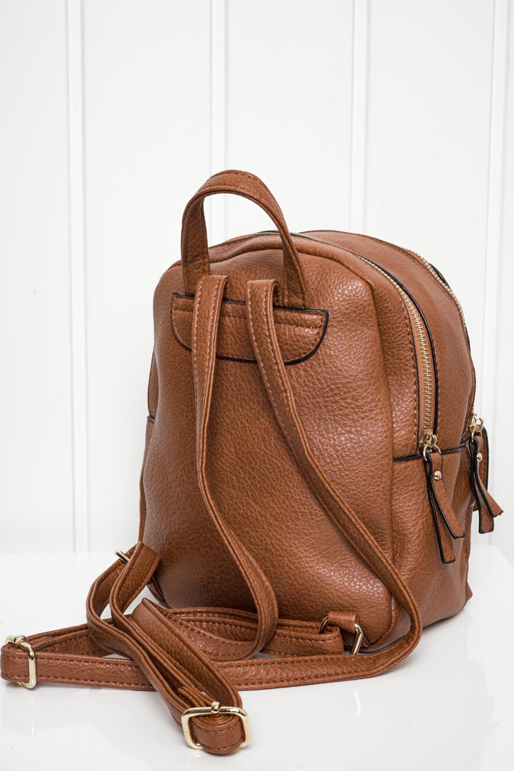 Hnedý ruksak s ozdobnými zlatými zipsami ukončenými hnedými strapčekmi a prednou priehradkou na magnetický zámok.