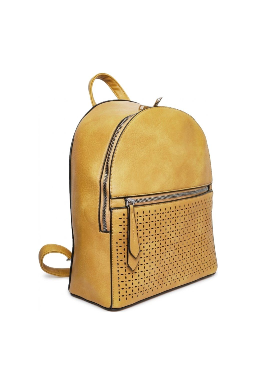 Veľký ruksak horčicovej farby z pevnej imitácie kože s vyrezávaním a ozdobnými striebornými zipsami.