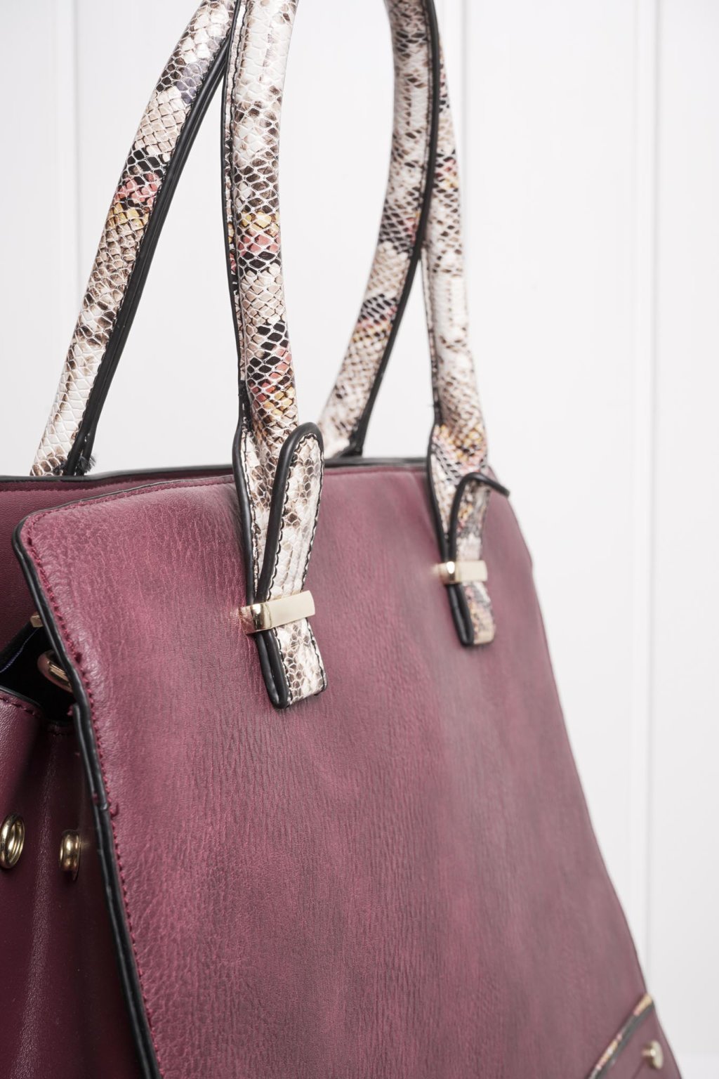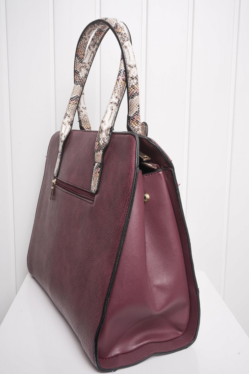 Bordová kabelka so živočíšnym vzorom je ideálna k smart casual outfitom do práce. Obsahuje aj dlhé ramienko pre možnosť nosiť veľkú kabelku cez rameno ako crossbody kabelku.