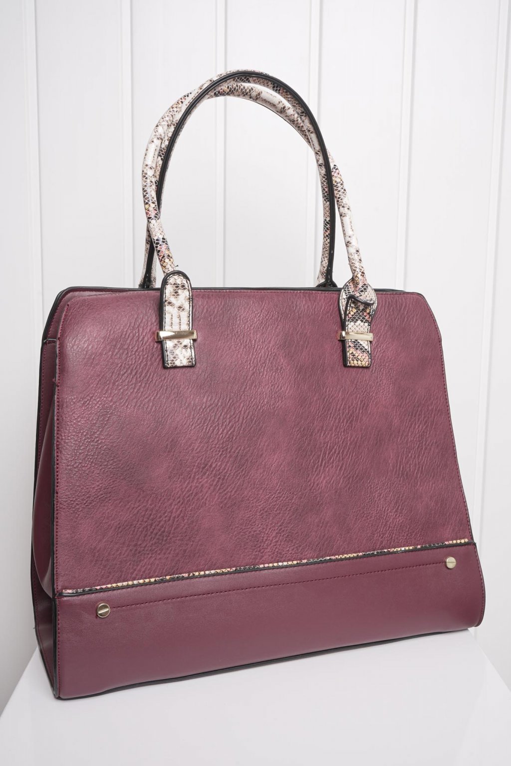 Bordová kabelka s rúčkami a lemom vo vzore hadej kože s priehradkami vo vnútri. Obohatená o zlaté ozdobné aplikácie.