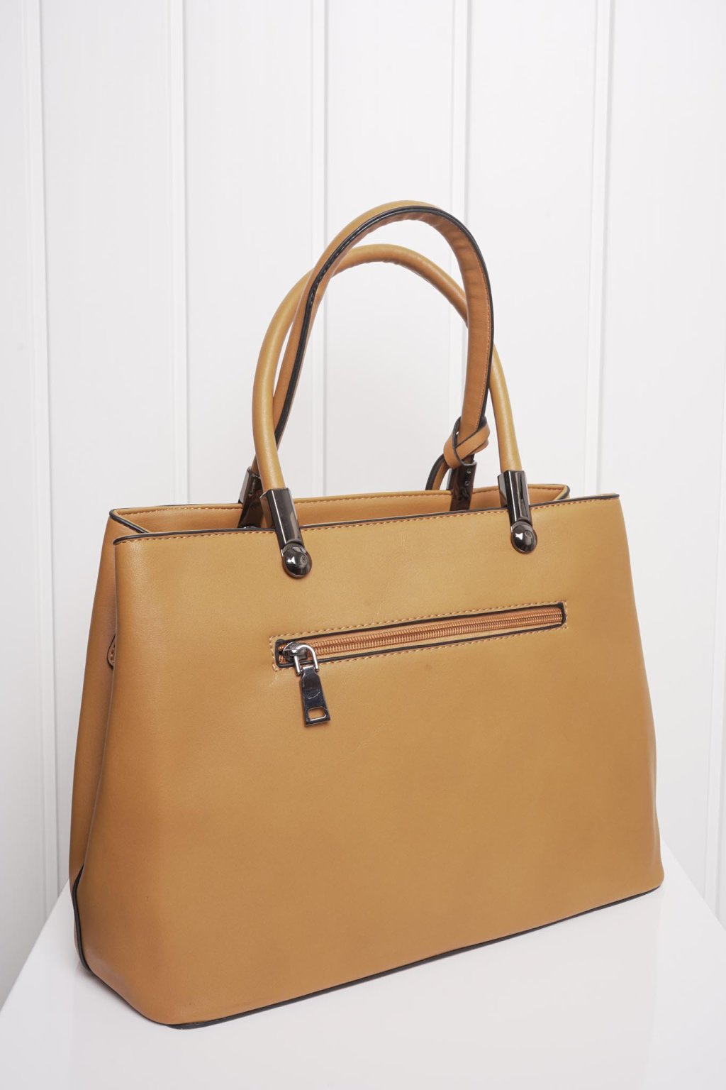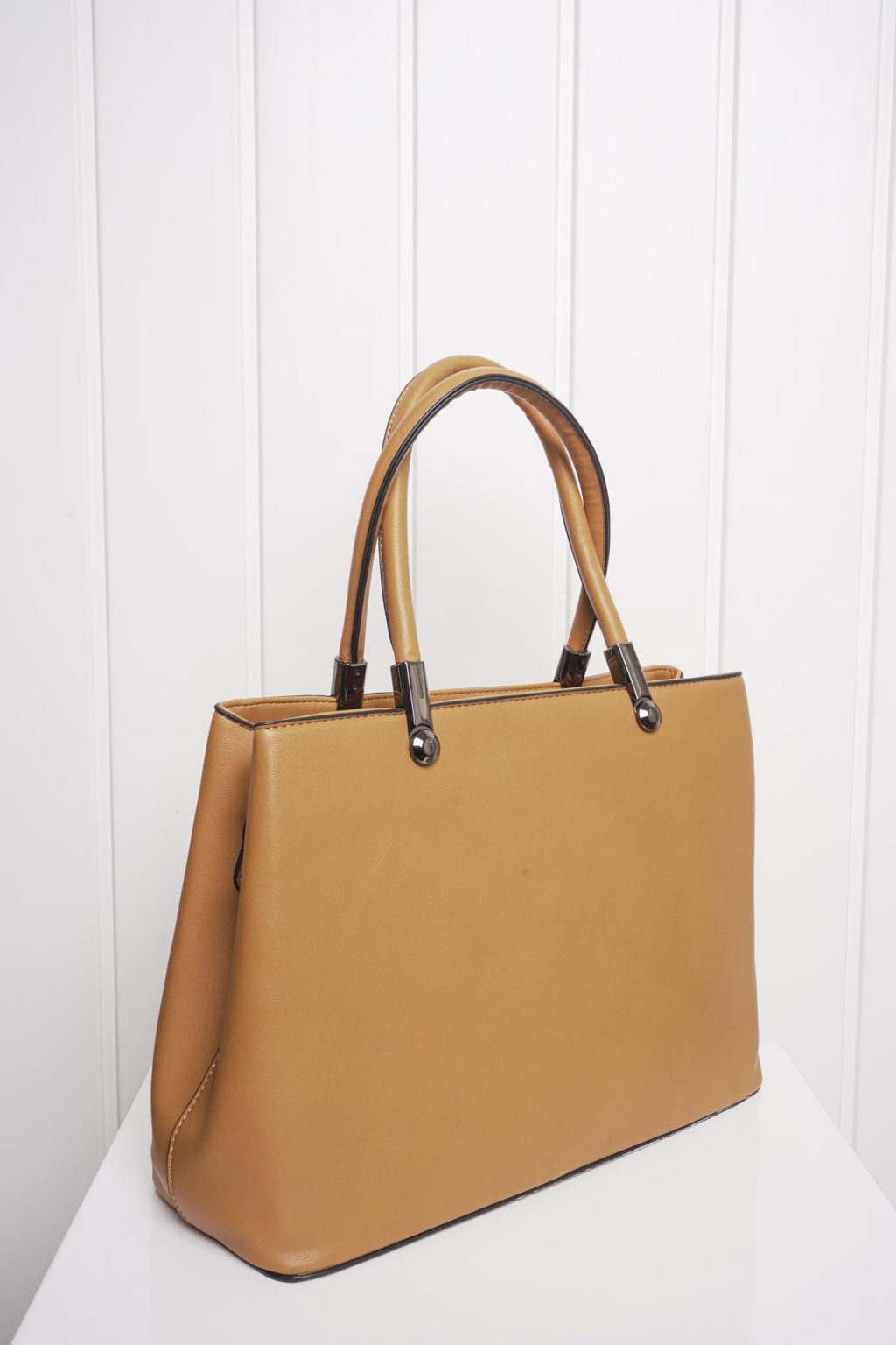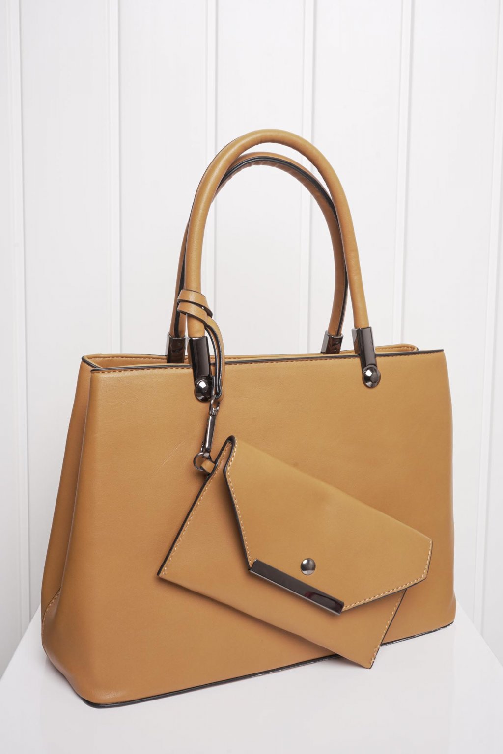 Svetlohnedá kabelka s kovovými kovaniami na rúčkach. Odopínateľná kapsička ako prívesok. Obsahuje vnútorné priehradky.
