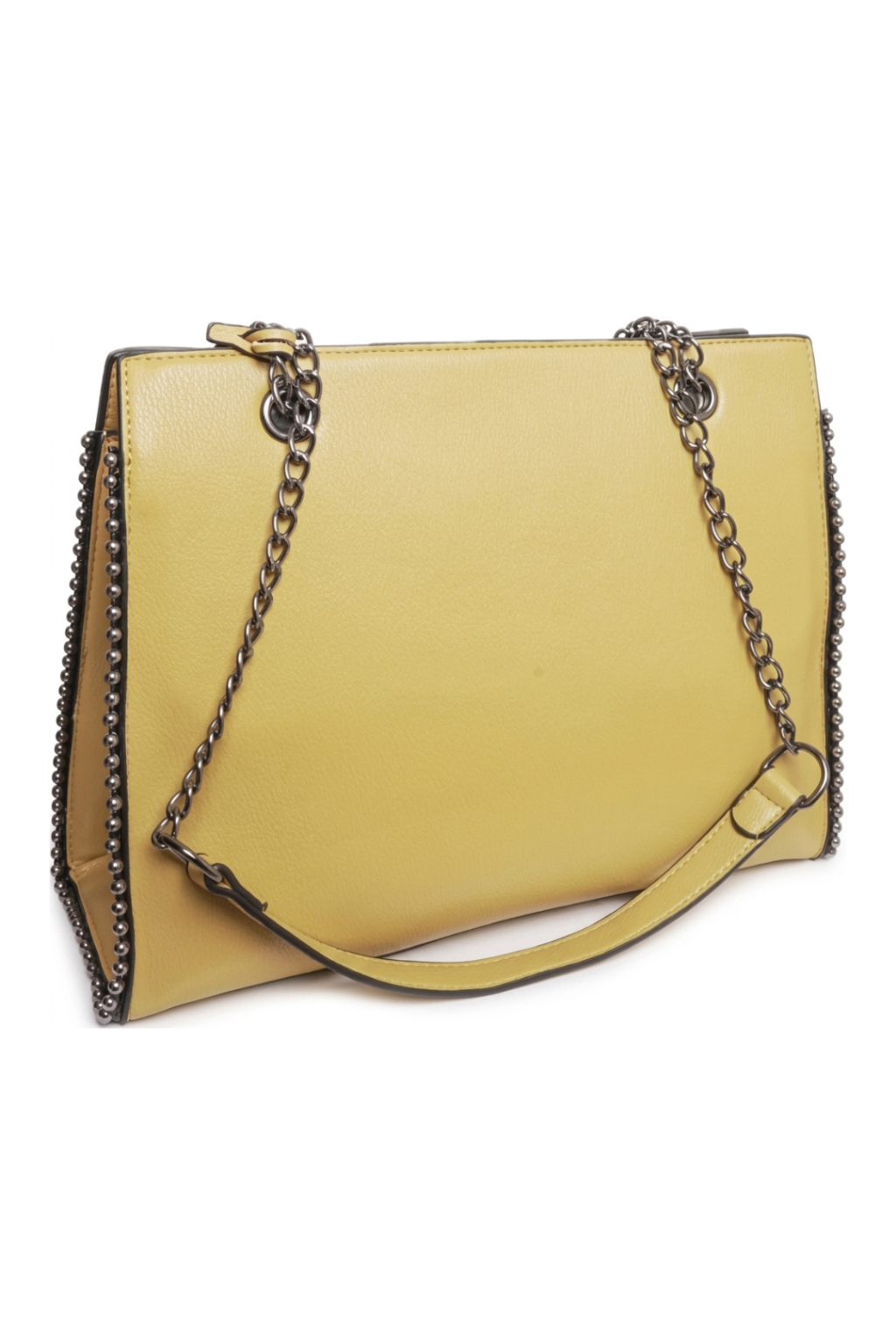 Horčicovožltá kabelka lemovaná kovovými guličkami s predĺženými rúčkami, kovovým príveskom a priehradkami vo vnútri.
