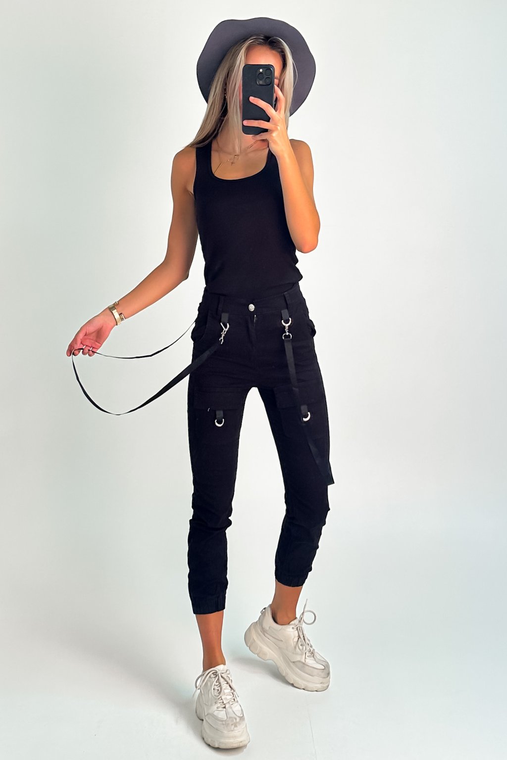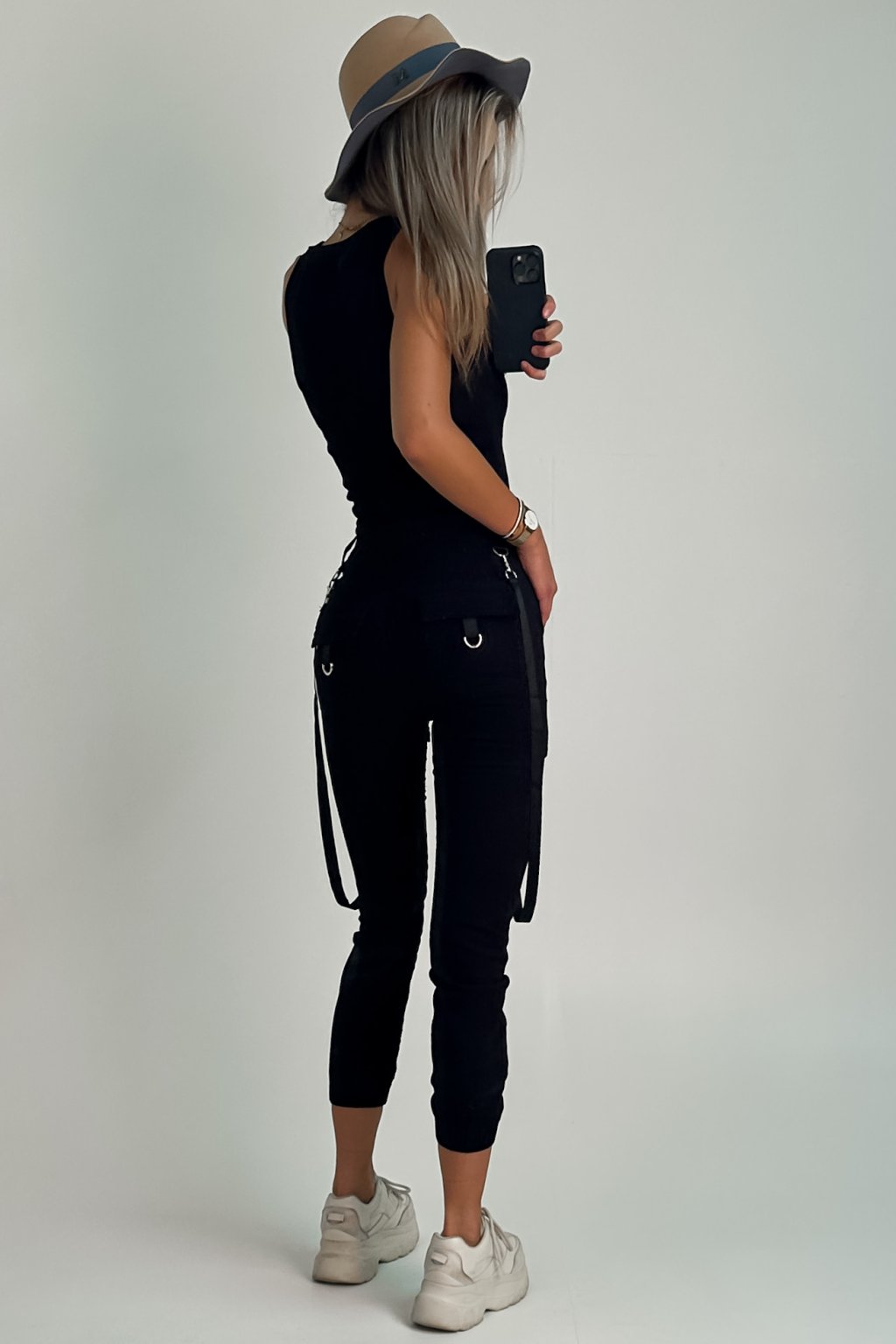 Kapsačové nohavice s vysokým pásom ukončené gumičkou.