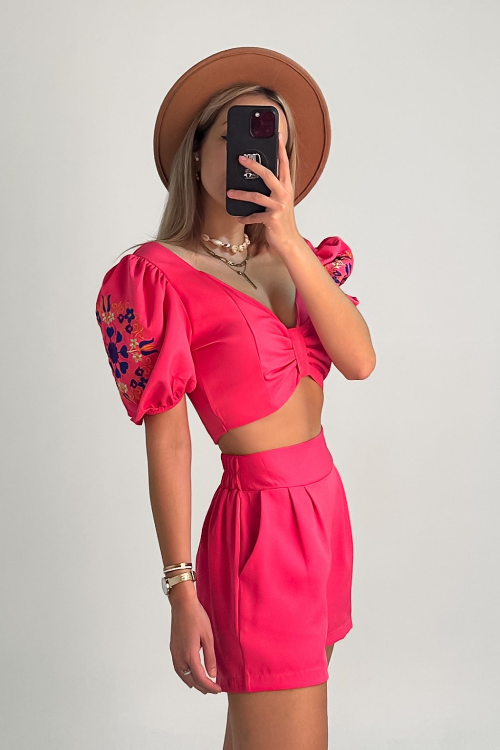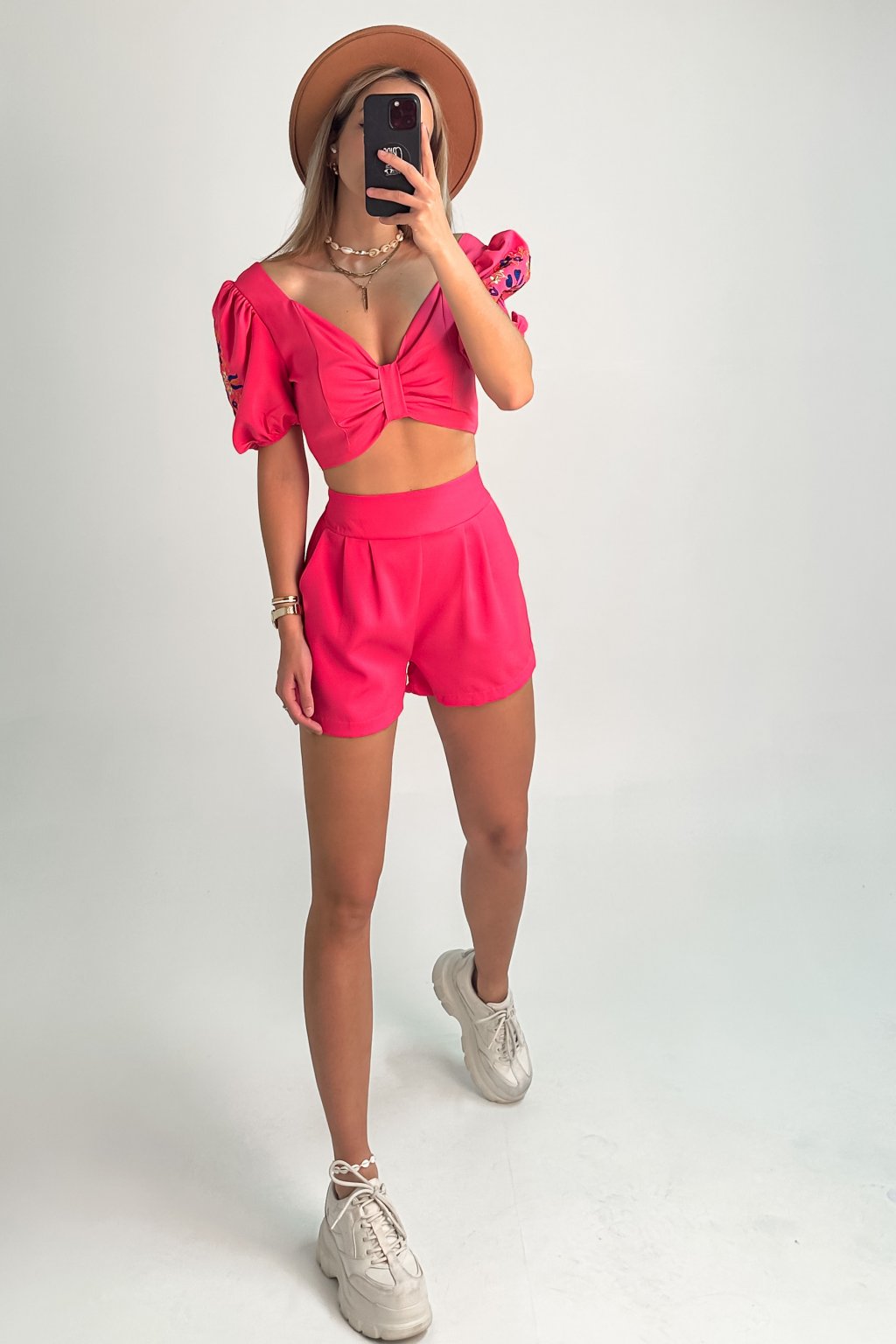 Komplet šórtiek a crop-topu. Crop-top zdobia puff rukávy a výšivka s tvarujúcim výstrihom a s gumou na zadnej strane čo docieli maximálne pohodlie. Šórtky su taktiež s gumou na zadnej strane a s vreckami.