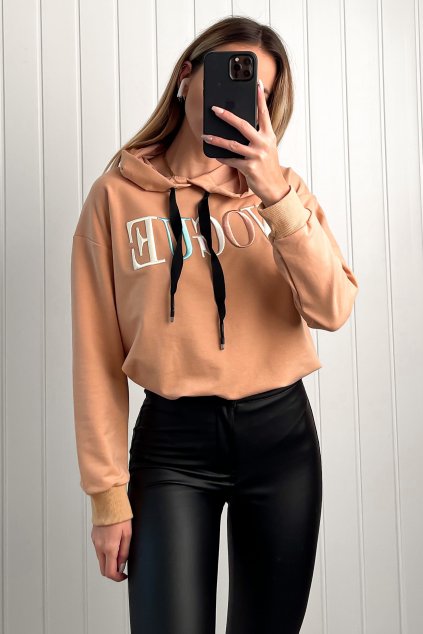 Elastický crop-top je obopnutý na postave s tvarovaným dekoltom a ukončený cípom.