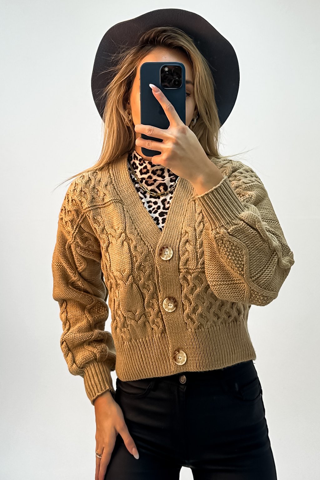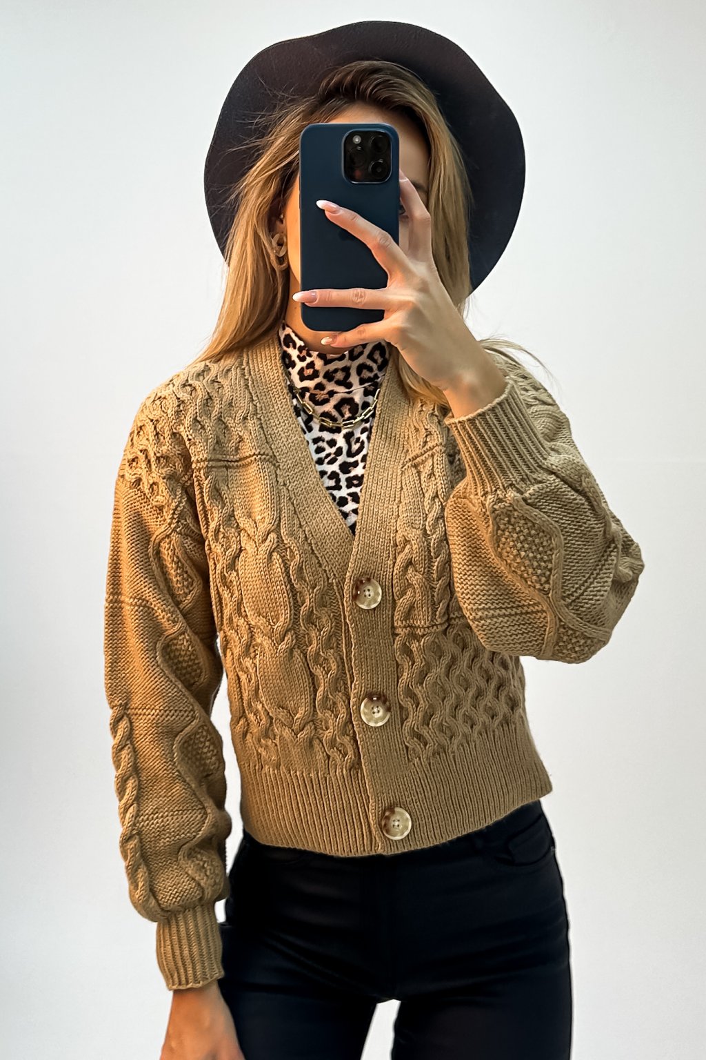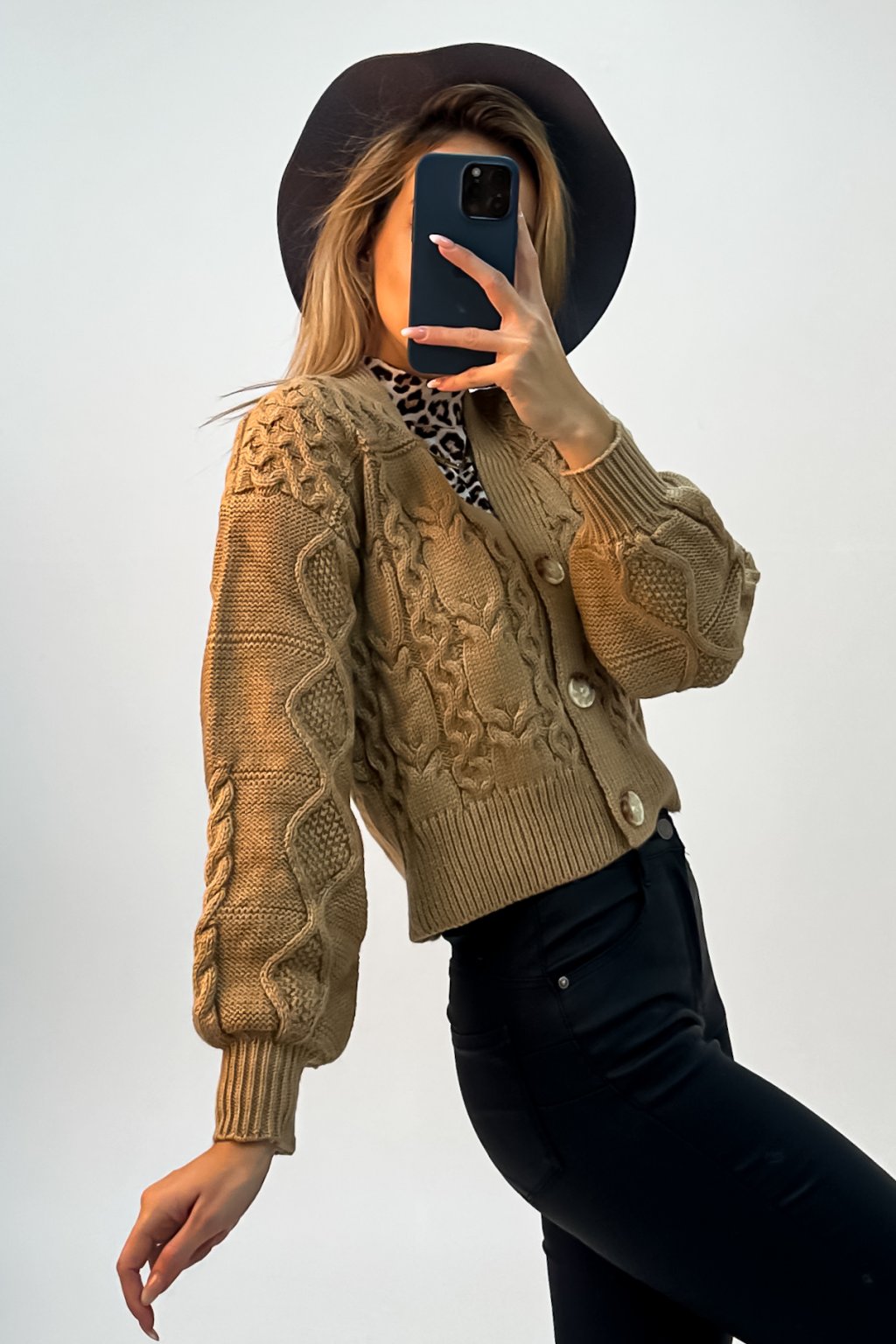 Skrátený sveter zo vzorovaného úpletu so zapínaním na gombíky a puff rukávmi.