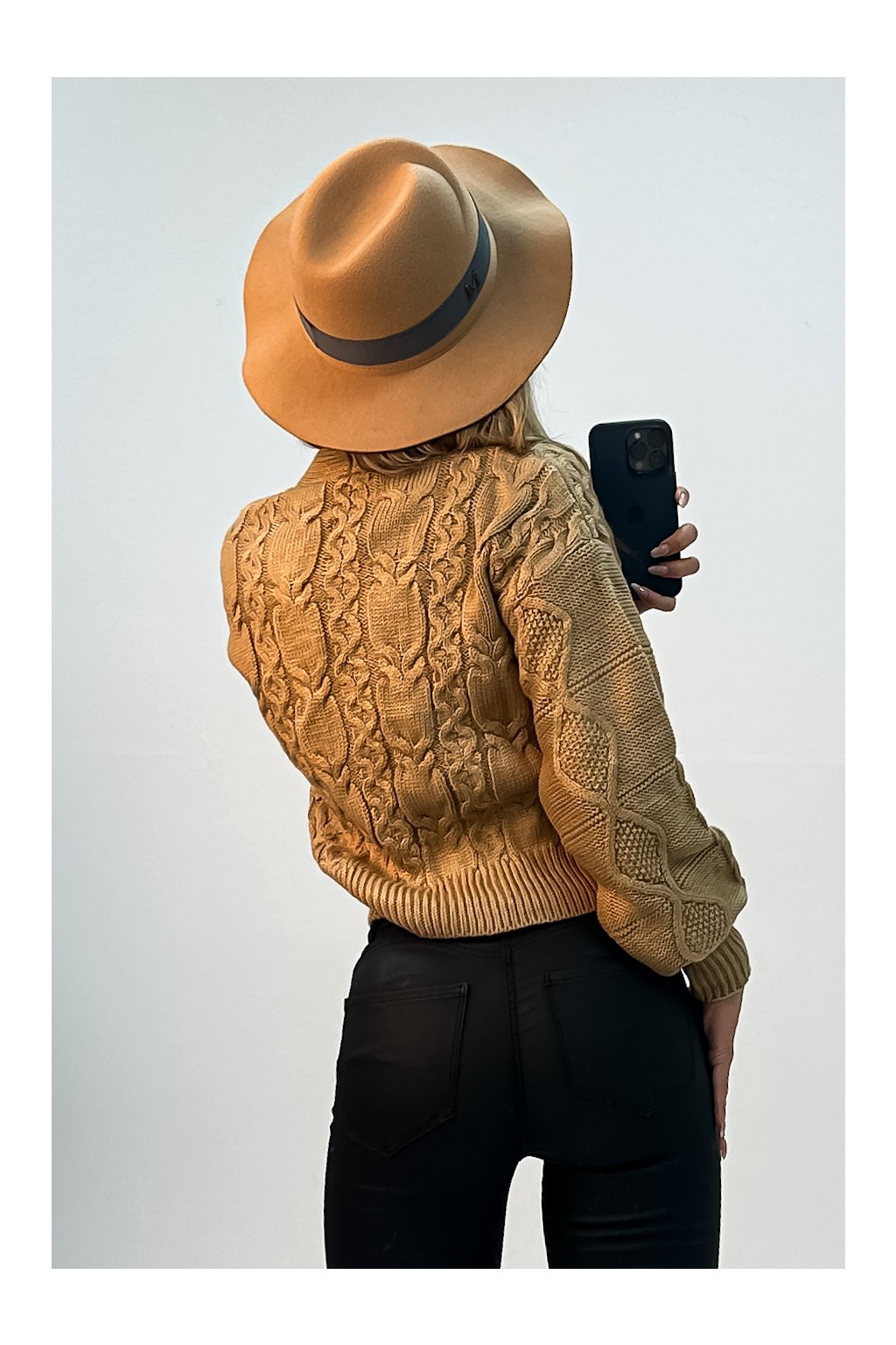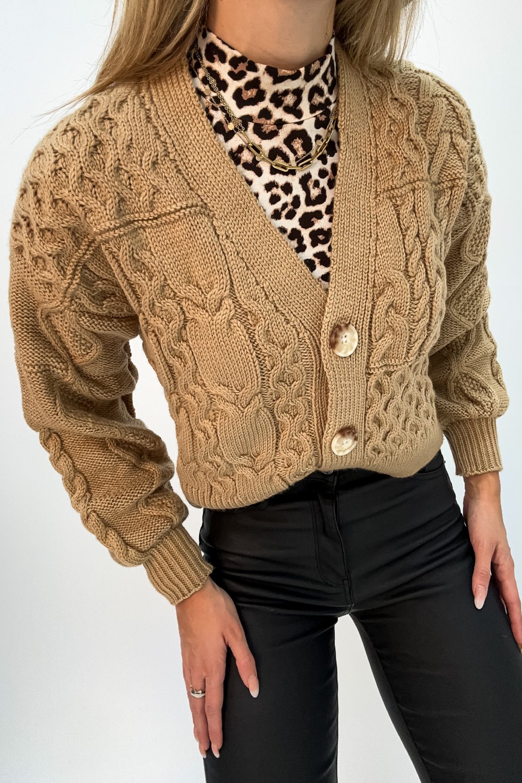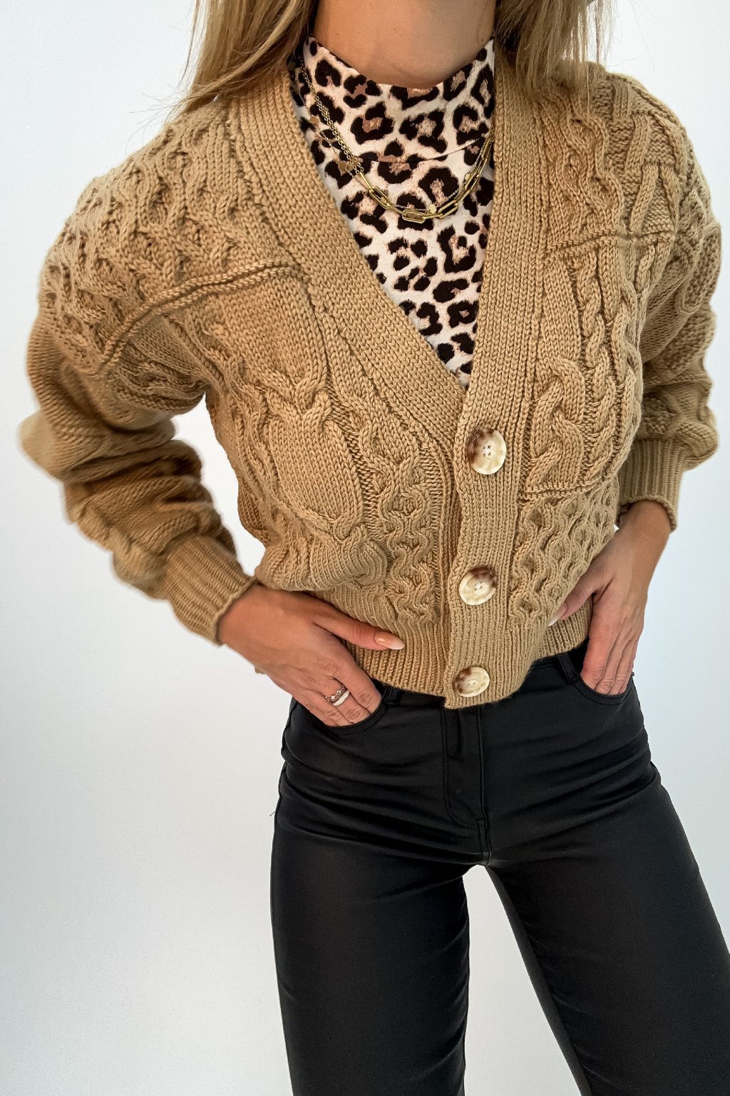 Skrátený sveter zo vzorovaného úpletu so zapínaním na gombíky a puff rukávmi.