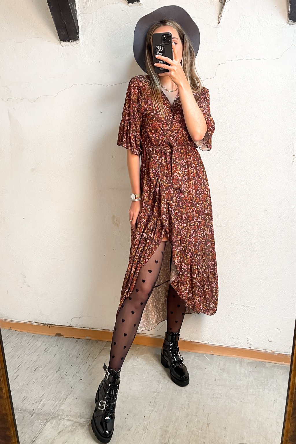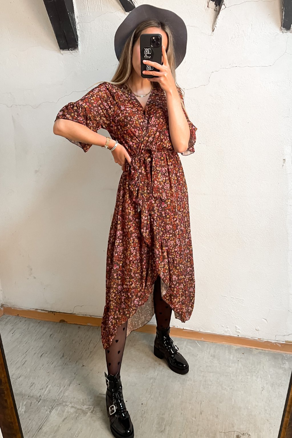 Kvetinové šaty v asymetrickom strihu s gumou v drieku s opaskom a volánovými rukávmi.